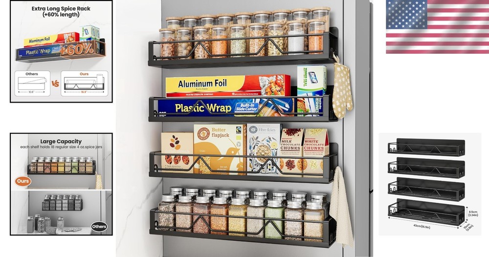 Magnetic Spice Rack 4 Pack - 16.9 Inch Wide, Rust & Dust Resistant Metal Shelves ‹ › ‹ › ‹ › ‹ › ‹ › ‹ › ‹ › ‹ › ‹ › Magnetic Spice Rack - 4 Pack Your kitchen deserves the best in convenience and elegance, and our Magnetic Spice Rack is here to elevate your culinary experience. Features: Wider Design: Each shelf boasts a double storage capacity, making organization effortless and stylish. Magnetically Strong: Forget about cumbersome mounting or assembly – each shelf provides reliability without the fuss, holding up to 11 lbs. Sturdy Material: Crafted from high-quality metal, these shelves are designed to be waterproof and rust-proof, ensuring longevity and durability. Moveable: Adjust the distance between shelves according to your needs, allowing for a custom fit that accommodates all your spice jars with ease. Package Includes: Each set comes with 4 large magnetic shelves and a user-friendly instruction manual. Benefits: Maximize your kitchen space with stylish storage solutions. Enjoy the convenience of easy access to your spices and condiments, right where you need them. Effortless installation and removal – no tools required! Enhance your kitchen decor with sleek and modern metal design. Versatile placement on any metal surface, offering flexibility in your kitchen organization. Why Choose Our Magnetic Spice Rack? Elevate your culinary space with our Magnetic Spice Rack set, designed for the modern kitchen. With double the storage capacity and effortless installation, you can transform cluttered counters into organized, beautiful displays. Whether you’re an aspiring chef or a busy homemaker, this essential storage solution not only offers practicality but also enhances the aesthetic of your kitchen. Make the smart choice for your kitchen organization and enjoy the beauty of a tidy space. Order your Magnetic Spice Rack today! Shipping Free & Fast Shipping - We offer free shipping to most of the USA with a normal delivery time of 3-7 days. However, due to the current situation, additional delivery time (up to 3 weeks) may be required for some items. Alternative Carriers - We may use alternative carriers (e.g. USPS, FedEx, UPS, etc.) to ensure your package arrives safely and on time. Due to the use of multiple carriers, we are unable to provide a tracking number automatically. Handling Time - Orders are processed and shipped within 1-2 business days of receiving cleared payment. Shipping Restrictions - Shipping to Alaska, Hawaii, Puerto Rico, Guam, and other US territories may incur shipping charges or delivery restrictions. Please contact us before ordering, or your order can be refunded/cancelled. State Restrictions - There may be restrictions based on your state of purchase. For example, certain items may not be shipped to California due to state regulations. Contact for Tracking Updates - If you require tracking updates or have any concerns about the delivery of your order, please feel free to contact us, and we will be happy to assist you. Return 30-Day Hassle-Free Returns - We want you to be completely satisfied with your purchase. If you are not, you can return the item within 30 days of receiving it for a full refund or exchange. Easy Return Process - To start a return, simply contact us and we will provide you with a prepaid return shipping label and detailed instructions. Restocking Fee - There are no restocking fees for returns. However, the buyer is responsible for return shipping costs if the return is not due to a seller's error. Refund Processing Time - Refunds will be processed within 5 business days of receiving the returned item in its condition. Payment We accept all major credit cards, PayPal, and Apple Pay for your convenience. Your payment information is secure and encrypted to ensure a safe and seamless transaction. Please complete your payment within 3 days of purchase to avoid any delays in shipping. Feedback Your feedback is extremely important to us. We strive to provide the best products and customer service possible. If you are satisfied with your purchase, please take a moment to leave us a positive review. If you have any concerns or issues with your order, please contact us before leaving negative feedback. We are committed to resolving any problems and ensuring your satisfaction. Contact Us If you have any questions or concerns, please feel free to out to our customer support team. You can contact us through the eBay messaging system. We are available Monday to Friday, 9:00 am to 5:00 pm EST, and we will do our best to respond to your inquiry within 24 hours. Buy it now and enjoy a pleasant shopping experience! Unit Quantity: 1.0 count Material: Metal Mounting: Magnetic Features: Detachable,Dust Resistant,Rust Resistant,Washable Set Includes: Add-On Units Item Height: 3.34 Inches Item Length: Magnetic Spice Rack Item Width: Magnetic Spice Rack Type: Spice Rack Color: Matt Black Number of Shelves: 4 Number of Compartments: 4 Number of Jars Included: 4 Number of Tiers: 4 Style: Modern Shape: Rectangular Item Depth: 3.9 in Item Weight: 3.35 kilograms