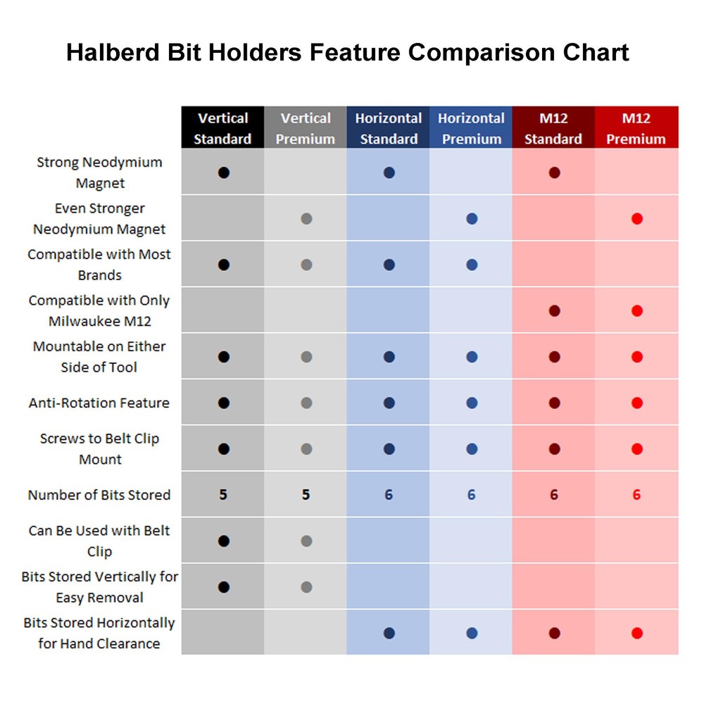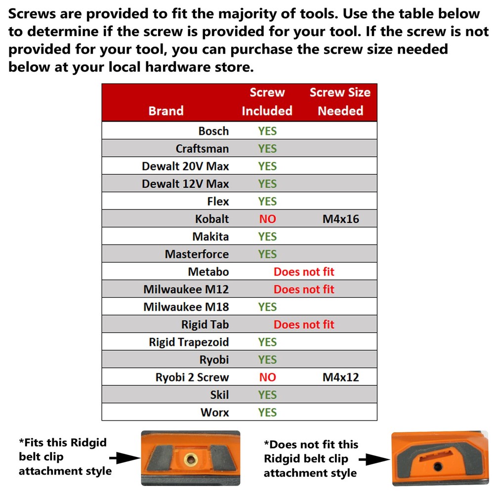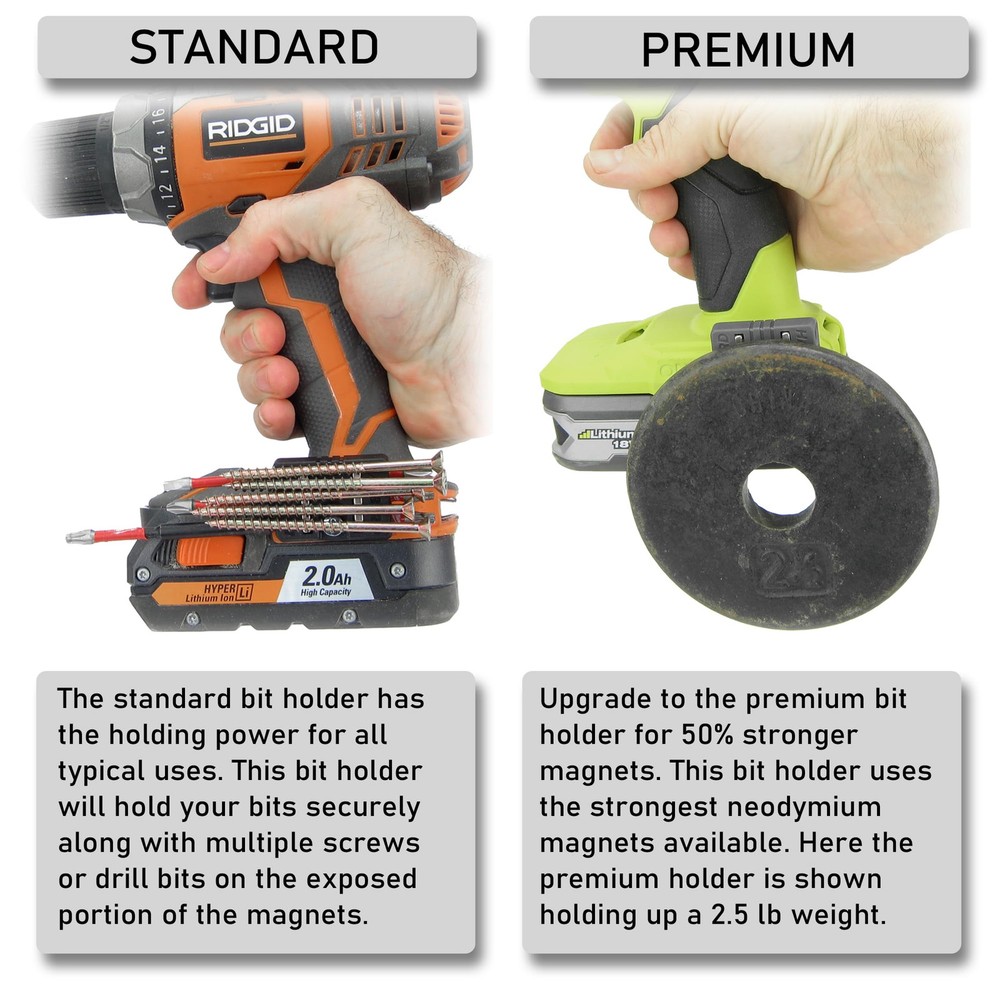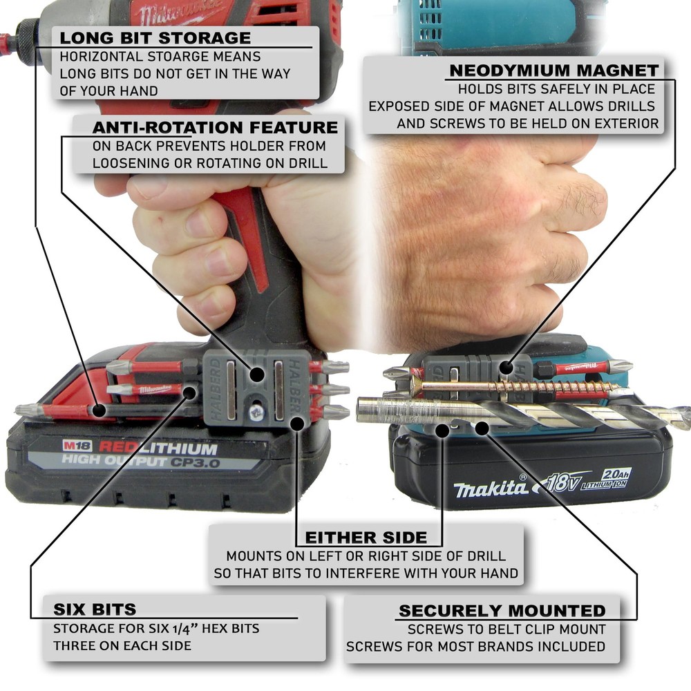 ๐๐๐๐ฉ ๐ฒ๐จ๐ฎ๐ซ ๐๐ข๐ญ๐ฌ ๐จ๐ง ๐ฒ๐จ๐ฎ๐ซ ๐ญ๐จ๐จ๐ฅ ๐ฐ๐ก๐๐ซ๐ ๐ฒ๐จ๐ฎ ๐ง๐๐๐ ๐ญ๐ก๐๐ฆ - Keep up to six of your 1/4" bits stored right on your driver or drill. Bits are firmly held in place by a super strong neodymium magnet. ๐๐ข๐ญ๐ฌ ๐๐ญ๐จ๐ซ๐๐ ๐๐ฐ๐๐ฒ ๐๐ซ๐จ๐ฆ ๐๐จ๐ฎ๐ซ ๐๐๐ง๐โ The horizontal bit storage design keeps the bits stored securely and conveniently out of the way of your hand. The bits wonโt get in your way when you are grabbing your tool. Bit holder can be mounted on the left or right side of your driver. ๐๐ฑ๐ฉ๐จ๐ฌ๐๐ ๐ฆ๐๐ ๐ง๐๐ญ ๐ก๐จ๐ฅ๐๐ฌ ๐๐ฑ๐ญ๐ซ๐ ๐ฌ๐๐ซ๐๐ฐ๐ฌ - Don't drop screws or hold them in your mouth. The exposed magnet on the side will securely hold your loose screws or drill bits while you are working. ๐๐ญ๐ญ๐๐๐ก๐๐ฌ ๐ฌ๐๐๐ฎ๐ซ๐๐ฅ๐ฒ - Screw to your tool using the belt clip mounting screw location. Integrated anti-rotation feature locks the bit holder in place preventing moving or loosening while in use. Improved design holds magnet securely in place in the bit holder. ๐๐ซ๐๐ฆ๐ข๐ฎ๐ฆ ๐ฏ๐ฌ ๐๐ญ๐๐ง๐๐๐ซ๐ - The standard bit holder comes with a very strong neodymium magnet that is sufficient for all uses. If you wish the extra assurance, the premium version upgrades the magnet to the strongest neodymium magnet available. ๐ ๐ข๐ญ๐ฌ - Milwaukee M18, Dewalt, Bosch, Ryobi, Makita, Craftsman, Flex, Kobalt, some Ridgid drills and drivers and more. See pictures for specific fitments. ๐๐ญ๐๐ฆ๐ฌ ๐ข๐ง๐๐ฅ๐ฎ๐๐๐ - Includes Two Bit holders and two of each screw needed for most tools.