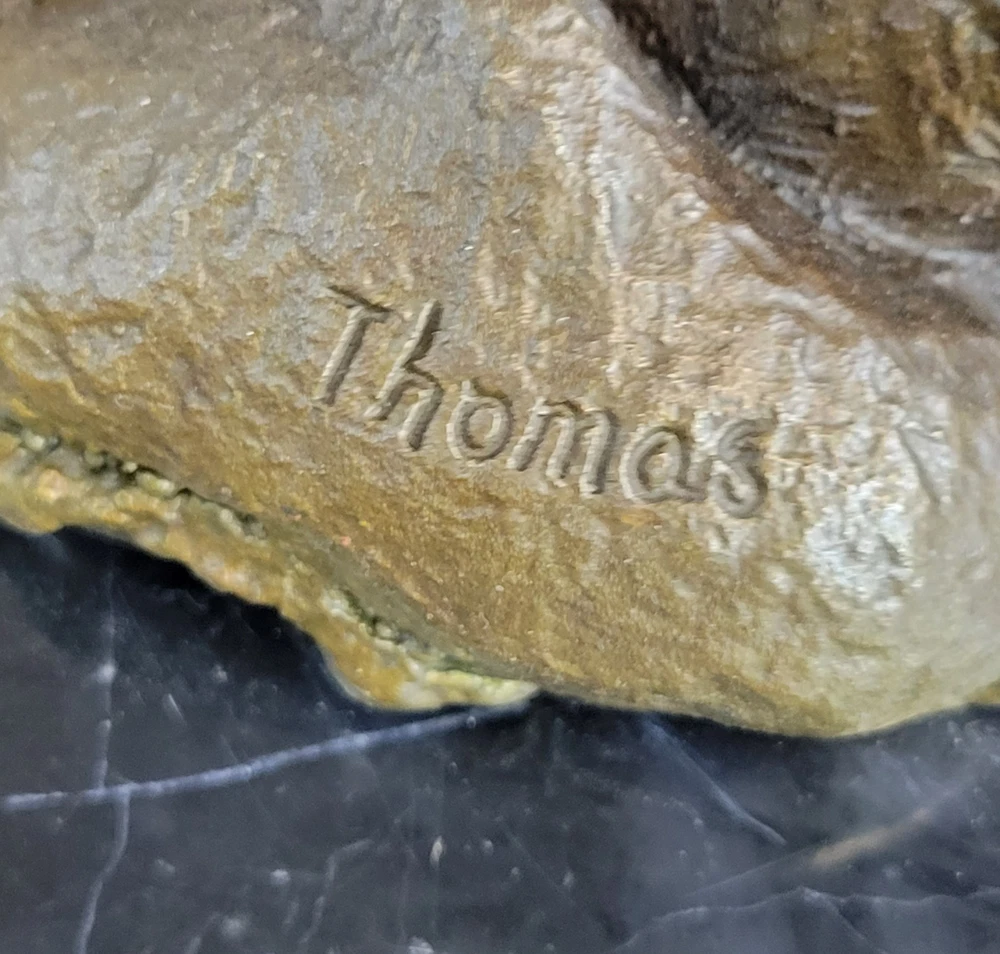 Condition : This sculpture is in perfect condition. Bronze Dimensions with Marble Base: Height 16" X Width 8" Marble Dimensions: Diameter 8" Height without base:15" Weight:10 LBS Inventory:27X24684972 Witness the struggle for survival captured in exquisite bronze artistry with this poignant sculpture. Depicting a man's determination as he fishes with a simple stick, this artwork portrays the resilience of human spirit in the face of adversity. The man's attire, complete with a protective hat and a small bag, underscores his resourcefulness and his battle against the elements while navigating the challenging river. Crafted using the age-old method of lost-wax casting, this sculpture embodies the artist's commitment to preserving the intricate details of the scene. The brown patina finish not only enhances the sculpture's aesthetic appeal but also adds a touch of timelessness to the narrative it conveys. Resting on a sturdy black marble base, this artwork stands as a testament to human fortitude and the enduring power of art to capture the essence of human experience. Signed by the artist Thomas, this bronze sculpture invites viewers to contemplate the struggles and triumphs that define our existence. Whether displayed in a collection or as a standalone piece, it serves as a reminder of the resilience within us all and the stories that art can uniquely convey. Signed Original English Thomas Fisherman Fish Bronze Sculpture Statue Figurine www.bronzhaus.com Video will open in a new window Using the eBay App? Paste link into a browser window: [isdntekvideo]