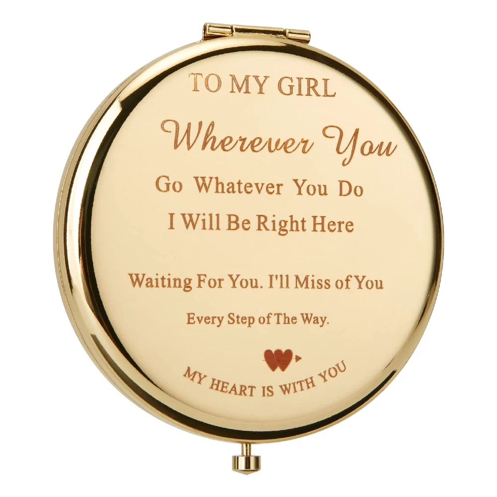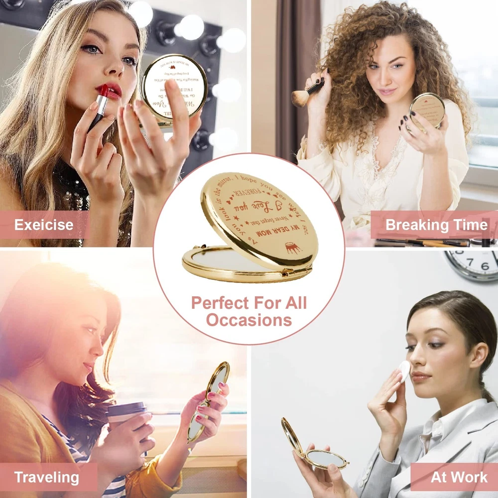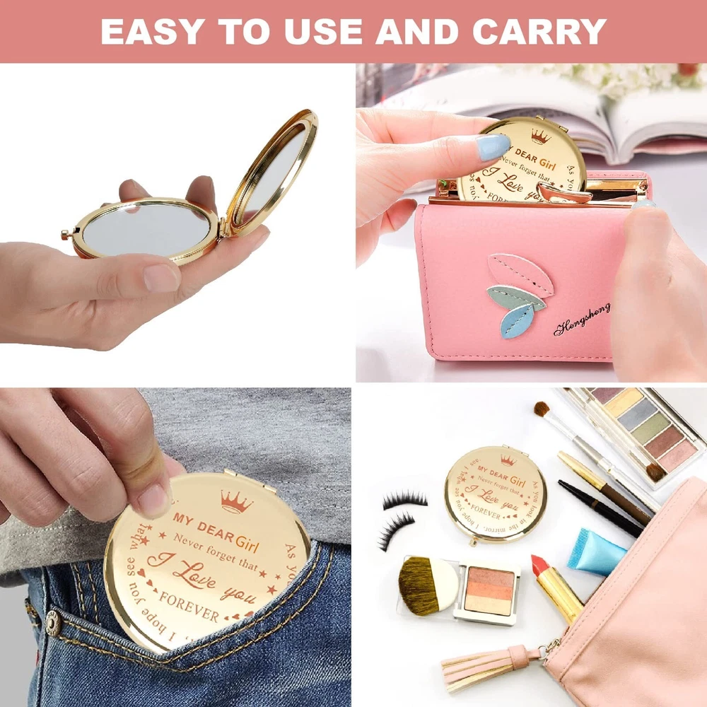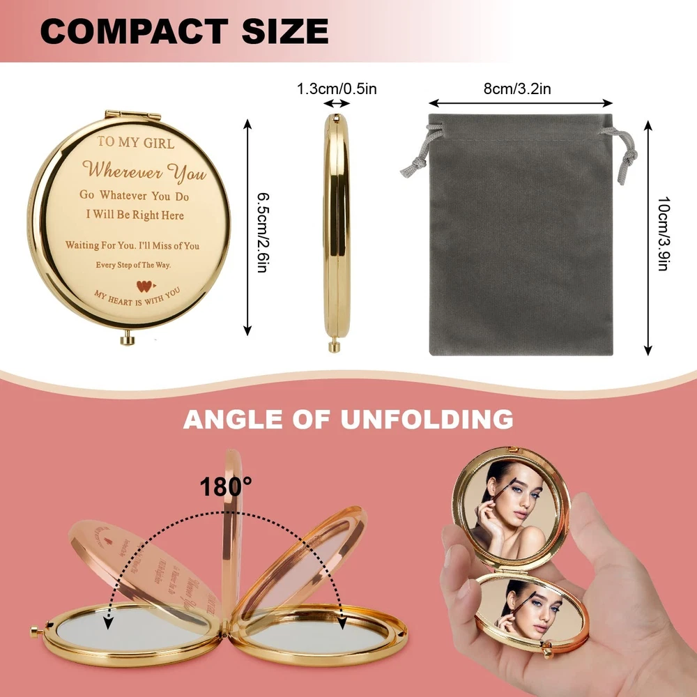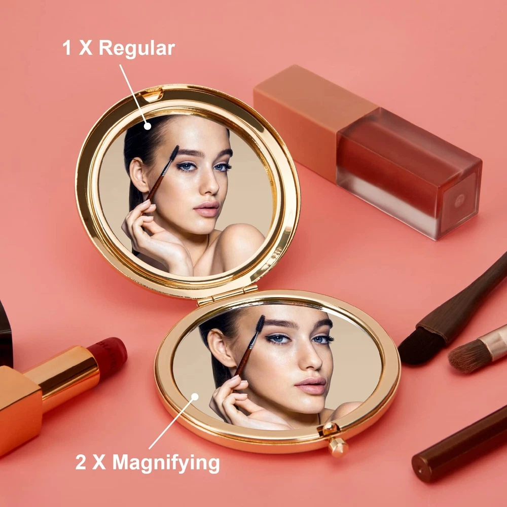 Magnifying Compact Mirror for Purses with 2 x 1x Magnification, Folding Mini Pocket Double Sided Travel Makeup Mirror,Perfect for Purse,Gifts for Girls Product Details Color: To Girl Brand: MIHAGUTY MPN: MIrror 34 UPC: Does not apply EAN: Does not apply Brand: MIHAGUTY Shape: Round Product Dimensions: 2.8"L x 2.8"W Frame Material: Glass, Stainless Steel Mounting Type: Tabletop Mount Brand: MIHAGUTY Shape: Round Product Dimensions: 2.8"L x 2.8"W Frame Material: Glass, Stainless Steel Mounting Type: Tabletop Mount Finish Type: Polished,Stainless Steel Special Feature: Portable, Foldable, Magnifying Color: To Girl Theme: Christmas,Graduation,Thanksgiving Number of Pieces: 2 Number of Items: 1 Material: alloy/metal+glass Frame Type: Framed Item Weight: 0.2 Pounds Assembly Required: No Manufacturer: WYJ Item Weight: 3.2 ounces Country of Origin: China Item model number: MIrror 34 Date First Available: September 6, 2022 Great Gift to Girls: Premium quality and charming outlook make this mirror a unique gift for women of all ages; perfect for birthday, Anniversaries,graduation, Christmas, and Thanksgiving. Gold Compact Mirror : Makeup Mirror for Purses and Travel. Foldable design, easy to take it in your pocket or handbag. Double-Sided: Two-sided folding mirror, One polished glass and 1X & 2X Magnification,take care of every beauty detail. High-Quality: The mirror and the frame are all made of premium stainless steel +glass; its durable and unbreakable in daily usage. HD View : This compact mirror is Larger view than most compact mirrors, making it easier to apply makeup for you.