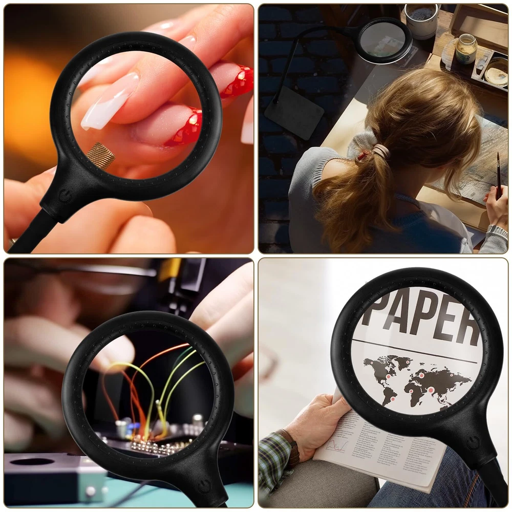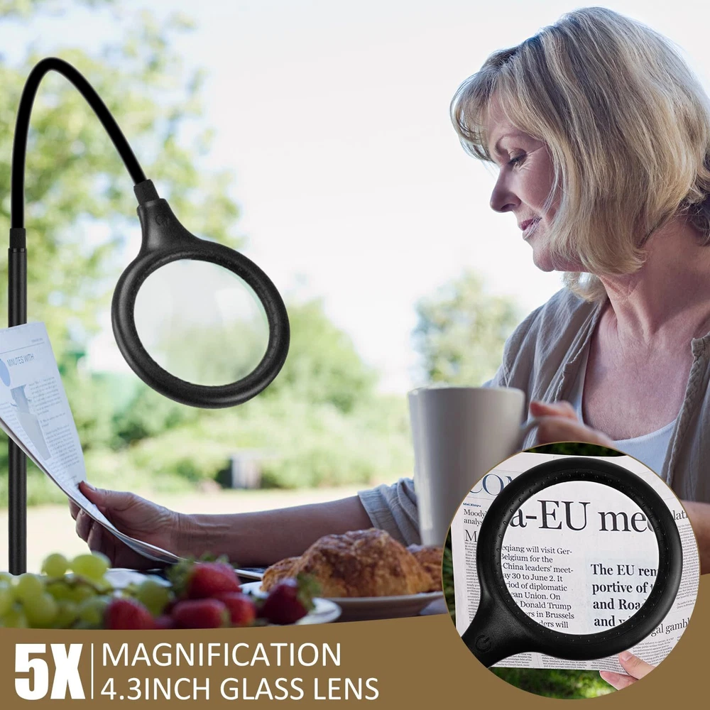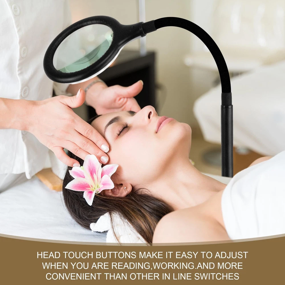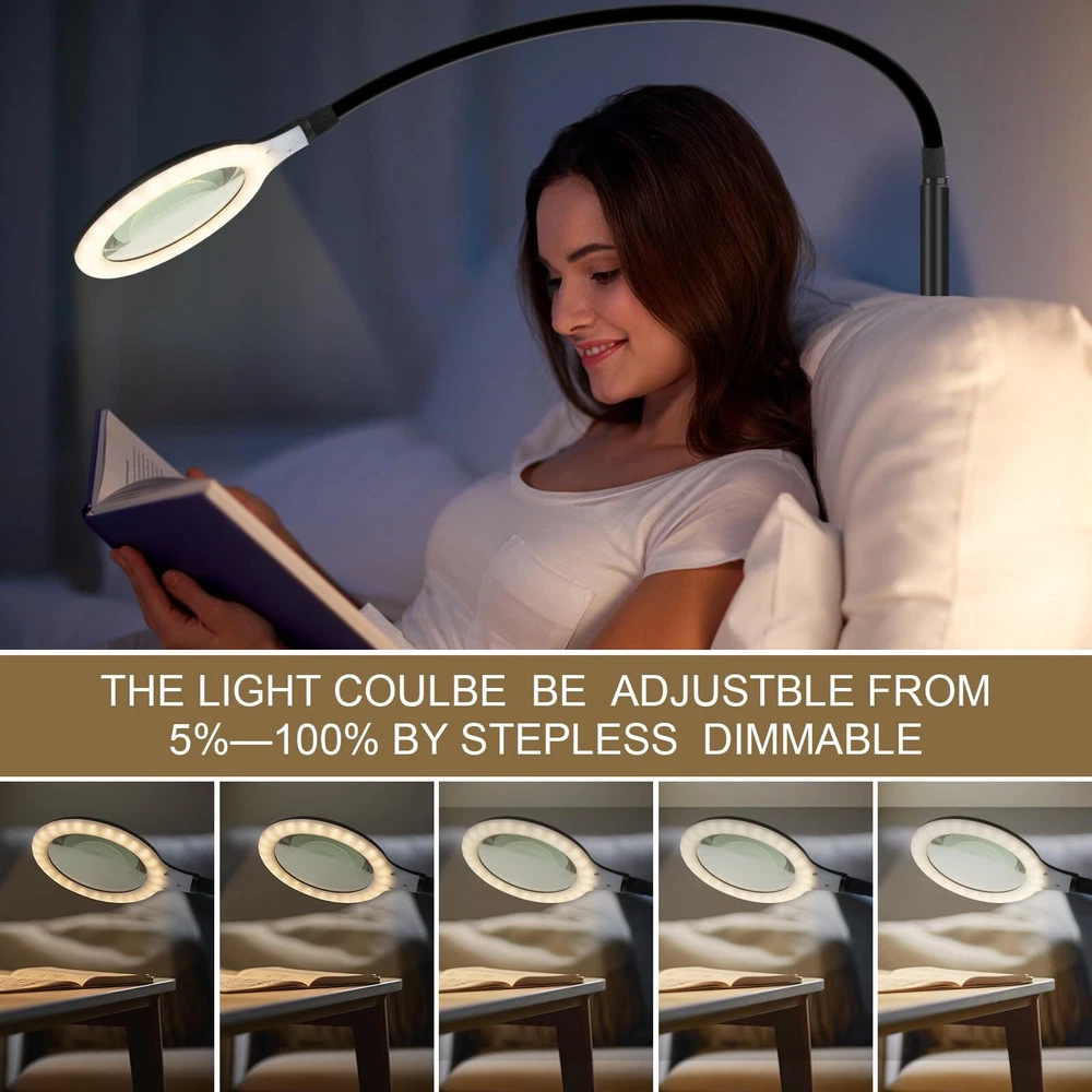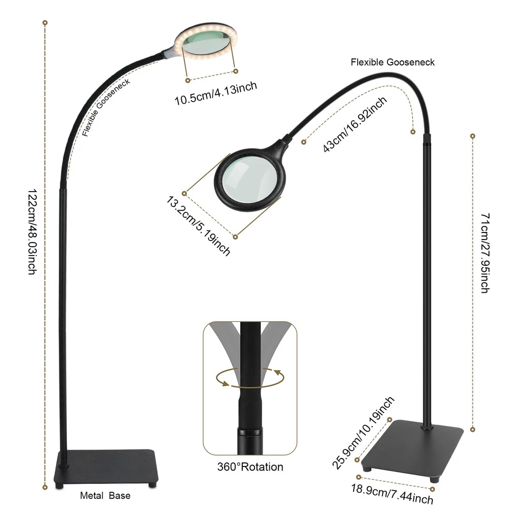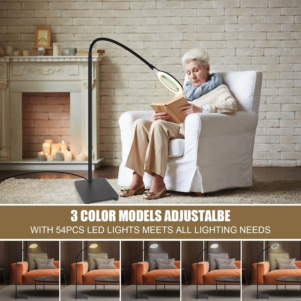 Touched Button on the floor Lamp Head: It is useful and friendly for the elderly and people with low vision and macular degeneration, you can set the light model directly at the head of the magnifying floor lamp, it easy to switch modes without bending down to find the power line control switch. 3 Color Modes & 0%-100% Stepless Dimmable: Magnifying floor lamp with light support 3 dimming modes and 0%-100% brightness stepless dimmable. when you touch the switch,the power on warm color model ,Touch again , the power on cooling color model;Touch in third time, the power on warm and cooling color model; long press the touch switch,it could adjust the brightness from 0% to 100% ,you could adjust the brightness again to fit your eyes .Finally touch, the power is off . 5x Optical Glass, Heavy Base: This lighted magnifying glass use high-quality 4.33-inch optical glass for excellent 5x magnification without smudging and blurring on the image. The super heavy base secures the lens so you can adjust the angle as you like it for your convenience. Versatile, Adjustable & Stays Cool to The Touch: The desk magnifying glass with light is fully adjustable with a 16.8 inch flexible gooseneck. Touch the button to adjust the light color model and the brightness,this lighting is perfect for crossword puzzles,needlework, knitting,crocheting,cross stitch,beading, arts, crafts, repairing electronics, woodwork,jewelry making,Meet your needs for different color model brightness and different occasions. 54pcs Led light:Long-lasting, 27pcs warm light and 27pcs cooling light offer better brilliance and truer color,3 color model settings ranging from warm white to daylight age eyes. 16.8" Super Long high-quality gooseneck has a 360°swing and can maintain a stable height.it 's very flexible and frees up your hands, etc. If you are not satisfied with your purchase , please DO NOT hesitate to ask us.