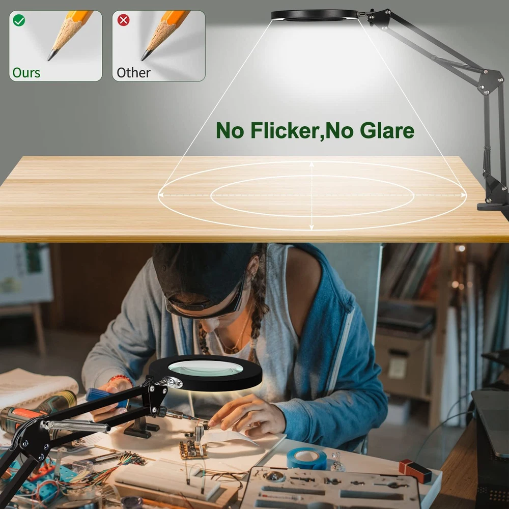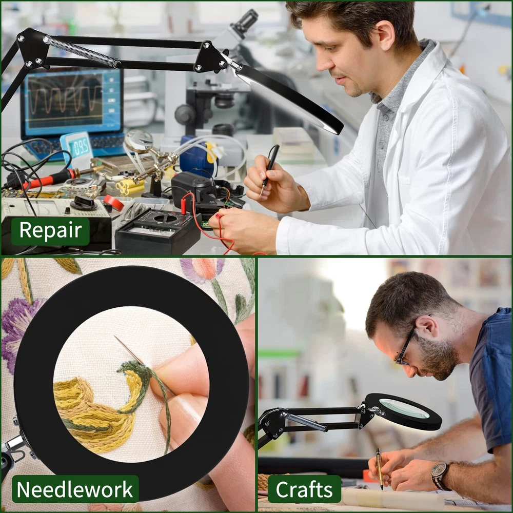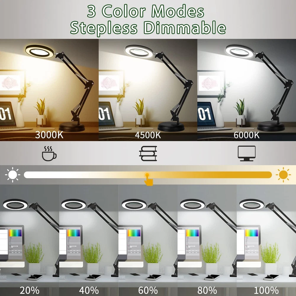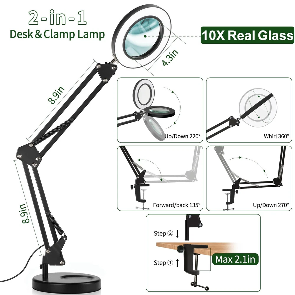【10x Magnification & Real Glass Lens】LED magnifying glass is professionally designed with a 4.3" real glass lens, which can provide a clear magnifying view without distortion. Up to 10x magnification makes reading/viewing small prints, sewing, repairing, carving, manicuring, soldering, etc easier. It is designed for people who need to work continuously at close range or who need visual aids. There is no dizziness even if use it for a long time. 【3 Color Modes & Adjustable Lighting 10-Levels 】Magnifier with light has 72pcs high-brightness LED lamp beads with an up of 12W &1200 lumens. It's designed with 3 color modes (white, warm, and cool) and stepless dimmable, you can easily adjust the brightness level between 10% and 100%, and choose the most appropriate light source for your environment. 【2-in-1 Desk Lamp & Clamp Light】Magnifying glass with light and stand come with a weighted base and clip. You can use the base as a table lamp, or mount it on any flat surface (maximum thickness <2.1") as a clip light. The clamp can be easily mounted on a desktop, shelf, or workbench without any tools, which not only saves space but also can be easily rotated to free up hands. 【Flexible Adjustment & Long Flexible Arms】The LED lighted magnifying glass has two connected metal swivel arms with 3 knobs and 4 springs, the long arms can extend up to 20 inches. 360-degree rotatable light head, which can project light in any direction to meet your needs. 【Eye Protection and Energy-Saving】Magnifying lamp adopt a ring design with 72pcs built-in high-brightness LED providing you with an even, soft light and a large area of illumination. Without glare and flicker, the uniform light also prevents eye fatigue and hurting. It's the perfect gift for people with low vision, the elderly and those who need to constantly focus on close work.