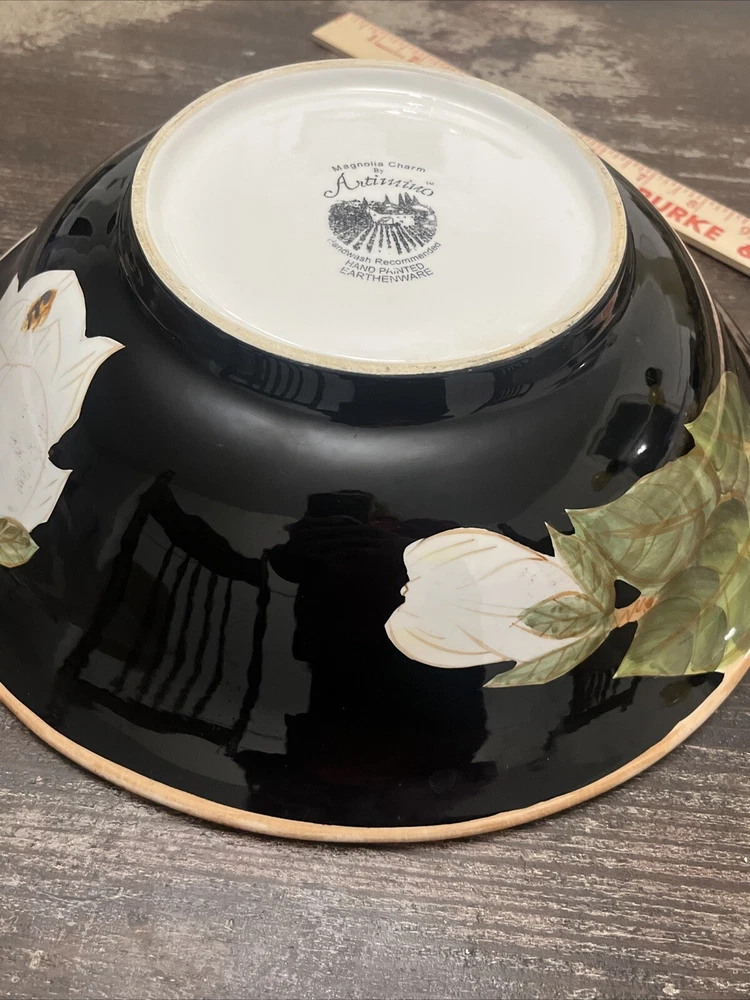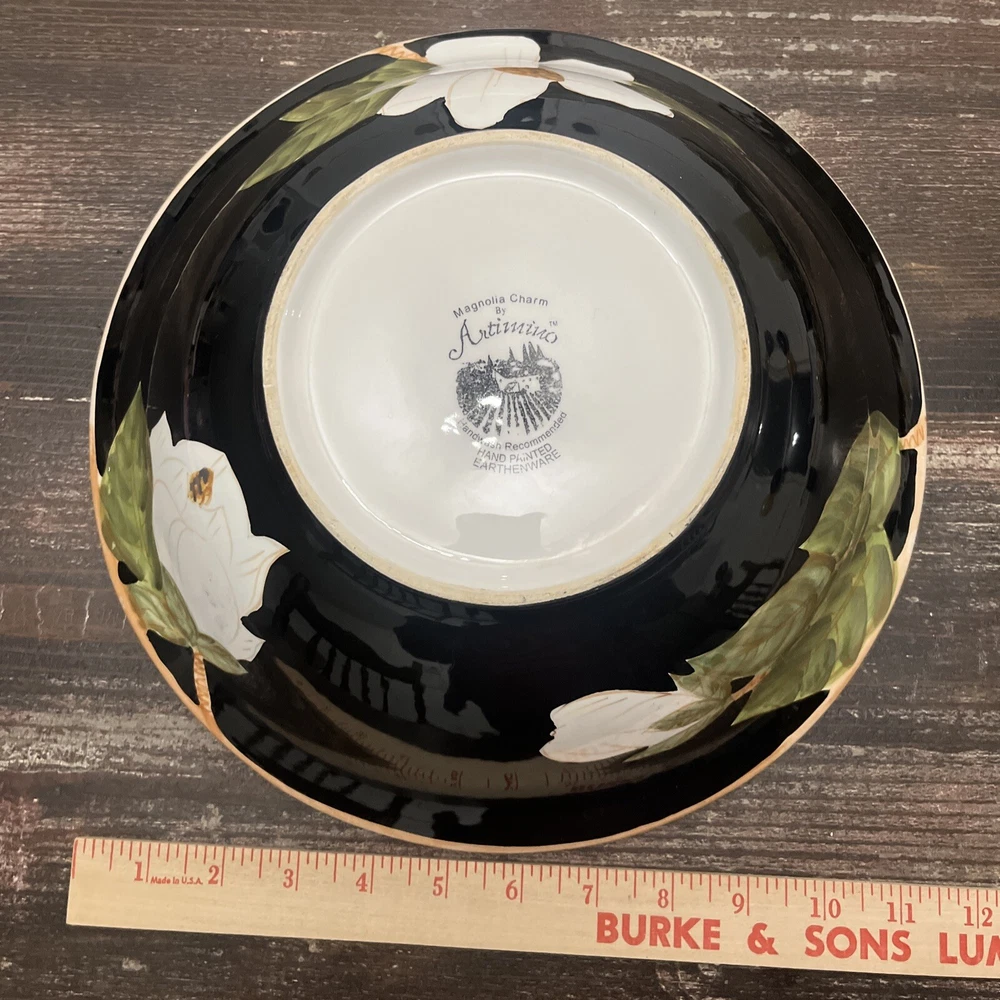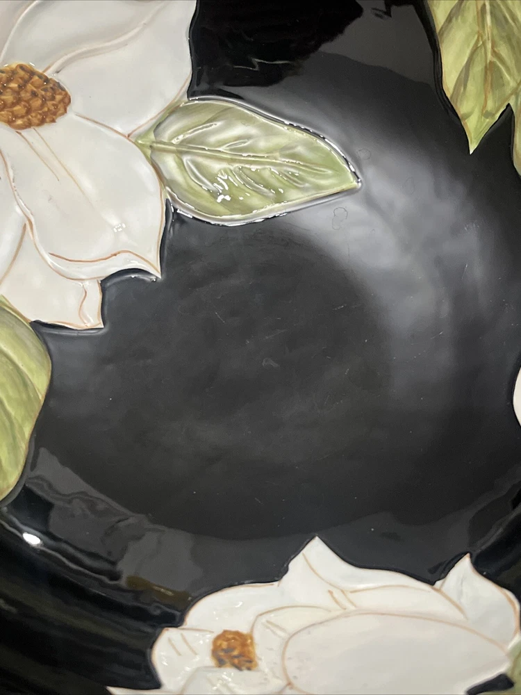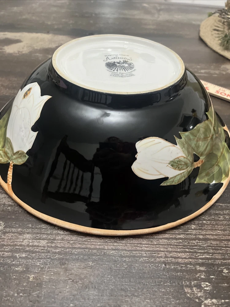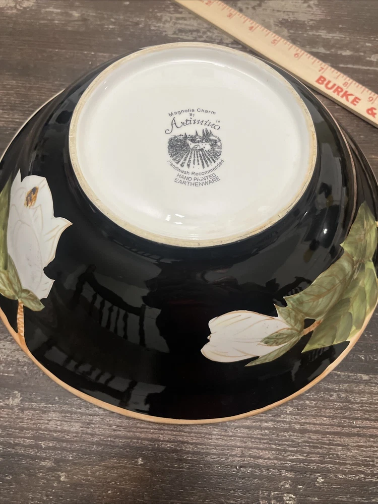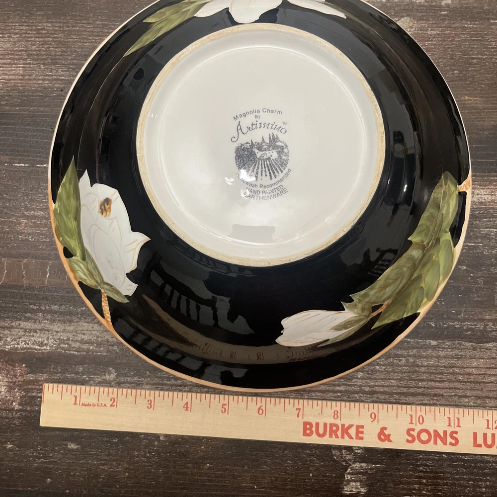 The "Magnolia Charm" serving bowl by Artimino features a beautiful hand-painted design of magnolias on a black stoneware material. This large round bowl measures 11.5 inches in length and width, making it suitable for various occasions and serving needs. The floral and garden theme adds a touch of elegance to any table setting, perfect for serving dishes in style. In nearly perfect used condition. No chips or cracks. Some signs of wear from use in the bottom of bowl if held to the light (very light minimum scratches).