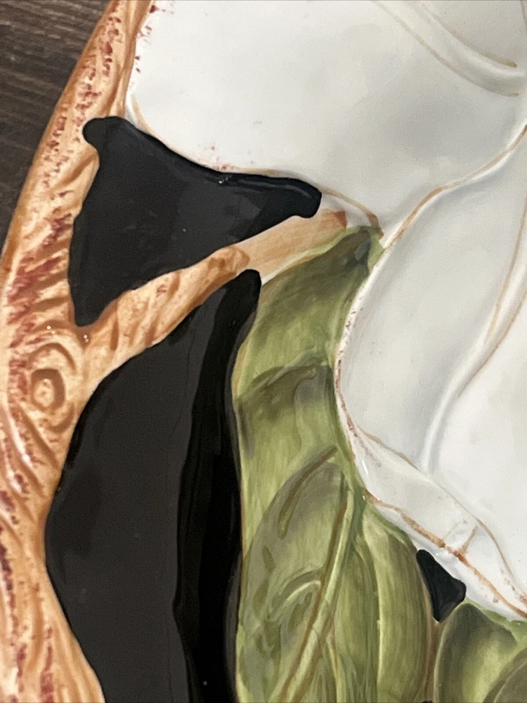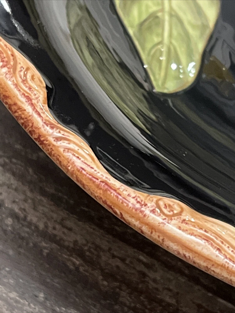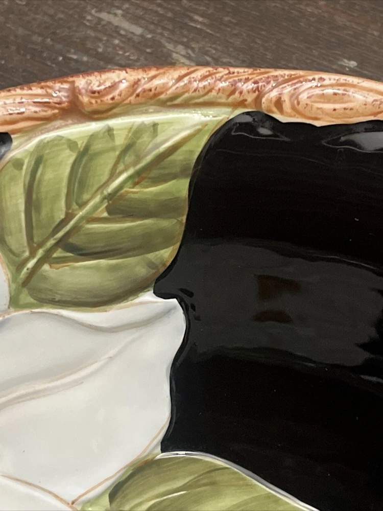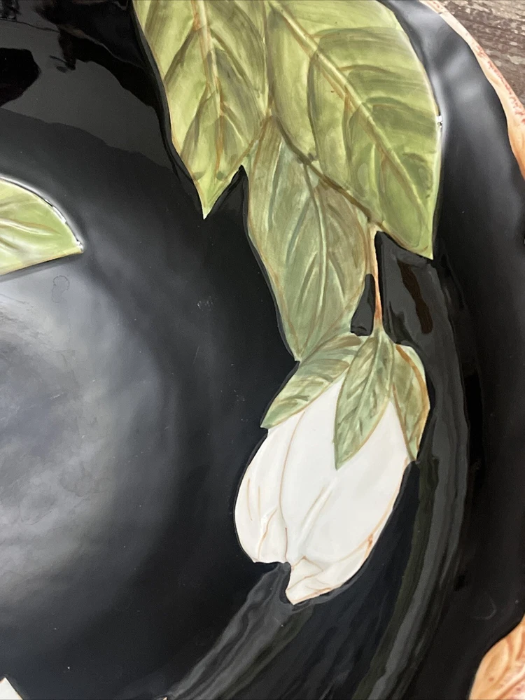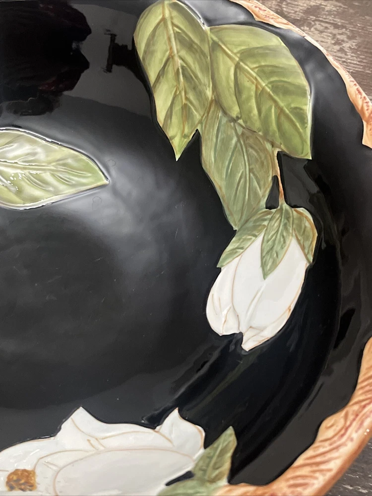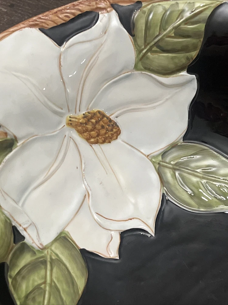The "Magnolia Charm" serving bowl by Artimino features a beautiful hand-painted design of magnolias on a black stoneware material. This large round bowl measures 11.5 inches in length and width, making it suitable for various occasions and serving needs. The floral and garden theme adds a touch of elegance to any table setting, perfect for serving dishes in style. In nearly perfect used condition. No chips or cracks. Some signs of wear from use in the bottom of bowl if held to the light (very light minimum scratches).