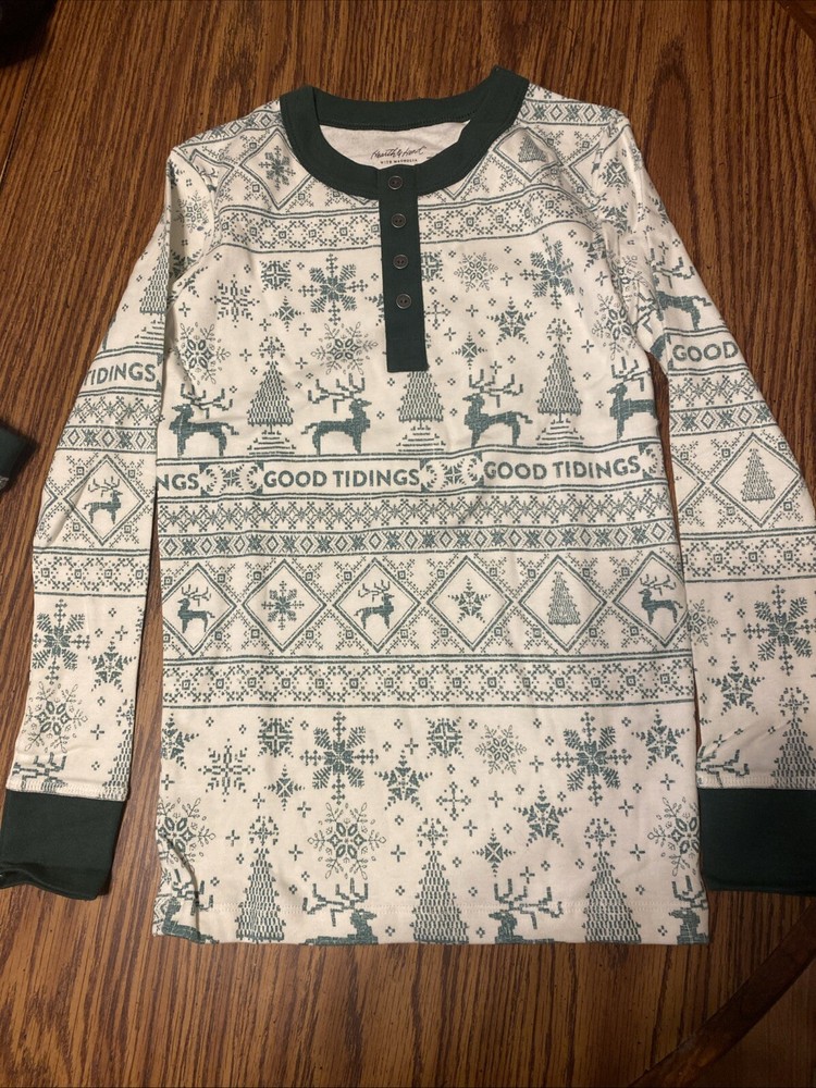 Get ready for a cozy night's sleep with this two-piece pajama set from Hearth & Hand with Magnolia. The set includes a long-sleeved top with a pullover closure and matching pants, both made of 100% cotton fabric that is soft and comfortable. The multicolor design is perfect for the holiday season and features a festive Christmas theme. This pajama set is machine washable, making it easy to care for and perfect for everyday wear. It's available in size 6 and is suitable for both boys and girls. Whether you're looking for a gift or just want to add to your child's sleepwear collection, this Hearth & Hand with Magnolia set is a great choice.