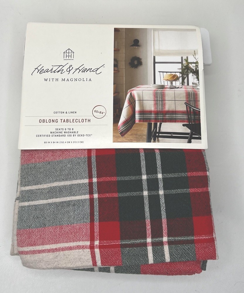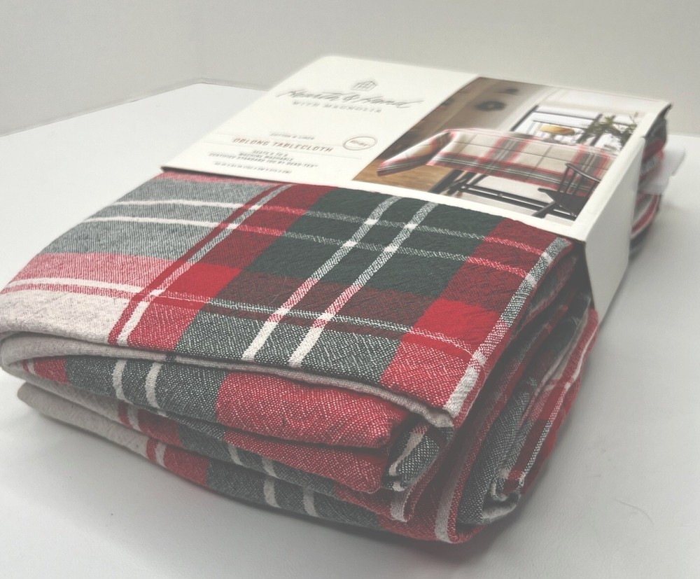 This festive plaid tablecloth is perfect for holiday gatherings! The cotton-linen blend feels sturdy yet soft, and the size easily fits 6-8 guests. The classic Joanna Gaines design adds cozy charm to any table. Arrived brand new in the packaging just as described—such a great find! Highly recommend for anyone wanting to add a warm, seasonal touch to their decor.