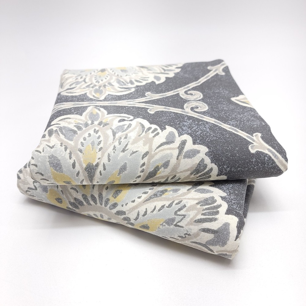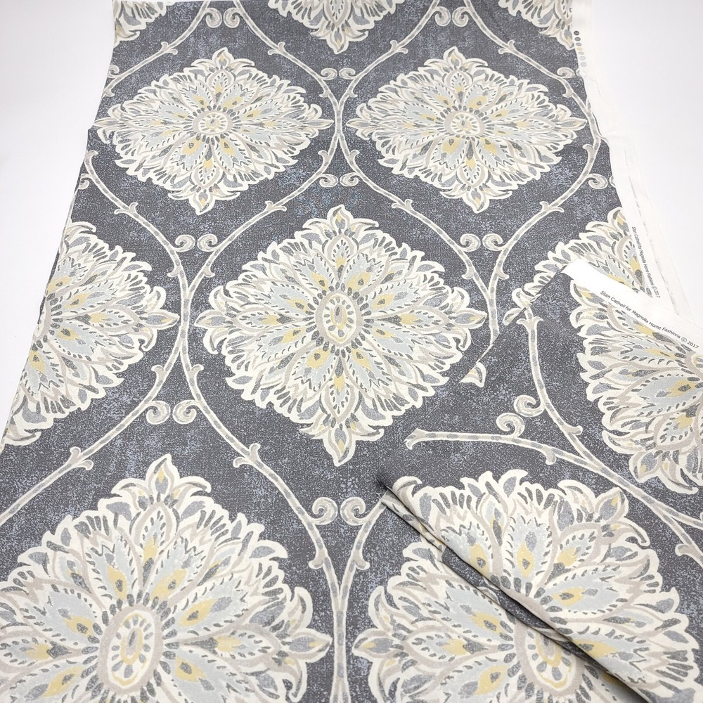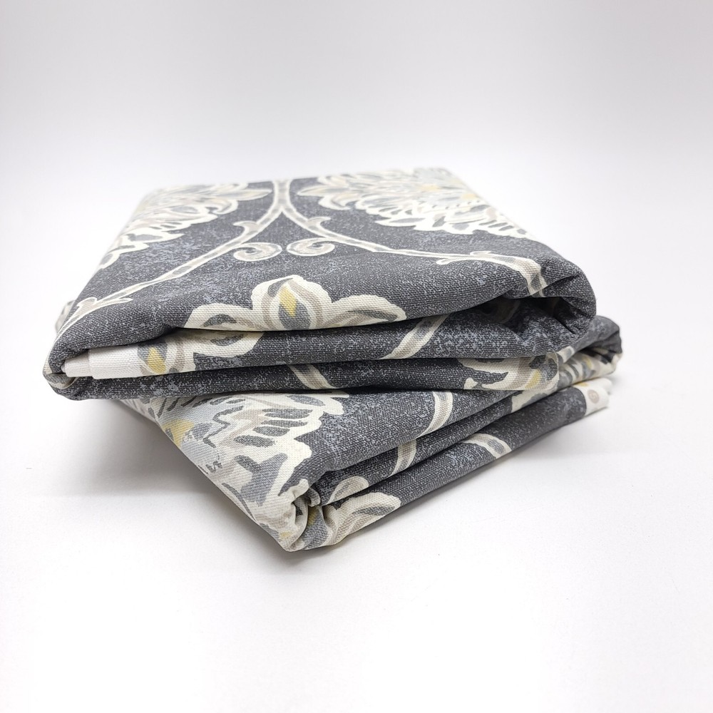 Magnolia Home Fashions Laverett Mist Stan Cathell 2pc. 56" x 5.27 yards Total First piece is 56" w x 90" long Second piece is 56" w x 100" long All items are packaged with care and shipped within one business day or sooner. Thanks for stopping by!