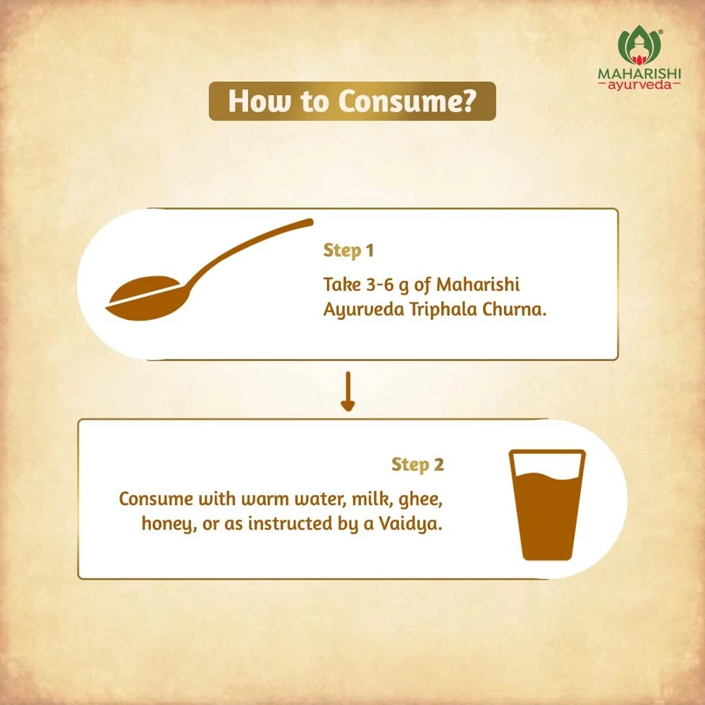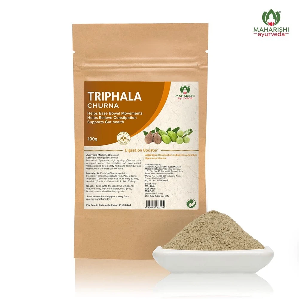 Brand Maharishi Ayurveda Special Feature Fast-Acting Item Weight 150 Grams Product Benefits Digestive Health Specific Uses For Product Digestion Active Ingredients Triphala Number of Items 1 Item Form Powder Age Range (Description) Adult Use for Stomach NATURAL LAXATIVE: Triphala is a time-tested gentle yet effective laxative that helps ease bowel movements. It increases peristaltic movement of the intestines and stimulates natural contractions of muscles in the digestive tract to promote regular easy and painless bowel movements. Triphala helps gently relieve constipation offering instant relief. IMPROVES GUT HEALTH: Triphala promotes a healthy gut by bringing about balance in the gut flora and allowing better absorption of nutrients and elimination of waste. It also helps with digestive issues by stimulating the production of digestive enzymes. Triphala promotes a healthy gut to enhance overall health and helps resolve gut-related health concerns. It further supports healthy weight management and overall well-being. MADE FROM 3 POTENT AYURVEDIC INGREDIENTS: Triphala churna is a highly effective and versatile formulation made from 3 potent herbs - Amla, Haritaki and Bibhitaki known to balance doshas and promote holistic well-being. Amla is rich in Vitamin C and is known to improve metabolism and digestion; Haritaki helps in healthy organ function and combats stomach issues while Bibhitaki has detoxifying properties that promote overall health and well-being. 100% NATURAL & SAFE: Maharishi Ayurveda Triphala churna is 100% natural and safe. It is made from a blend of potent ayurvedic herbs, grown in natural environments, free from harmful chemicals, synthetic/artificial ingredients, preservatives, sugar, lactose, and gluten, making it safe to consume in the long run. EASY TO CONSUME: Triphala churna can be easily consumed and gets absorbed faster for better results. The churna can be consumed by anyone looking to promote better bowel movement and gut health. The advised dosage is 3-6 grams daily on an empty stomach or as directed by the Vaidya. ABOUT MAHARISHI AYURVEDA: Maharishi Ayurveda focuses on Authentic Ayurveda For Modern Living. It brings together the power of Ayurveda science and natural ingredients to promote holistic health by offering time-tested solutions to address lifestyle disorders and their root causes. All products from Maharishi Ayurveda are safe, natural, and free from side effects, making them the ideal choice for a healthy happy life. Triphala churna is formulated using tried and tested Ayurvedic practices and follows strict quality control measures, ensuring purity and potency while being free from conventional side effects. CUSTOM POLICY Custom / Duty charges will be paid by the buyer. Import duties, taxes and charges are not included in the item price or the shipping charges. These charges are the buyer's responsibility. Please check with your local customs authority to determine these additional costs prior to bidding or buying. These charges are normally collected by the delivering freight (shipping) company or when you pick the item up — please do not confuse them for additional shipping charges. RETURN POLICY We accept return of goods if there is any manufacturing defect in the item. For all such cases buyers should contact us within 2 days of receiving the item. Refunds will be given as money back as soon as the buyer ships the product and updates us with the tracking details. The expenses related to sending it back to us like shipping charges, insurance charges, and duty charges if any have to be paid by the buyer. Please inform us before returning us the goods so that we can assist you in returning the goods. FEEDBACK We appreciate your feedback and 5-Star rating if everything was satisfactory at the end of this purchase. CONTACT US · To Contact Us, Please use the Ask a Question button on the listing page. We usually respond the same or the next business day. · We are available 24*7. We reply back to emails within 1 working day normally. Thank you for the purchase.