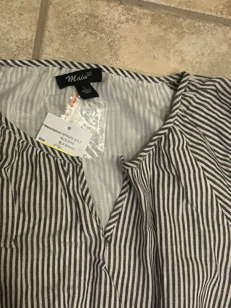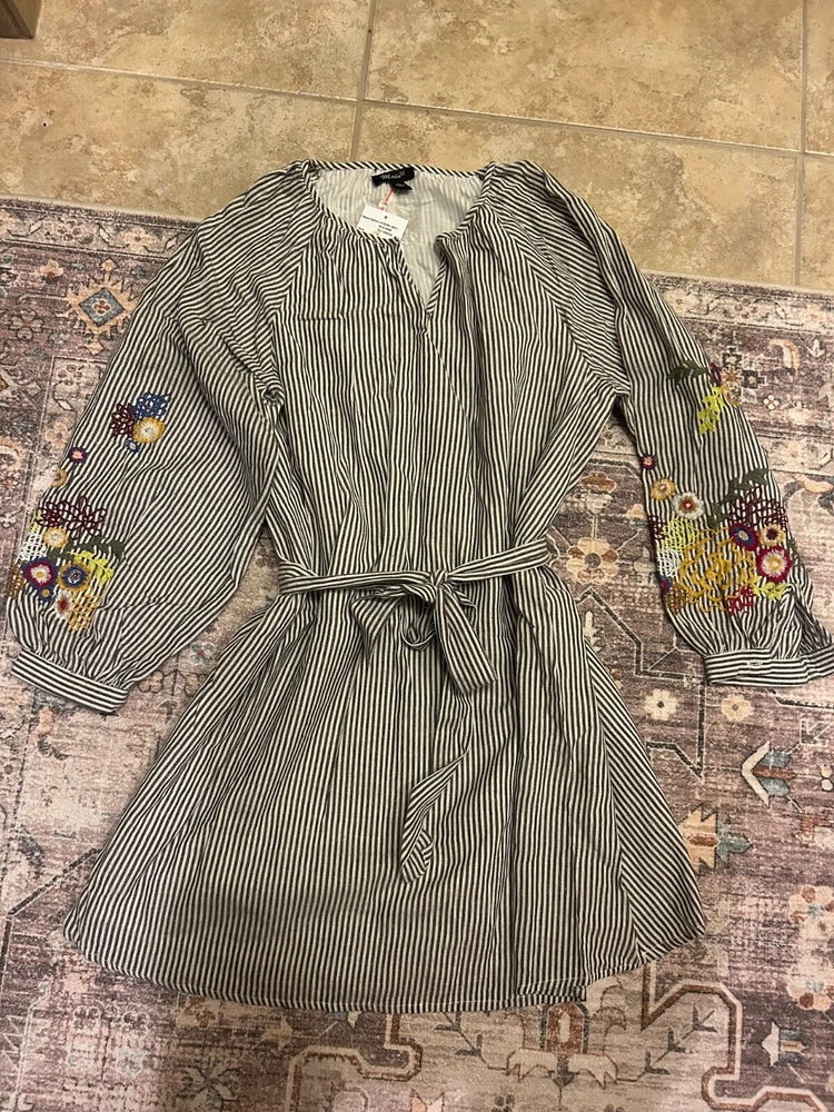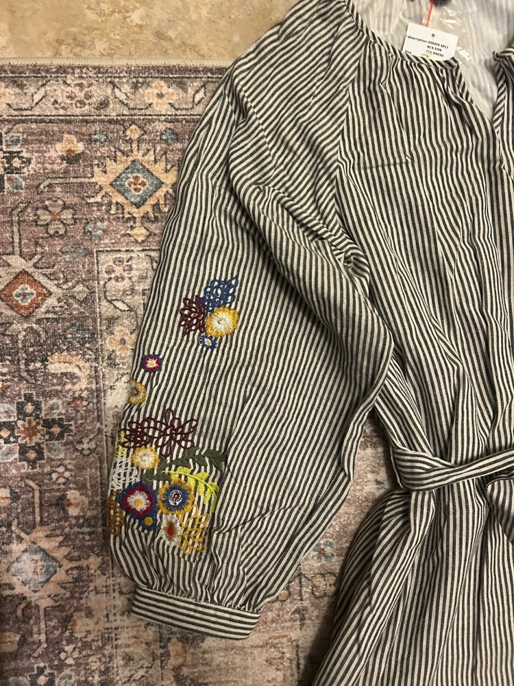Main St Embroidered Dress Striped Grey White Floral Large