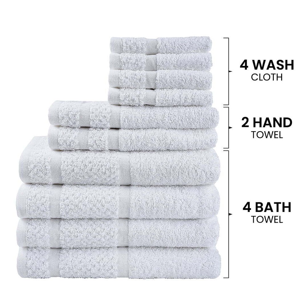 Embrace yourself in the comfort of the Mainstays Value 10-Piece Towel Set. Made from soft, absorbent 100% cotton, these towels dry quickly . The new design features a popcorn textured border for a fresh look in your bathroom, and double needle stitching for durability. This fade-resistant set includes four bath towels, two hand towels, and 4 washcloths, All age group. and all machine washable. 10-piece set includes 4 bath towels, 2 hand towels, and 4 washcloths New design with a popcorn textured border Stylish cotton bath towels feature double needle stitching for even more durability an everyday must-have for your bathroom. for adults Soft, absorbent, and fade-resistant Made of 100% cotton All age group.