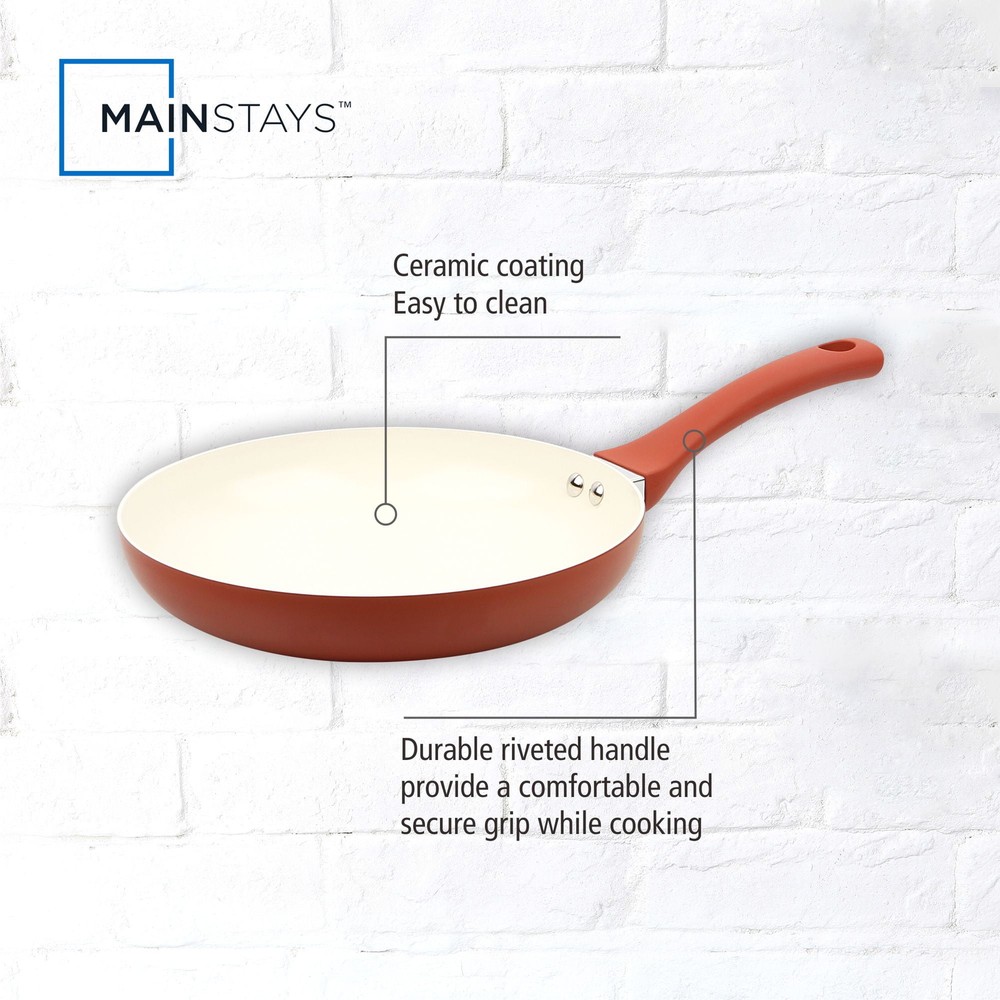 Update your kitchen essentials with the Mainstays Ceramic 10In Aluminum Nonstick Frypan Red Canyon.This 10in aluminum frypan is ideal for everyday cooking at home. Easy clean up. Aluminum body distributes heat more fast and even, it will help you save time cooking as well. The interior is coated with 2 layers of PPG Customized ceramic coating, which is healthy and makes cooking and clean-up easy. Handle is strongly connected by rivets. It is suitable for all cooktops except induction. The outside red color of this frypan will offer a bright pop of color to your kitchen Aluminum body for fast and even heating Riveted handle for strong connection Suitable for all cooktops except induction Mainstays Ceramic 10In Aluminum Nonstick Frypan Red Canyon