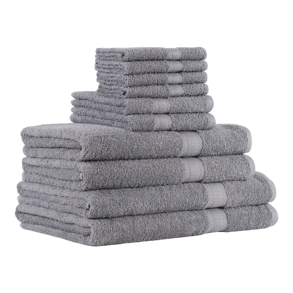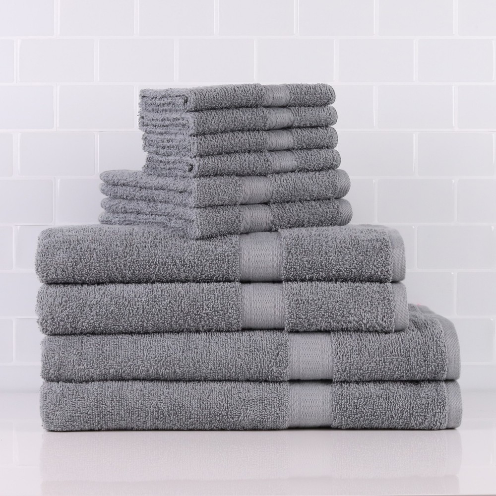 Product details Refresh your linen closet with the durable yet incredibly soft and absorbent Mainstays Basic Solid 10-piece bath set. Crafted using quality yarns these linens are easy care machine washable and ideal for everyday use. The Mainstays Basic Solid 10-piece bath sets are 100% cotton and are available in several colors. Each set is Oeko-Tex Standard 100 Certified and comes with (2) 30 in. by 60 in. bath sheets, (2) 27 in. by 52 in. bath towels, (2) 16 in. by 26 in. hand towels, and (4) 12 in. by 12 in. washcloths. Complete your collection with a coordinating stripe bath towel or mix and match your colors to create a different atmosphere and color pallet in your bathroom. Whichever look you prefer, the Mainstays Basic Solid 10-piece bath set is sure to please. Mainstays Basic Solid 10-Piece Bath Set, Grey Machine Washable Oeko-Tex Standard 100 Certified Ultra soft and absorbent Fits any bathroom decor with a several mix and match colors to choose from. 100% Cotton Bath Towel Measures: 52 in. by 27 in. Bath Sheet Measures: 30 in. by 60 in. Hand Towel Measures: 16 in. by 26 in. Wash Cloth Measures: 12 in. by 12 in. For best use, wash separately before first use. Perfect for Hair/Pool/Gym Multipurpose Quick Drying Light and Soft Towels