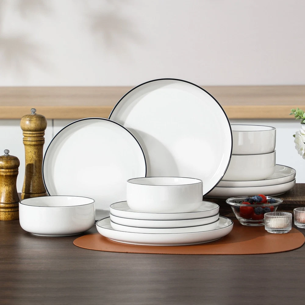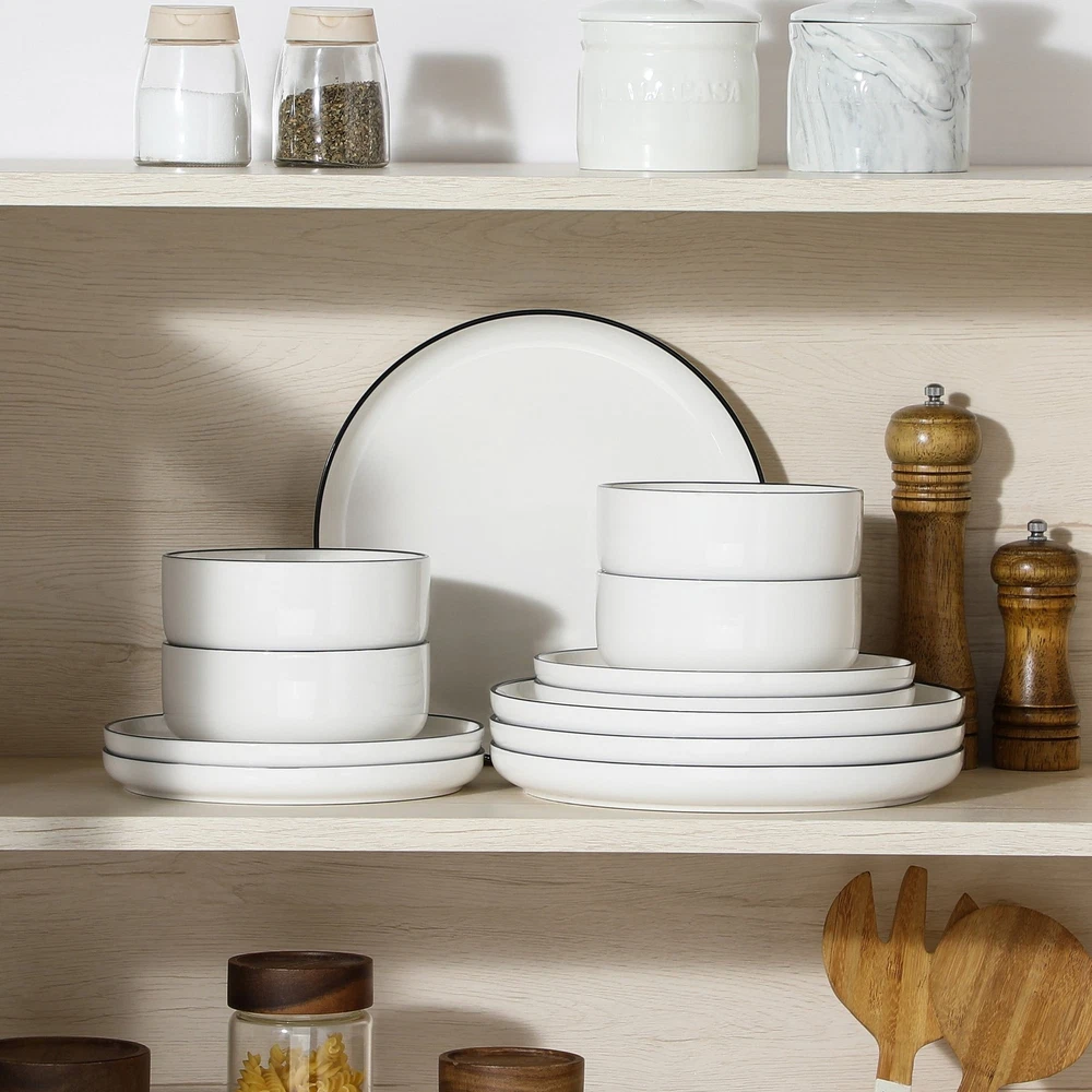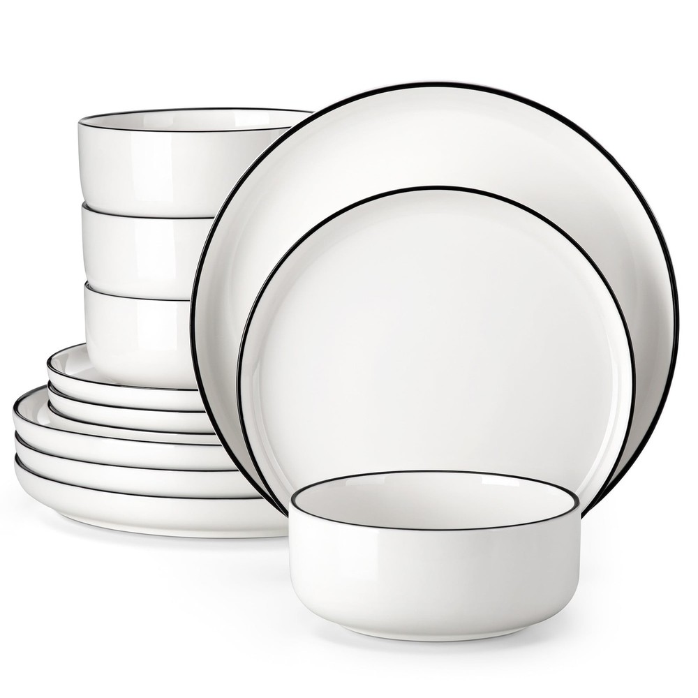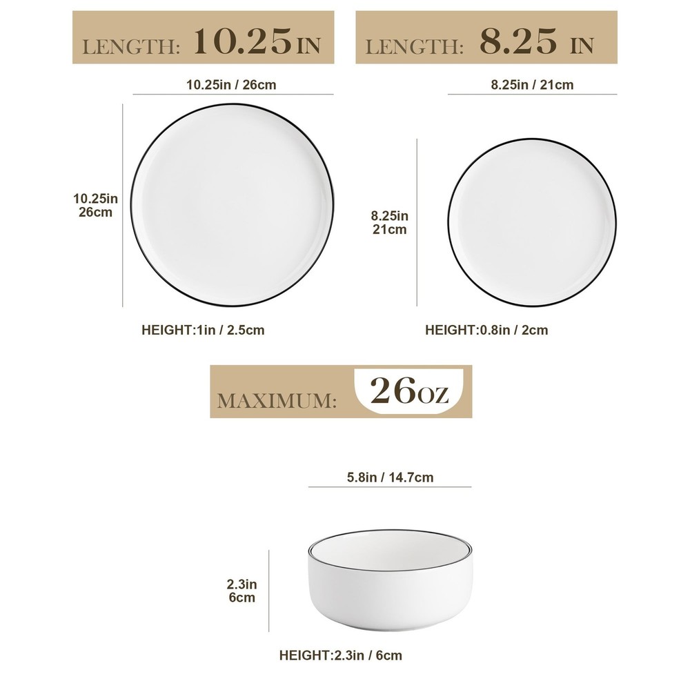 Description: Actual Color: White And Black Key Features: 1. 12 Pcs dinnerware set includes 4 dinner plates, 4 dessert plates, 4 cereal bowls. 2. Dishwasher, Microwave safe for easy care 3. Each plate and bowl can be stacked, saving space. 4. Perfect for everyday use or special occasions Features: 12 Pcs dinnerware set: Includes 4 dinner plates, 4 dessert plates, 4 cereal bowls. Multifunctional kitchen: Our plate and bowl sets for kitchen is made of durable porcelain, makes our vancasso dinner sets much harder and resistant to crack. Easy to clean and safe in oven, freezer, dishwasher and microwave. Dishwasher & microwave safe: vancasso dinner set have undergone rigorous testing in globally recognized laboratories to ensure they are safe for use in both dishwashers and microwaves. Rest assured, each plate and bowl is 100% dishwasher safe and microwave safe. Stackable & space saving: While maintaining the elegant vertical edge design, we've added grooves to the bottom of each plate and bowls, making stacking easy and saving valuable kitchen space. Perfect gift choice: Packaged attractively, this set make an excellent gift for housewarmings, weddings, birthdays and other special occasions, offering both practicality and elegance. Specifications Material Porcelain Brand vancasso Count 12 Assembled Product Weight 19.4 lb