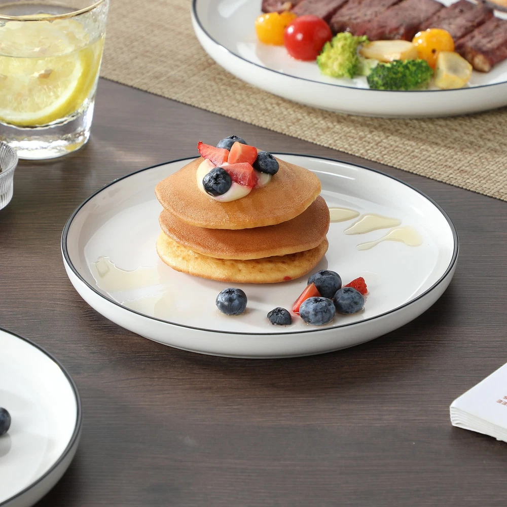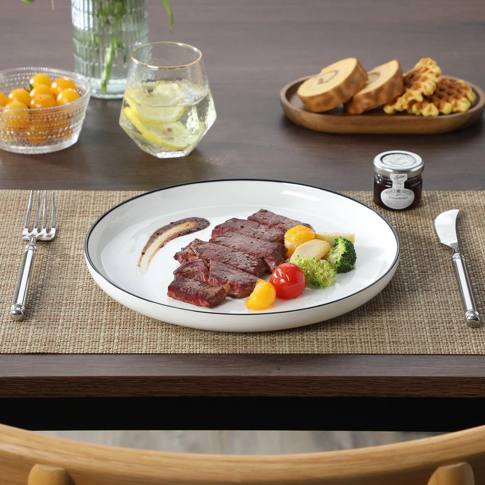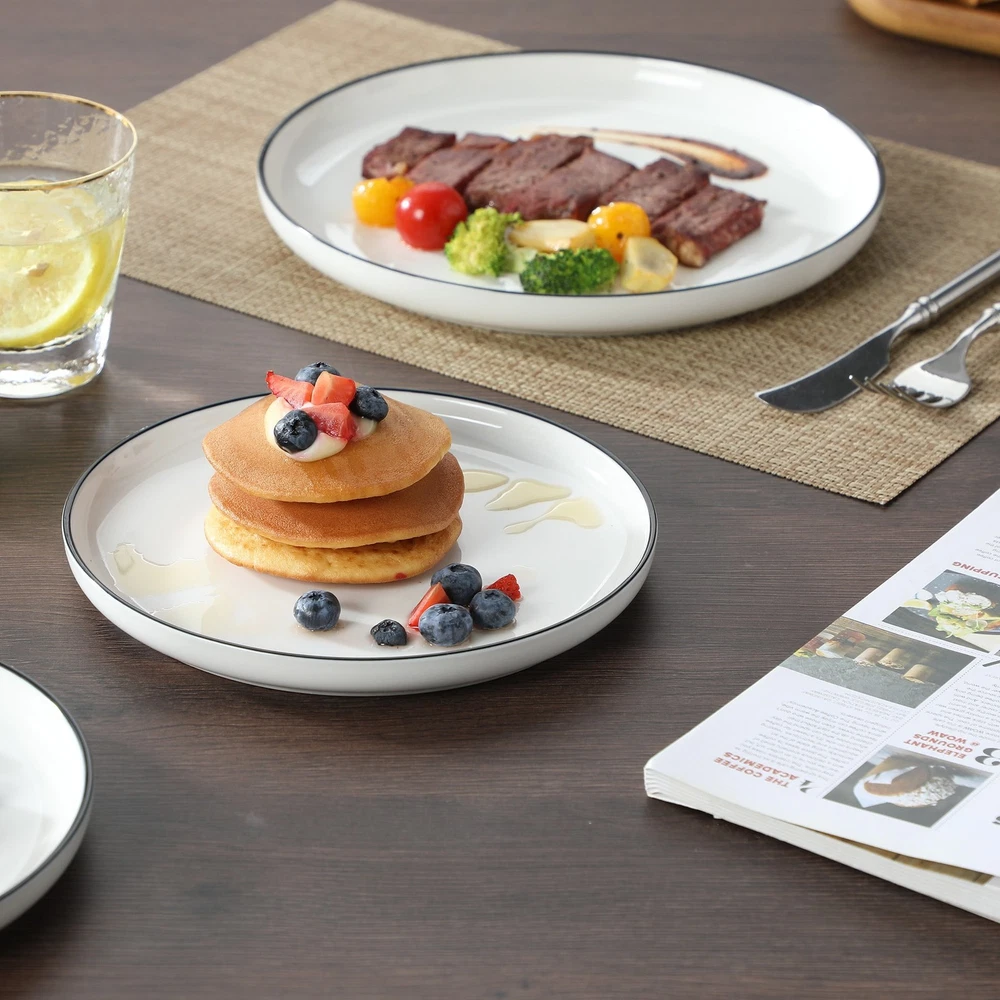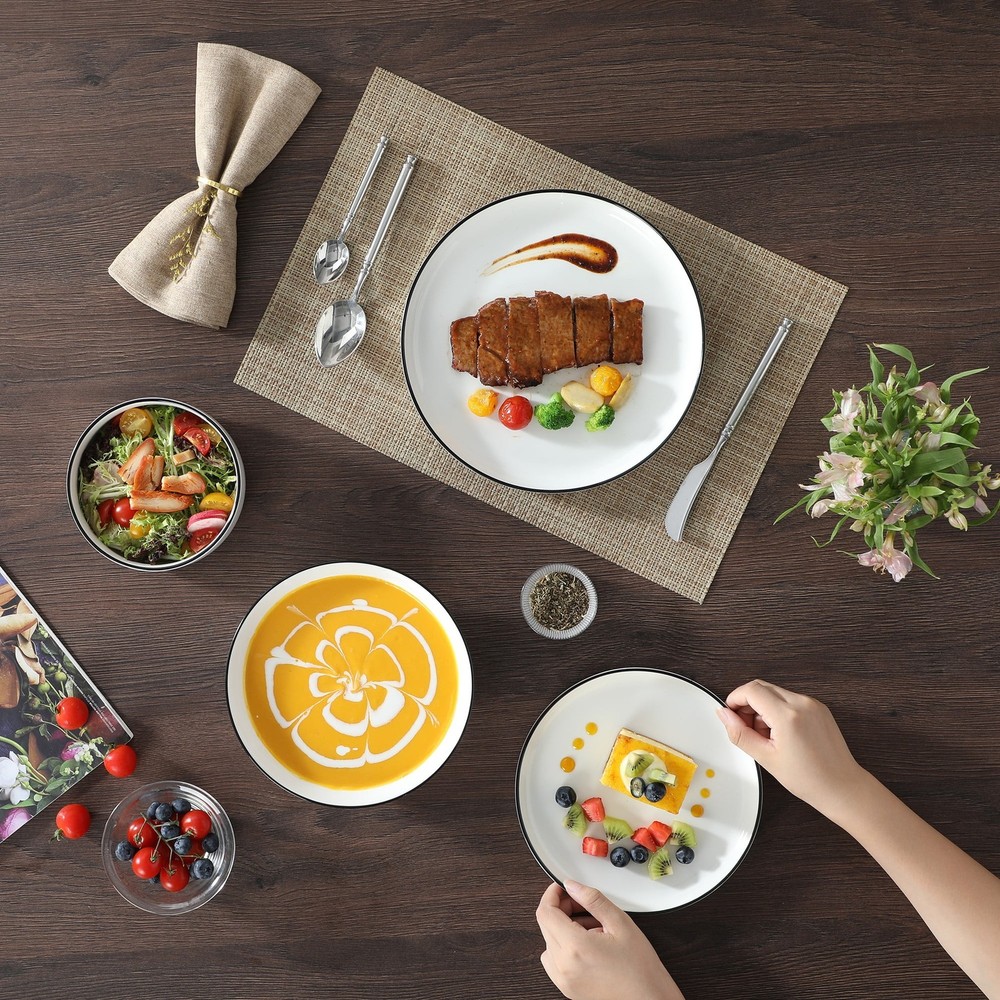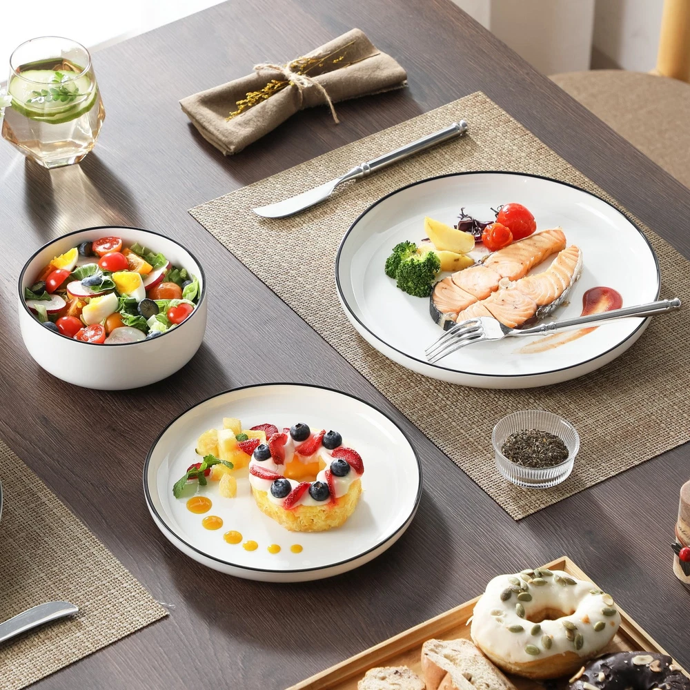 Description: Actual Color: White And Black Key Features: 1. 12 Pcs dinnerware set includes 4 dinner plates, 4 dessert plates, 4 cereal bowls. 2. Dishwasher, Microwave safe for easy care 3. Each plate and bowl can be stacked, saving space. 4. Perfect for everyday use or special occasions Features: 12 Pcs dinnerware set: Includes 4 dinner plates, 4 dessert plates, 4 cereal bowls. Multifunctional kitchen: Our plate and bowl sets for kitchen is made of durable porcelain, makes our vancasso dinner sets much harder and resistant to crack. Easy to clean and safe in oven, freezer, dishwasher and microwave. Dishwasher & microwave safe: vancasso dinner set have undergone rigorous testing in globally recognized laboratories to ensure they are safe for use in both dishwashers and microwaves. Rest assured, each plate and bowl is 100% dishwasher safe and microwave safe. Stackable & space saving: While maintaining the elegant vertical edge design, we've added grooves to the bottom of each plate and bowls, making stacking easy and saving valuable kitchen space. Perfect gift choice: Packaged attractively, this set make an excellent gift for housewarmings, weddings, birthdays and other special occasions, offering both practicality and elegance. Specifications Material Porcelain Brand vancasso Count 12 Assembled Product Weight 19.4 lb