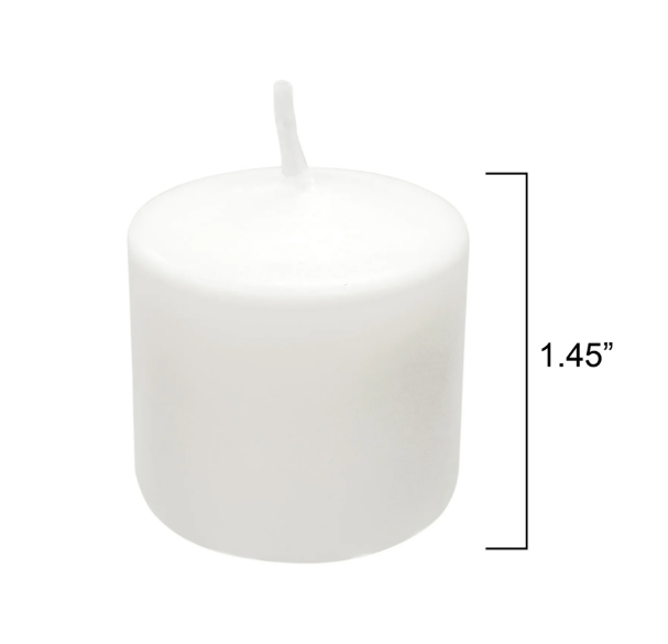 Mainstays Unscented Votive Candles, White, 16 Count Product details: Fill your space with warm and ambient lighting with the Mainstays Unscented Votive Candles. They come in a pack of 16 and each candle measures 1.45 inches in diameter and 1.45 inches in height. This unscented candle is good for everyday use including emergency power outages or simply providing warm, ambient light. They are also perfect for weddings, parties or other events. Mainstays unscented candles are available in filled votives, tapers, various sizes of pillars. With the other styles in the same collection, you can create a beautiful candle display at home. About this item: Mainstays Unscented Votive Candles, White, 16 Count Always let wax harden before relighting, touching or moving Burn within sight Keep away from things that catch fire Always burn in appropriate votive holder (holder not included) High quality wax Candles should never burn longer than a 4-hour interval Always burn within sight and extinguish before leaving room, don't burn near things that catch, and keep away from children and pets 16-pack, 1.45 inches diameter x 1.45 inches height each Don't extinguish with water Always trim wick to 1/4 inch before lighting and keep debris out of wax pool Approximate 9-11 hours