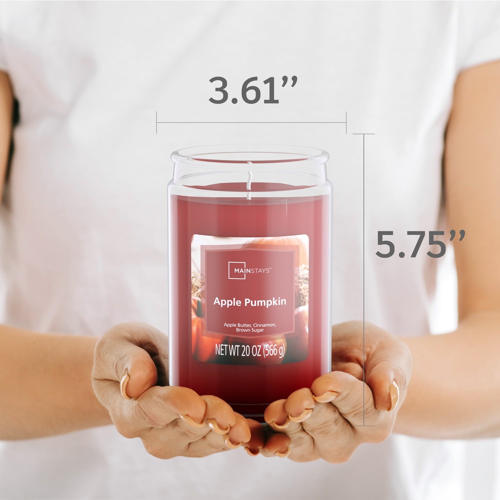 Introduce a soothing aroma into your living space with the Mainstays Apple Pumpkin Scented Single-Wick Jar Candle. Mainstays scented candles are highly fragranced and provide a clean and even burn that will fill your home with beautiful and enticing seasonal aromas. Place this candle in the kitchen, living room or dining room where you can enjoy it when entertaining guests or anytime you want to relax. Trim the wick periodically to promote even burning. Mainstays offers a wide selection of candle scents to explore and enjoy. Shop all of our Mainstays scents online and in-store. Treat yourself to the enticing scent of the Mainstays Apple Pumpkin Scented Single-Wick Jar Candle. Mainstays Apple Pumpkin Scented Single-Wick Large Glass Jar Candle, 20 oz Apple Pumpkin features Macintosh Apple whipped with warm apple butter and sweet cinnamon sugar are wrapped with maple syrup and brown sugar vanilla for a rich autumn sensation Complements virtually any room decor 20 oz. single-wick candle burns for approximately 100-120 hours Features a decorative beveled edge glass vessel Mainstays single-wick scented candles are highly fragranced, and provide a clean and even burn that will fill your home with beautiful and enticing aromas