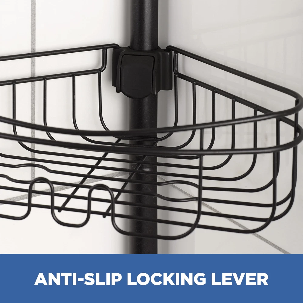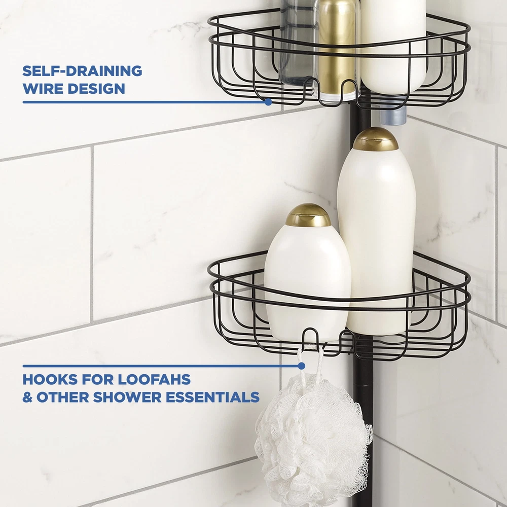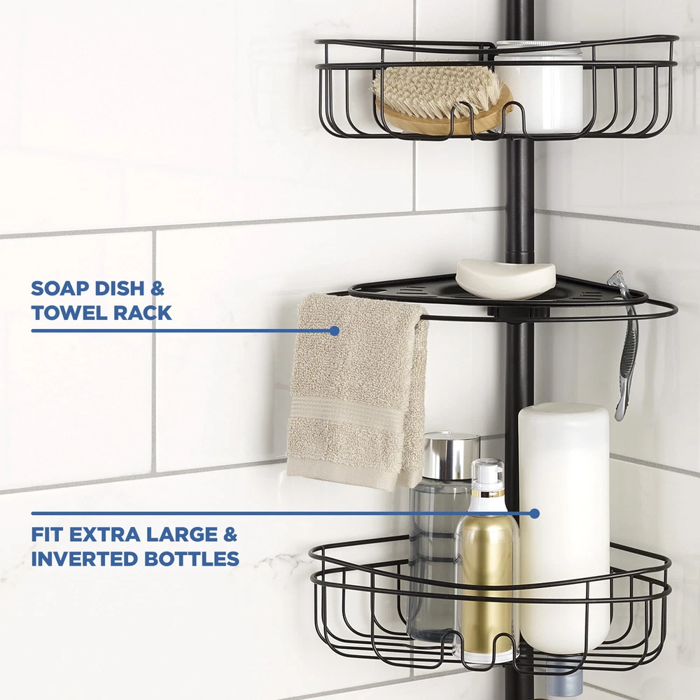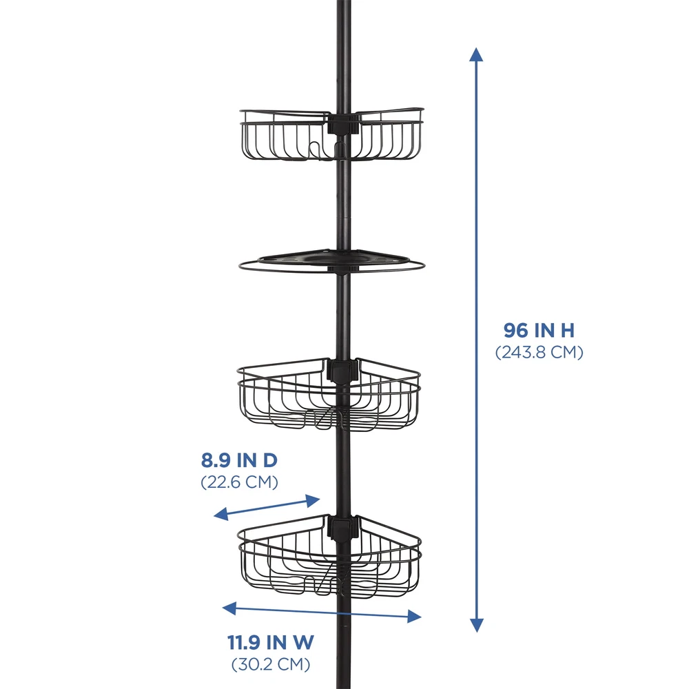 Better organize your tub or shower with the Mainstays 4-Tier Steel Tension Rod Shower Cage with 3 Baskets and Soap Tray Holder. This rod rack creates valuable storage space in the corner of your shower with 3 deep, adjustable baskets with hooks for hanging storage plus a combination soap tray/towel rod holder. The deep baskets have inverted bottle storage for quick dispensing of shampoo, body wash, and more. Each basket locks into place to stay at your desired height. To keep your looking like new, simply wipe with a damp cloth as needed. Mainstays Corner Shower Rack helps organize your bath supplies and reduce clutter Rod rack includes 3 deep, adjustable storage baskets, plus a soap tray rack with towel bar Sturdy construction; each basket holds 7.5 pounds Quick dispense inverted bottle storage for easy dispensing of shampoo, conditioner, and more Adjustable from 5 to 8 feet in height, 1 inch tall to fit in corners of most standard shower and tub spaces Tensioning rod mechanism allows for easy, secure, and tool-free installation Oil-rubbed bronze finish resists rust Wire rack drains water, allowing your toiletries to dry faster