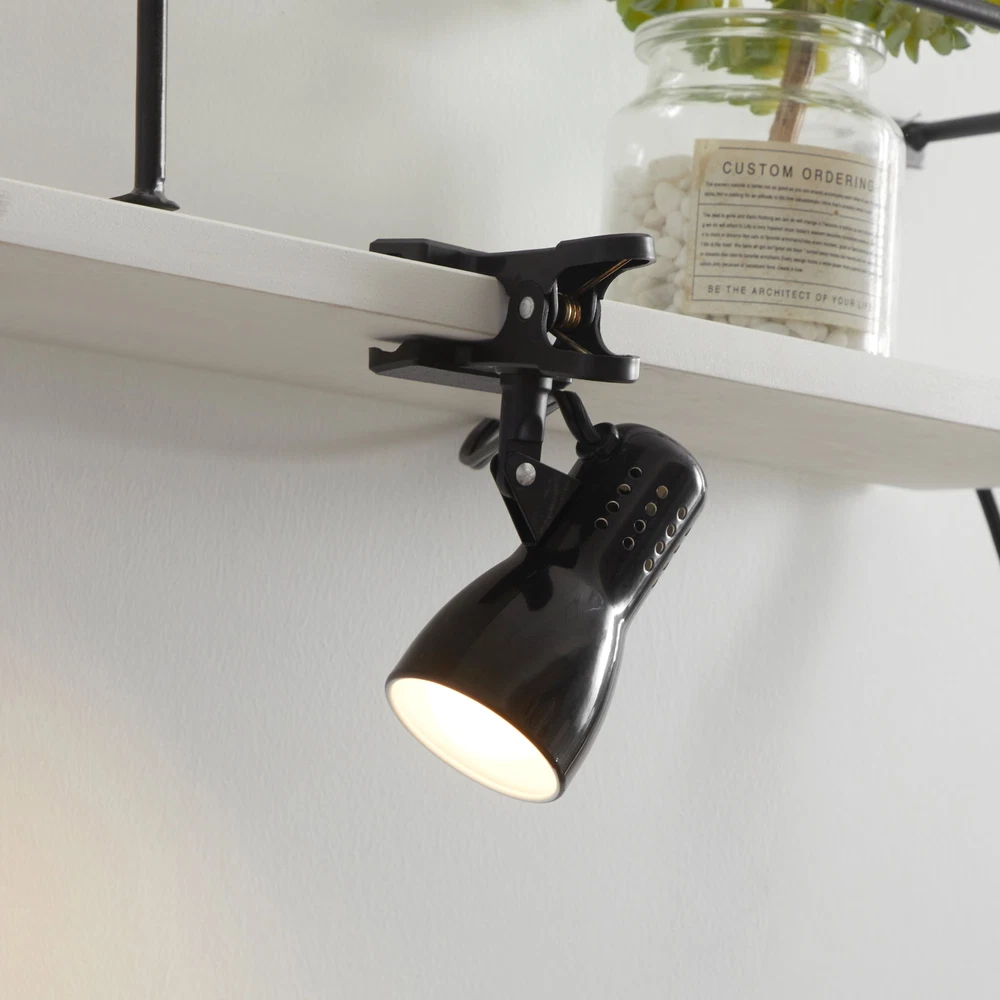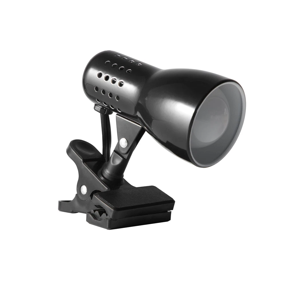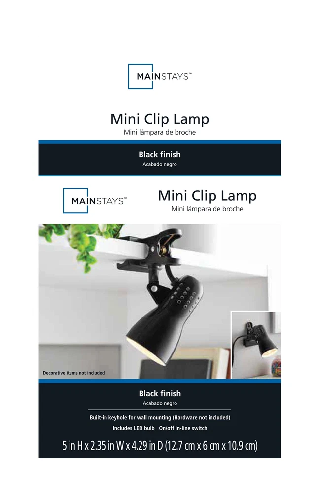 Your new best friend will be the Mainstays 5" Metal Adjustable Mini Clip Lamp with Bulb included in black. With a sturdy clamp and adjustable head, the Mainstays Mini Clip Lamp is perfect little light for your office, study or on the go. The Mainstays 5" Mini Clip Lamp is made out of a sturdy metal material for extra durability. The Mainstays Mini Clip Lamp is perfectly size to clamp down on most surfaces at 5" H x 2.35" W x 4.29" D. The Mainstays Mini Clip Lamp comes with one 25-watt E17 LED Bulb and plugs into the electrical outlet for easy use. The Mainstays Mini Clip Lamp is recommended for indoor use and includes a keyhole wall mount for hanging on the wall. The Mainstays Mini Clip is the perfect clamp lamp for attaching to a desk or table. SIZE: Perfectly sized at 5" H x 2.35" W x 4.29" D MATERIAL: Black metal finish for sleek modern appearance Comes with one 25-watt E17 LED Bulb