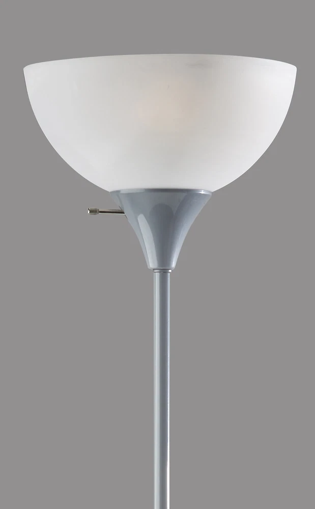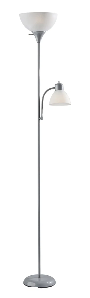 The Mainstays JK1660SLV combination floor lamp is two lamps in one, featuring a 100-watt main lamp with an additional 60-watt reading lamp (light bulbs not included). This sturdy yet slim 72" plastic lamp includes an attached reading lamp with an adjustable gooseneck, two plastic shades for a subtle ambient effect, and a 9" diameter plastic base. The main top light is controlled by a 3-way rotary switch and a simple on/off switch for the bonus reading lamp. The sleek and modern design makes this lamp a perfect addition to any adult living room, bedroom, or adult home office and a must-have for young adult college living spaces. 72" JK1660SLV floor lamp 3-way rotary light for main light source 100W and 60W bulbs required (not included) Additional reading light has a convenient on/off switch Reading light features a flexible arm Plastic shades absorb light intensity as it is needed Available colors black, silver, brown, white Modern finish complements the decor of most living areas Ideal for bedrooms, adult home offices, dens, dorm rooms