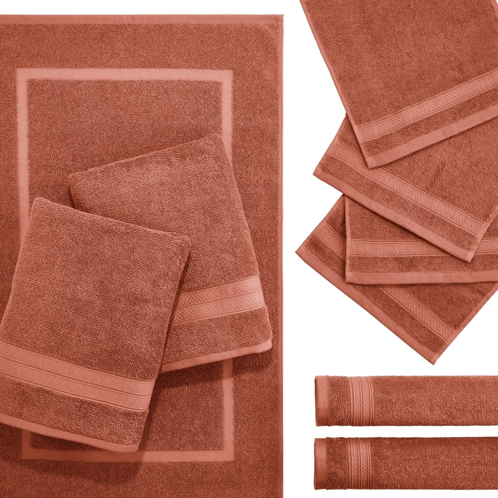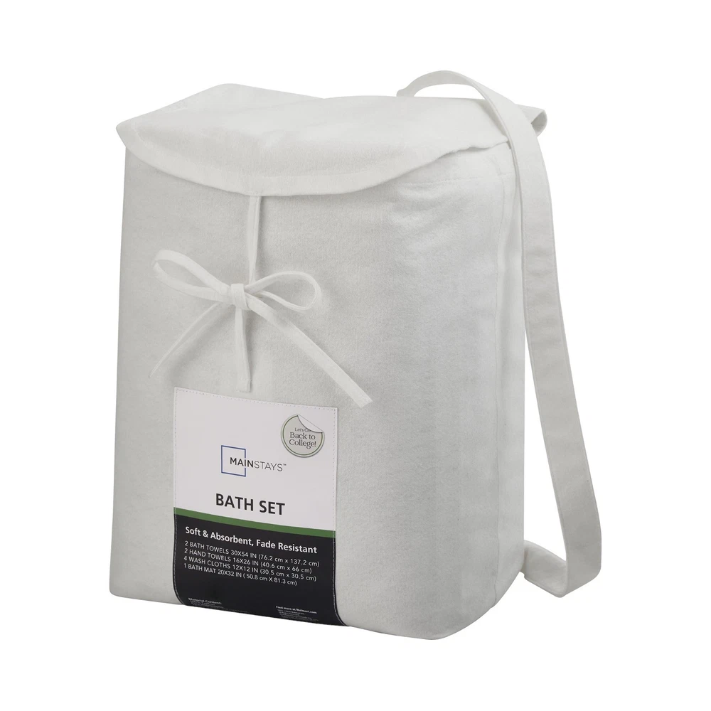 Product details Refresh your bathroom with the Mainstays 9-Piece Bath Set, available only at Walmart. Perfect for dorms, first apartments, or quick updates, this all-in-one bundle includes two bath towels, two hand towels, four washcloths, and one coordinating bath mat. Choose from four stylish colors—Corsair (teal), Washed Stone (light grey), Auburn (terracotta), and Green Sage (muted green)—to match any décor. Made from a soft, absorbent cotton blend, the towels dry quickly and resist fading. The terry bath mat adds comfort underfoot, and the reusable tote makes it ideal for gifting or on-the-go use. Complete 9-Piece Bath Set – Includes 2 bath towels, 2 hand towels, 4 washcloths, and 1 bath mat for a full bathroom refresh Soft, Absorbent and Durable – Assorted cotton towels plus a bath mat provide comfort, fast drying, and everyday durability Stylish, Coordinated Colors – Available in Corsair (teal), Washed Stone (light grey), Auburn (terracotta), and Green Sage (muted green) to match any décor Perfect for Dorms & Small Spaces – Great starter set for college students, apartments, or guest bathrooms Reusable Fabric Tote Included – Convenient for storage, gifting, or move-in day Easy Care – Machine washable and dryer safe for everyday convenience OEKO-TEX Certified – Made without harmful substances for safer use on sensitive skin