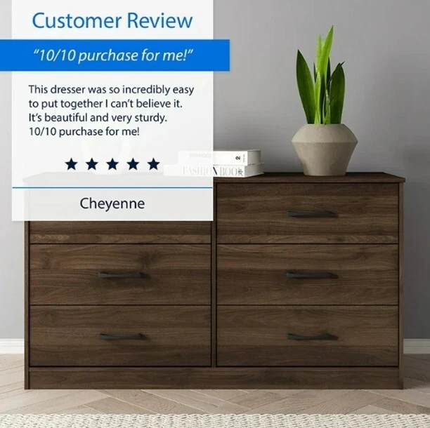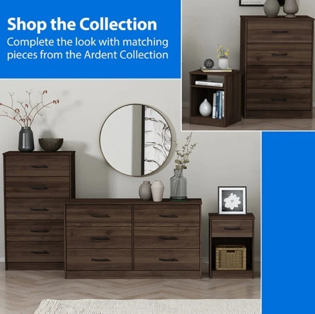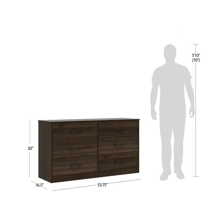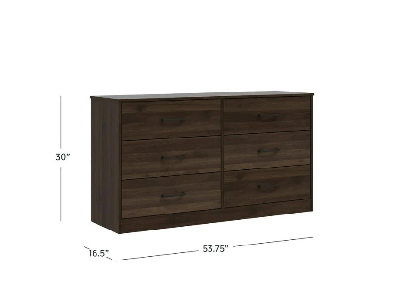 NOTE :No shipping to warehouse addresses,We do NOT ship to warehouse, box or selling item for trading purpose. If you aren't consumer, please DON'T BUY! item is currently available in the usa, delivery time is approximately 1-7 business days, the time on the order is an estimate only Feedback Customer satisfaction is very important to us. If you have any problems with your order, please contact us and we will do our best to make you satisfied. Contact Us If you have any questions, please contact us via ebay. Do not rush to leave bad feedback. We usually reply within 24 hours on weekdays. We will definitely make you satisfied. Best regards About this item Product details This six-drawer dresser is as simple to put together as it is sleek. Featuring a design that allows for quick and easy assembly by anyone, this piece gives you an elevated look without the hard work. Grooved wooden panels are designed to stay in place so you can effortlessly snap them together and then move on with your day. With clean lines and a timeless silhouette, this adult dresser boasts generously sized drawer pulls, and a lamination process ensures a consistent dark walnut finish throughout. Wide and substantial, this dresser features six spacious drawers that slide smoothly on a metal glide system. Add understated elegance to your bedroom with this casual transitional piece. Assembly required. Minimally adorned casual transitional dresser with a classic silhouette Wood, MDF, particle board and PU paper foil laminate construction in a dark walnut finish Ultra-fast, frustration-free, easy assembly Overall Dimensions: 30H x 53.75W x 16.5D Assembly required Item will ship in one box Effortless metal glide system This product is compliant with the U.S. STURDY Act, which addresses anti-tip specifications that protect children. The design prohibits multiple drawers from being opened at once for safety purposes, and anti-tip hardware is included in the package Works well with modern and contemporary décor Contrasting matte black drawer pulls Brand Mainstays Collection Ardent Dresser Style Double Dressers Orientation Horizontal Color Dark Walnut Material Wood Composite Wood Type Walnut Wood Tone Medium Wood Hardware Finish Black Assembled Product Weight 124.4 lb Number of Drawers 6 Drawer Dimensions 6.25"H x 24.75"W x 14.5"D Number of Doors 0 Features Drawer Safety Stop Age Group Adult Gender Unisex Cleaning, Care & Maintenance Wipe Clean Maximum Load Weight 47 lb Is Assembly Required Y Suggested Number of People for Assembly 1 Manufacturer Part Number MS15013489716WA Model MS15013489716WA Assembled Product Dimensions (L x W x H) 16.50 x 53.75 x 30.00 Inches