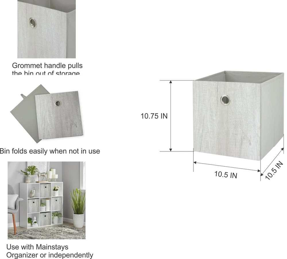 Includes 4 gray wood cube organizer bins Perfect for pairing with your favorite colors and patterns to mix and match Bin features an easy carry handle on the side that makes it easy to take the bin wherever you need to go Can be used with our Mainstays Cube Storage Organizer units or independently Cubes are collapsible when not in use to maximize your space Ideal for storing books or kids and adult clothing in the bedroom, living room, laundry room or dorm rooms Made of durable polyester fabric that won't crease easily, has good abrasion resistance and holds its shape Dimensions: 10.5" L x 10.5" W x 10.75" H (26.5 cm x 26.5 cm x 27.3 cm) Includes 4 gray wood cube organizer bins Perfect for pairing with your favorite colors and patterns to mix and match Bin features an easy carry handle on the side that makes it easy to take the bin wherever you need to go Can be used with our Mainstays Cube Storage Organizer units or independently Cubes are collapsible when not in use to maximize your space Ideal for storing books or kids and adult clothing in the bedroom, living room, laundry room or dorm rooms Made of durable polyester fabric that won't crease easily, has good abrasion resistance and holds its shape Dimensions: 10.5" L x 10.5" W x 10.75" H (26.5 cm x 26.5 cm x 27.3 cm) Our Mainstays Gray Wood Collapsible Fabric Storage Bins are just what you need to help you create an organized home. Perfect for storing kids to adult clothes, books, electronics and more, these bins' 10.5-inch by 10.5-inch by 11-inch size offers plenty of room to keep a wide variety of belongings neatly tucked away, and their sturdy, round metal handle allow you to pull them off shelves and slide them back in with ease. You can utilize our Mainstays Storage Cube's organizational expertise in your living room, bedroom, laundry room, and dorm room. When not in use, you can easily fold the bin down flat and keep it stored away in your closet for later. The fabric storage cubes are made to fit with our Mainstays Cube Storage Organizers (not included) and are designed with a durable polyester fabric that holds their shape. With a variety of colors to choose from, you'll be able to perfectly match your home decor when you get organized with our Mainstays Collapsible Gray Fabric Storage Bins. On Jun 29, 2025 at 20:57:18 PDT, seller added the following information: