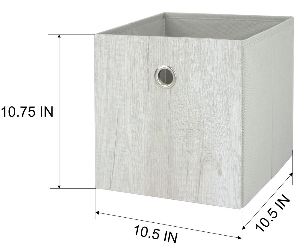Item Width: 1 Shape: Cube, Square Age Group: Adult Theme: Indoor Storage Color: Gray Wood Recommended Room: Bedroom, Closet, Dorm Room Number of Compartments: 1 Type: Storage Bins Recommended Use: Clothing Storage, Toy Storage Finish: Matte Item Length: 1 Pattern: Wood-Grain Item Height: 1 Brand: Unbranded Count: 4 Size: 10.5" W x 10.5" D x 10.75" H Assembled Product Dimensions (L x W x H): 10.50 x 10.50 x 10.75 Inches Volume Capacity: 20.5 qt Material: Fabric