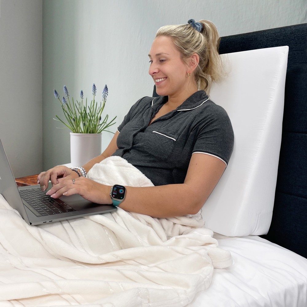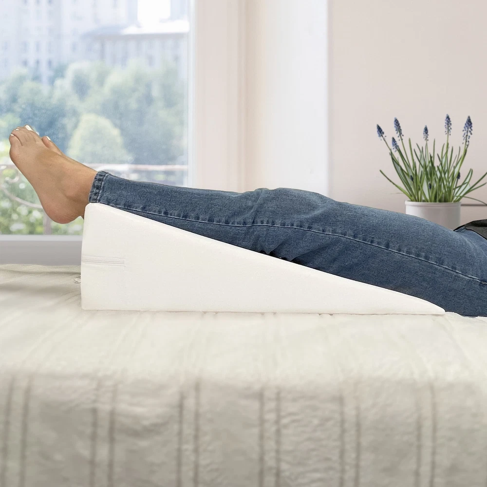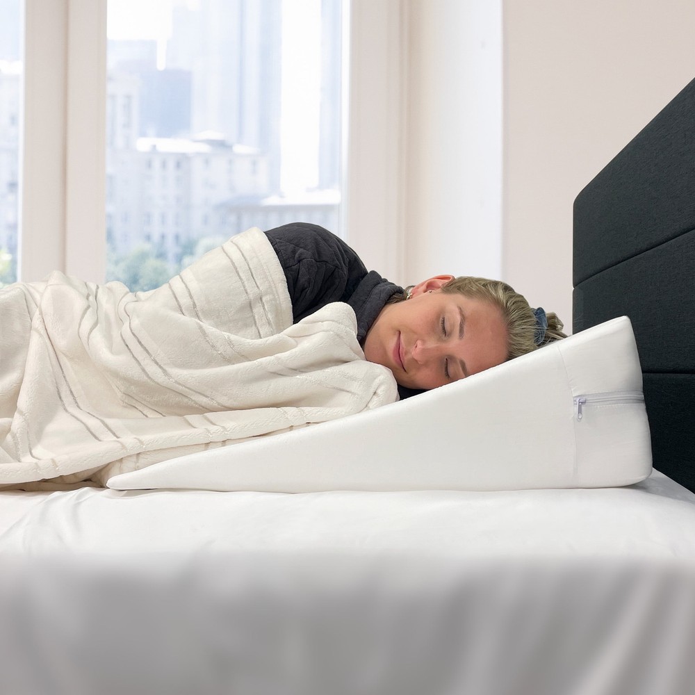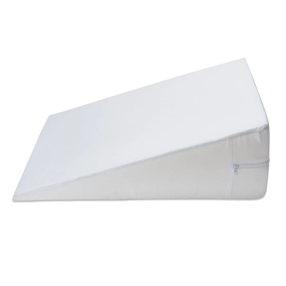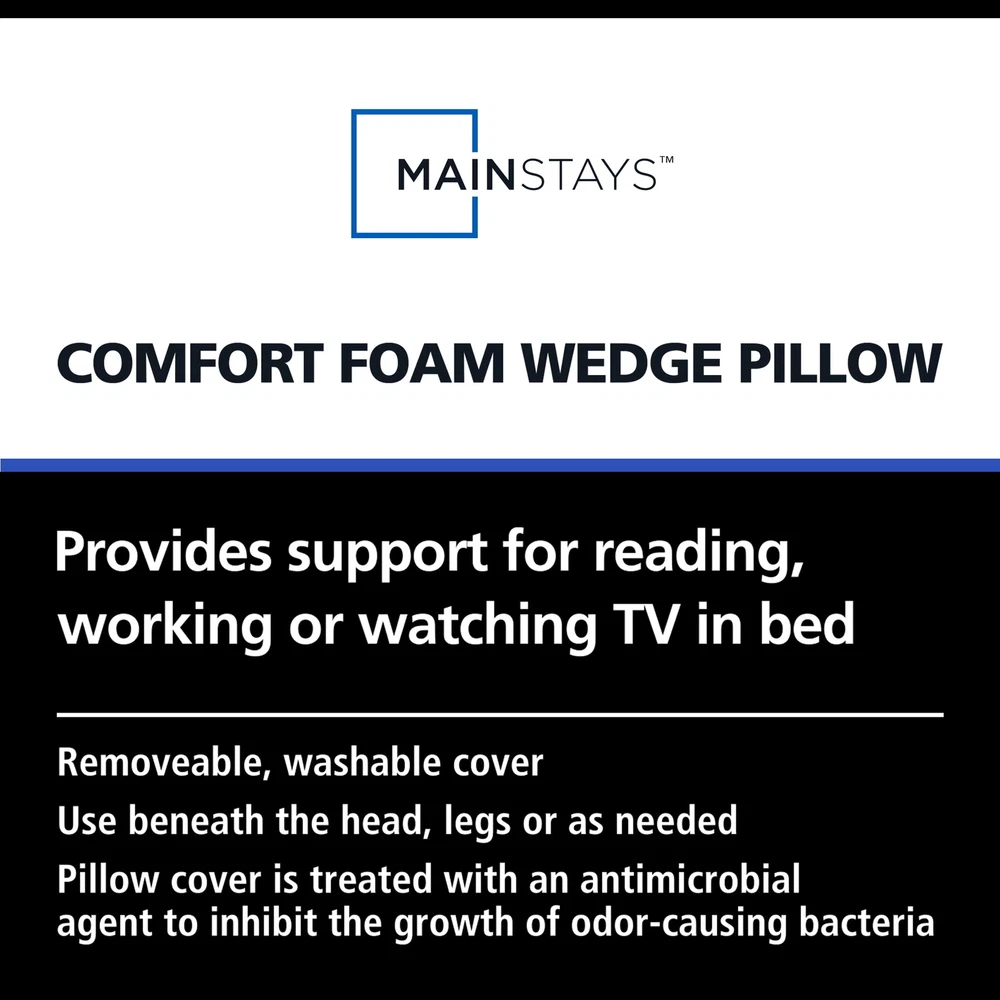 Comfort foam wedge pillow that supports you while reading, working or watching TV in bed. Made with premium high-density support foam, this pillow is the perfect blend of comfort and support. This multi-angle wedge pillow helps adults maintain an upright position while taking pressure off the upper back muscles. An angled sleeping position helps drain sinus fluid and soothes the airways, relieving chest tightness so you can breathe easier. It's also great for elevating your legs to improve blood circulation. pillow is hypoallergenic Made with premium high-density support foam Ergonomic shape for customized support to suit your needs Upright, tilted or elevated sitting position Antibacterial treated white pillowcase is removable and machine washable Stay upright while reading or watching TV Lying at an angle helps breathe easier, reducing acid reflux and snoring Elevating your legs helps improve blood circulation