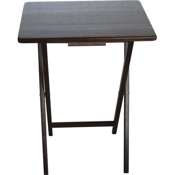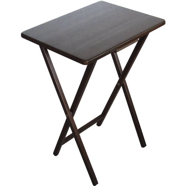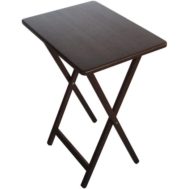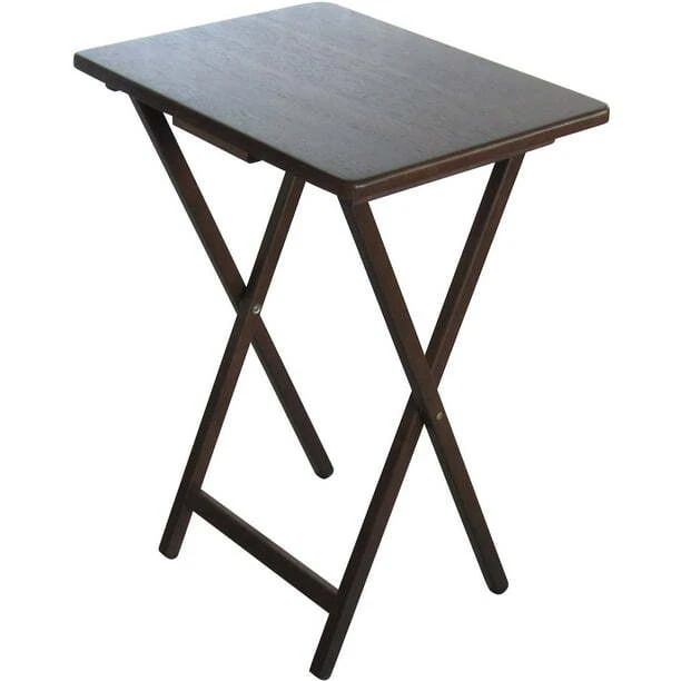Mainstays Folding TV Tray Table - Walnut 19 x 15 x 26 Inch Mainstays Folding Tray Table offers a quick and stylish side table wherever extra table space is needed, while thoughtfully designed to effortlessly fold away conveniently when not in use. It easily folds flat and can be stored practically anywhere due to its slim build and its lightweight construction. Its petite, compact folding tables are constructed from solid rubberwood and boast a classic walnut finish sure to complement any decor scheme and color story. This table not only provides ample room to keep things within reach but also works perfectly as a quick pop-up table to serve extra drinks and snacks. It is also the perfect addition to dorm rooms or smaller living spaces. Use Mainstay Tray Table to instantly create a desk, small kitchen table and work surface, meals by the television. Its sleek design can also fit in with many styles of decor, a perfect choice for every home. About this item: Folding wooden table Made from natural, solid wood Space saver Easy storage Wood tray table with rounded corners For any room of your home Use to hold beverages, snacks, meals, books, glasses, a computer, and more Color: Walnut