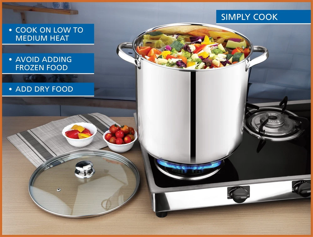 Prepare amazing sauces, soups, pastas, and more with the sizable Mainstays Stainless Steel 16-Quart Stock Pot with Glass Lid. This extra-large stock pot measures 11.02”L x 11.02”W x 10.63”H and is perfect for cooking family meals for any occasion. Designed with stylish stainless steel and glass, it’s sure to coordinate with your existing cookware. This sturdy stock pot features stay-cool handles and a helpful, transparent glass lid, along with durable, stainless steel construction. Ideal for helping you feed your family and friends at get-togethers, backyard barbecues, celebrations, and other special events, the Mainstays Stainless Steel 16-Quart Stock Pot with Glass Lid is a must-have cookware item in any kitchen. Mainstays Stainless Steel 16-Quart Stock Pot with Glass Lid, Induction Compatible, Stainless Steel, Dishwasher Safe Sizable stock pot is perfect for preparing amazing sauces, soups, pastas, and more Dimensions: 11.02”L x 11.02”W x 10.63”H Weight: 4.84 lbs Induction safe for versatile cooking options Constructed from durable stainless steel with a transparent glass lid