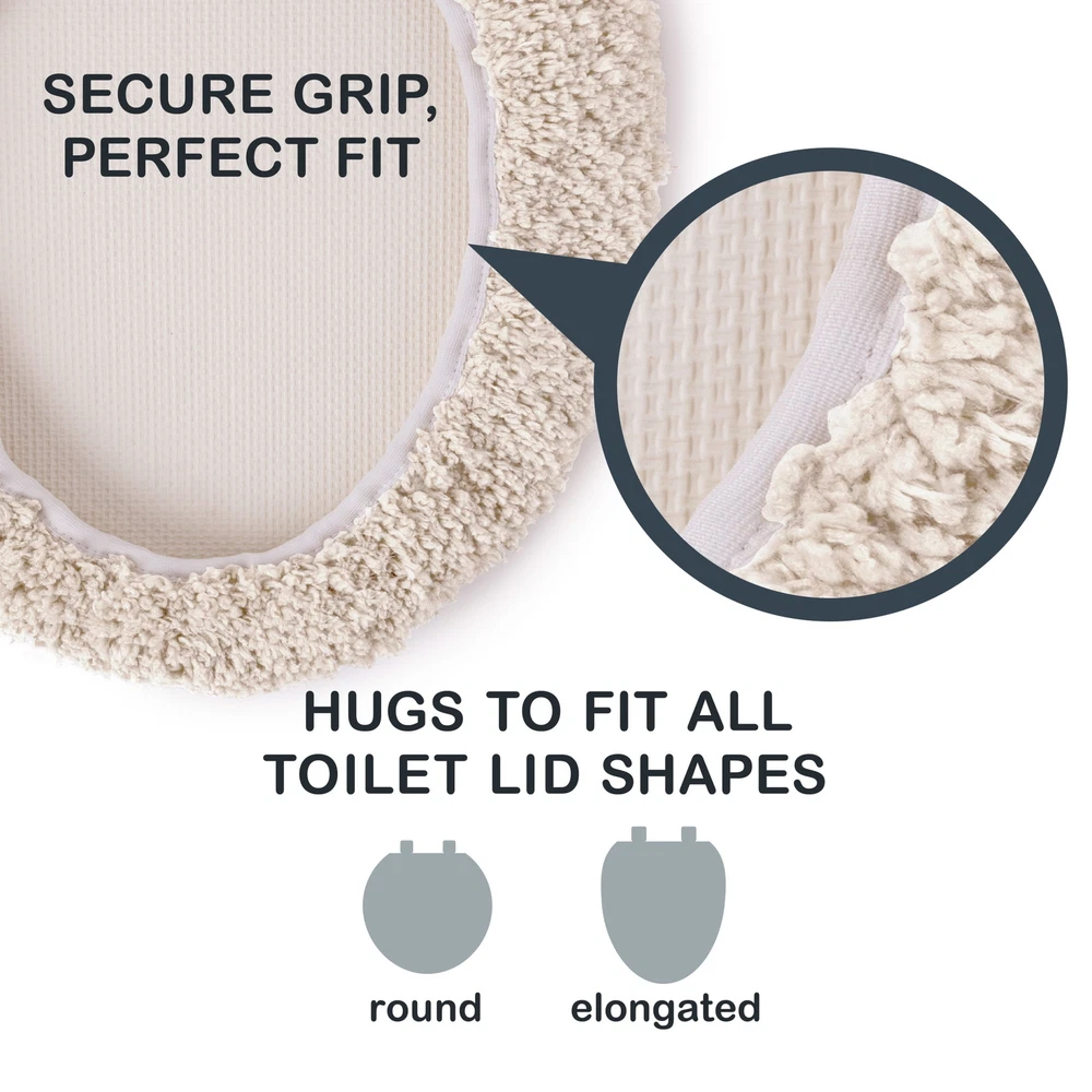 Functionality and durability are combined in this solid Mainstays Basic Toilet Lid Cover. It is a universal toilet lid cover that fits both standard and elongated lids and is crafted in plush looped 100% polyester fibers (95% Recycled Polyester). Experience fade resistant color that is paired sensibly with stain resistant fibers for a longer lasting, quality product. This machine washable lid cover provides a 1,400 GSM weight that is functional and durable. Ultra soft: Provides a plush, comfortable feel underfoot. Stain resistant: Helps maintain a clean look even with spills or dirt. Skid resistant backing: Keeps the rug in place to prevent slips and accidents. Bath rug care: Machine wash separately in warm water, Gentle cycle. If bleach desired, wash using 1.5 oz of chlorine bleach with 1.5 oz of bleach free detergent. Tumble Dry Low. Do Not Dry Clean. Available in various colors to mix and match with bathroom decor