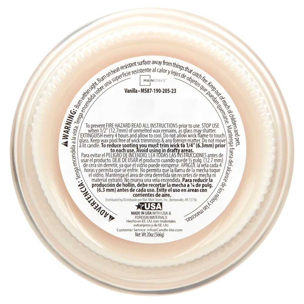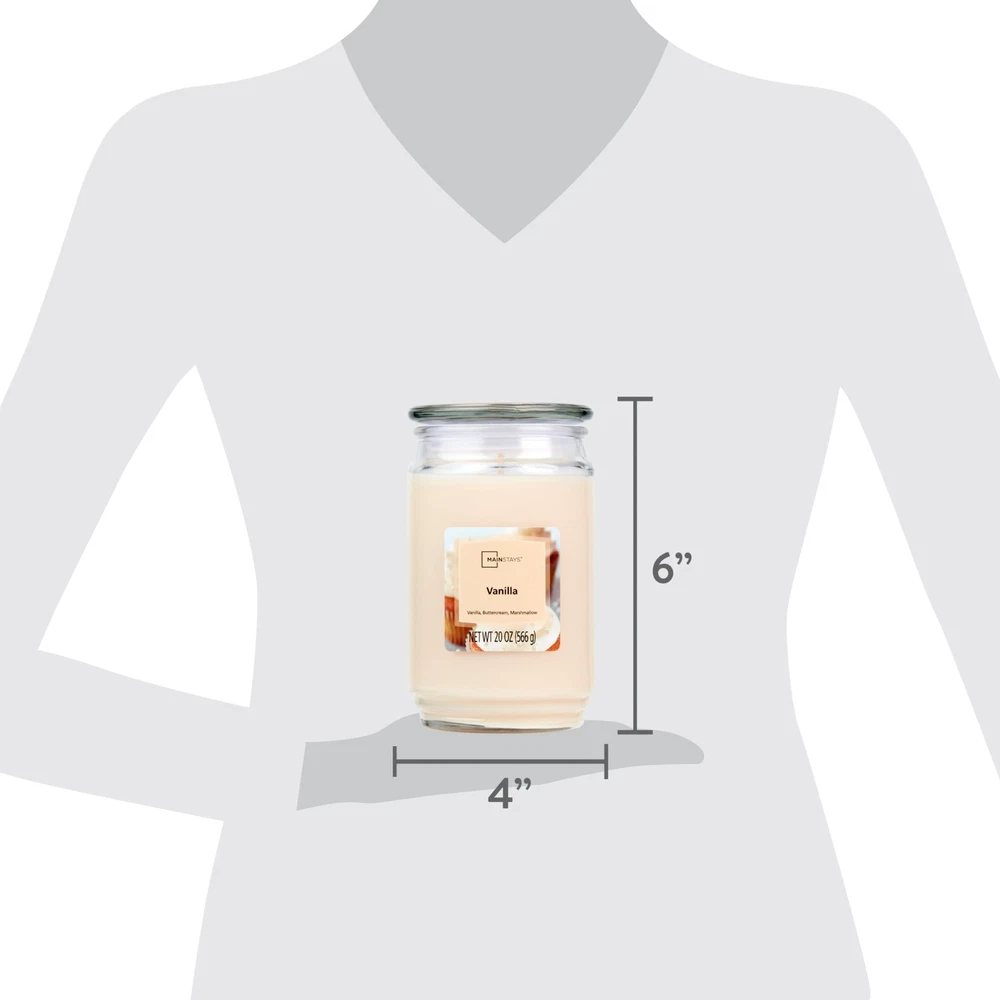 Introduce a soothing aroma into your living space with the Mainstays Vanilla Scented Single-Wick Large Glass Jar Candle. Mainstays scented candles are highly fragranced and provide a clean and even burn that will fill your home with beautiful and enticing seasonal aromas. Place this candle in the kitchen, living room or dining room where you can enjoy it when entertaining guests or anytime you want to relax. Trim the wick periodically to promote even burning. Mainstays offers a wide selection of candle scents to explore and enjoy. Shop all of our Mainstays scents online and in-store. Treat yourself to the enticing scent of the Mainstays Vanilla Scented Single-Wick Large Glass Jar Candle. Mainstays Vanilla Scented Single-Wick Large Glass Jar Candle, 20 oz A traditional favorite with a heavenly aroma! Indulgent and comforting top notes of whipped vanilla and powdered sugar give way to a heart of delicious buttercream, white cocoa and sweet anise. Vanilla bean and crystallized sugar round out this delectable must have. Complements virtually any room decor 20 oz. single-wick candle burns for approximately 100-120 hours Features a decorative beveled edge glass vessel Mainstays single-wick scented candles are highly fragranced, and provide a clean and even burn that will fill your home with beautiful and enticing aromas Our candles are made from high quality, non-toxic, clean-burning wax that is specifically developed to hold optimal fragrance loads Our Mainstays 20oz candle is available in a variety of scents