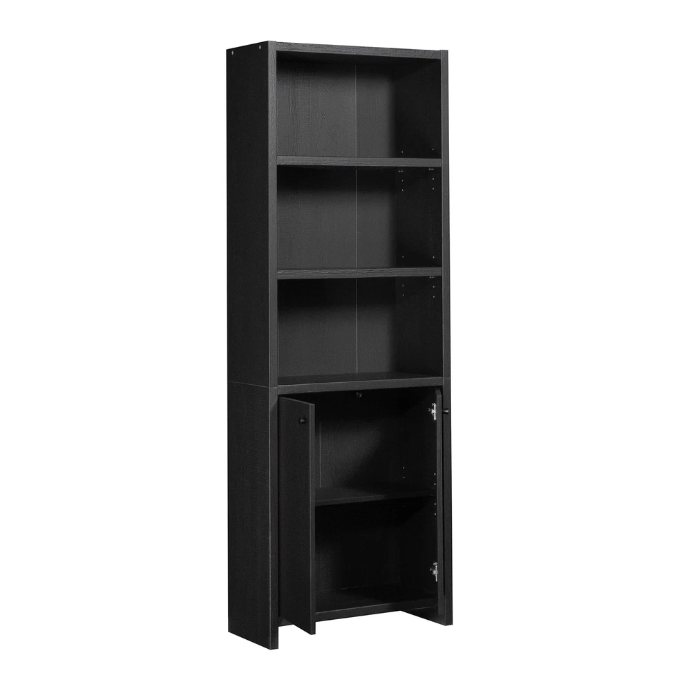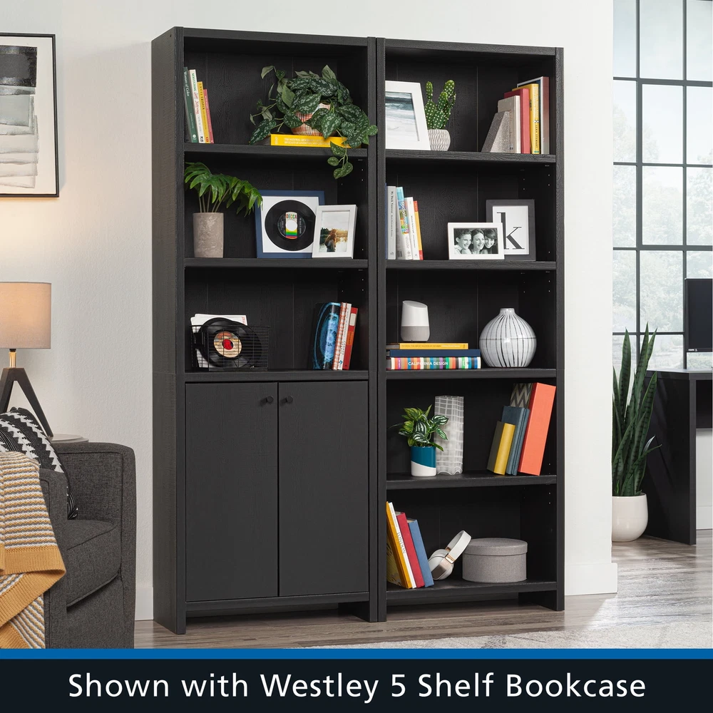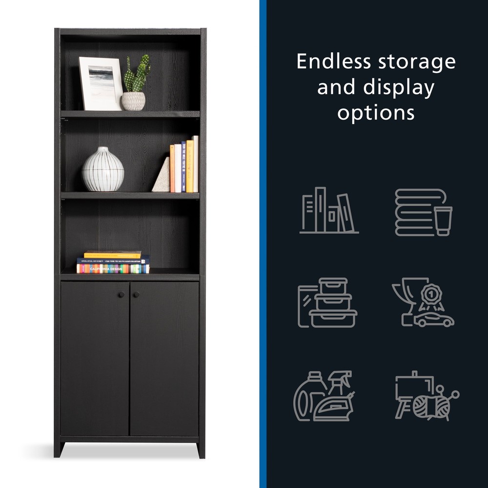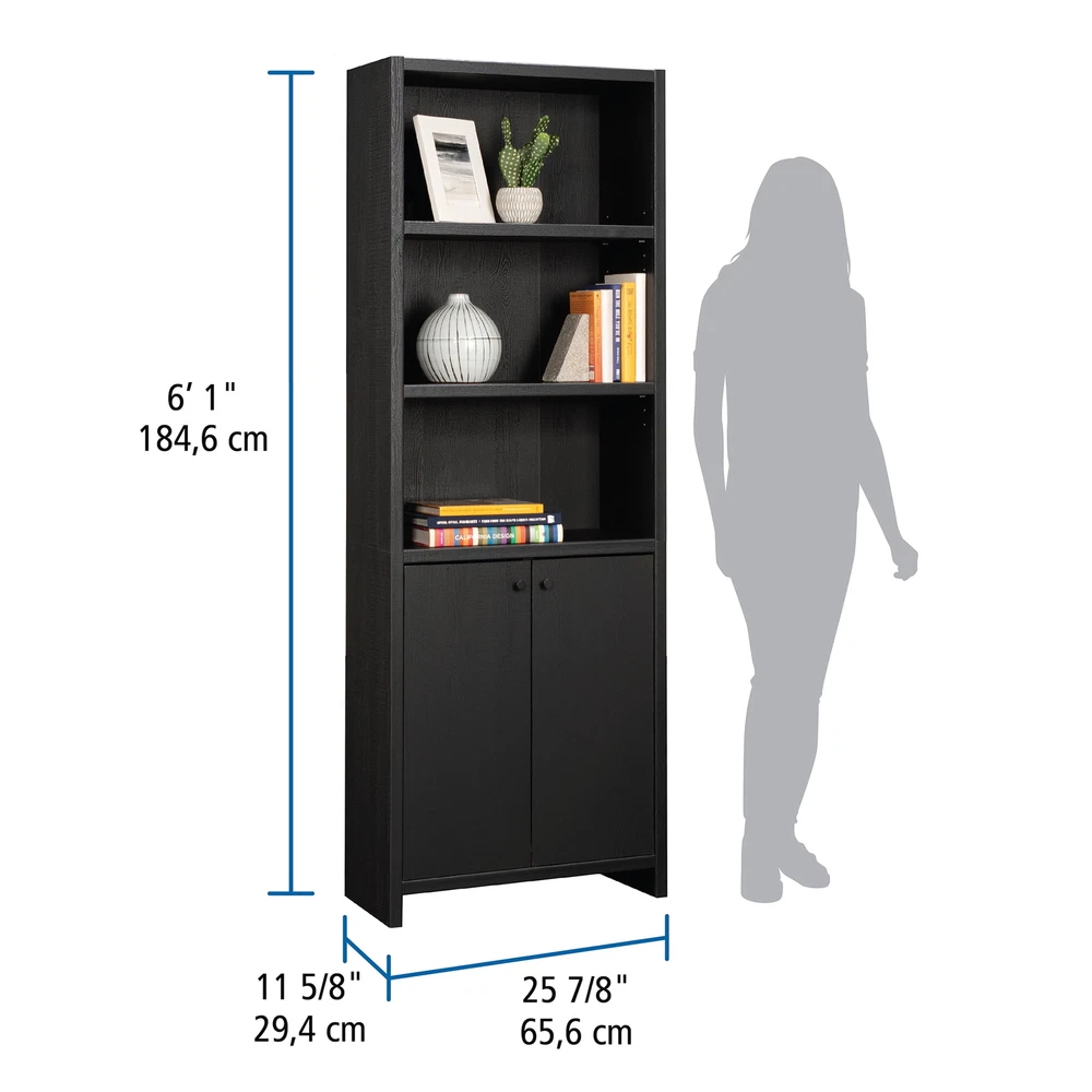 Infuse a touch of elegant style into your home with the 5-shelf bookcase from the Mainstays Westley collection, in a sleek, black wood . This versatile bookcase with doors seamlessly blends functionality with a timeless design, featuring three adjustable shelves that can be customized to accommodate collections of all shapes and sizes. This transitional style bookcase retains its outward appeal while concealing storage space below, with an adjustable shelf for added convenience. This discreet space offers a haven for tucking away clutter or storing seasonal items, maintaining a clean and organized living environment. Whether you're showcasing a children’s library, a collection of cookbooks, or organizing office supplies, this display bookcase caters to a wide variety of needs. With its strong and lightweight 1-inch panel construction, this 5-shelf bookshelf effortlessly combines transitional and neutral style with practicality and charm, seamlessly integrating into any living space. This bookcase with doors will elevate your home decor, making a bold statement that complements and enhances your living space. Assembled Dimensions: 25.83" L X 11.58" W X 72.68" H Strong and lightweight 1” panel construction ensures durability without compromising style Hidden storage behind doors to conceal clutter Three adjustable shelves for flexible storage options Model #: 437256 Box Dimensions: 59.84" L x 15.00" W x 7.60" H