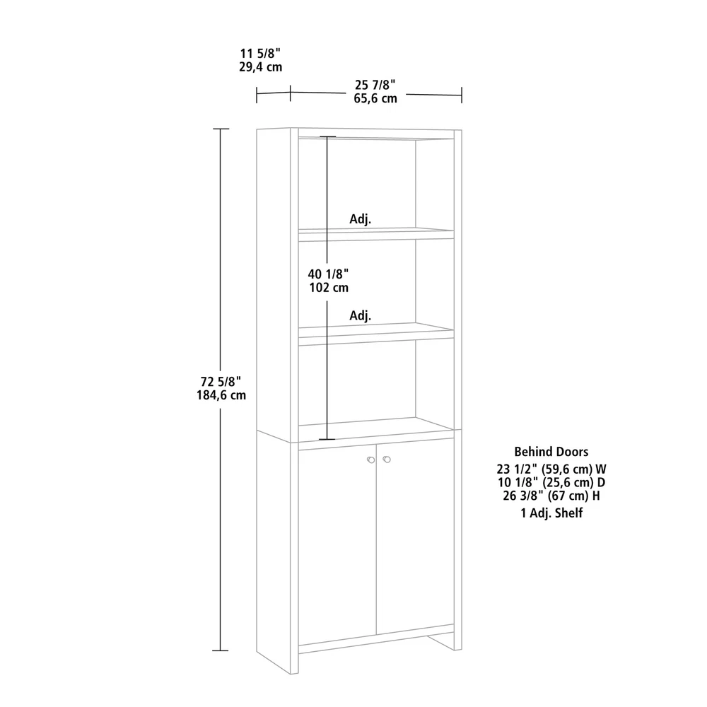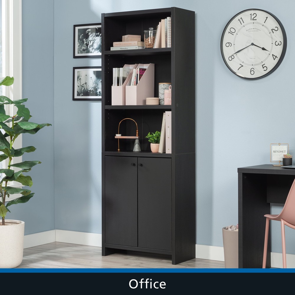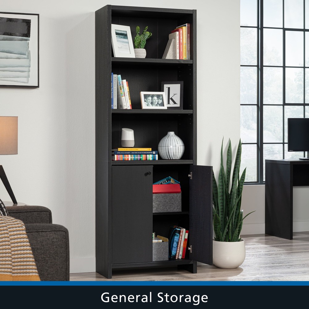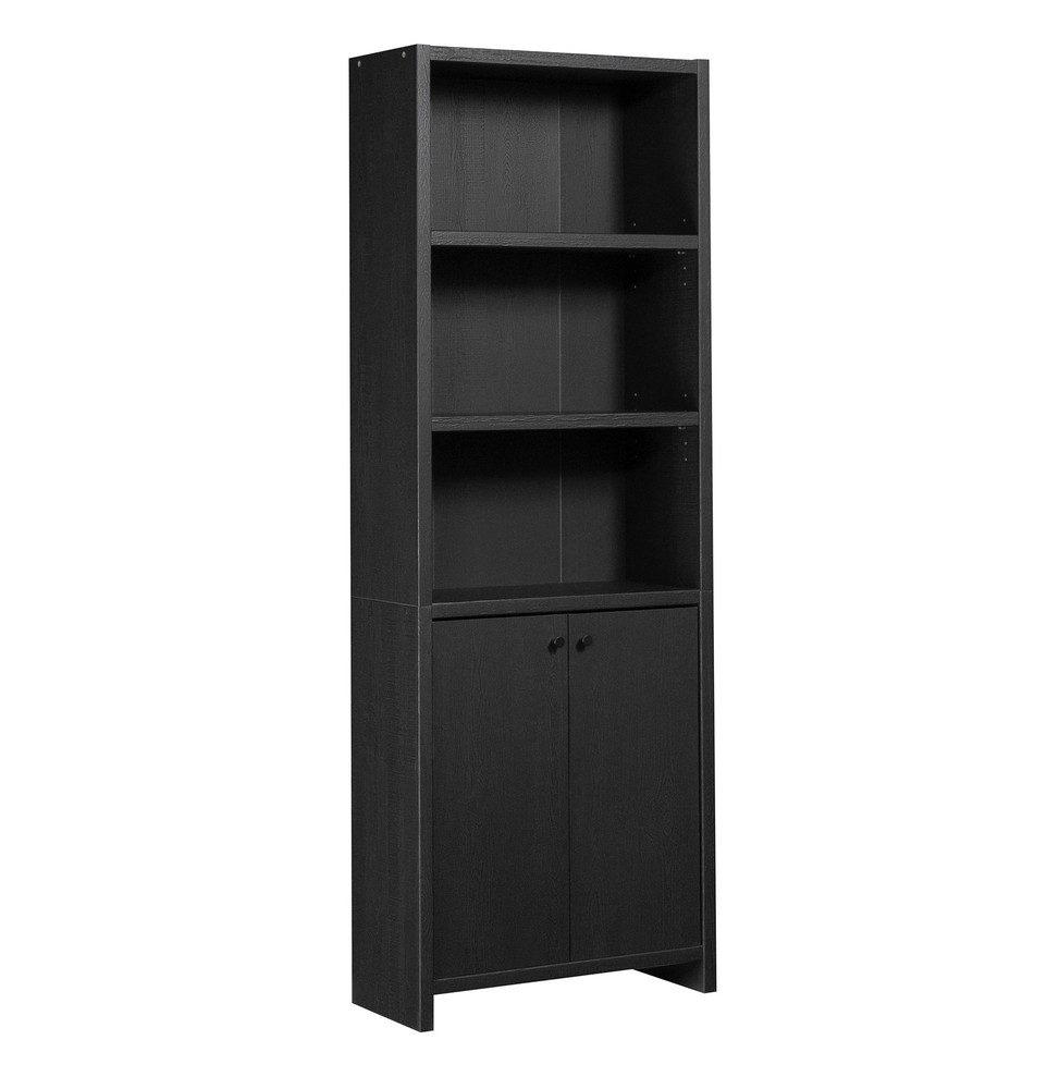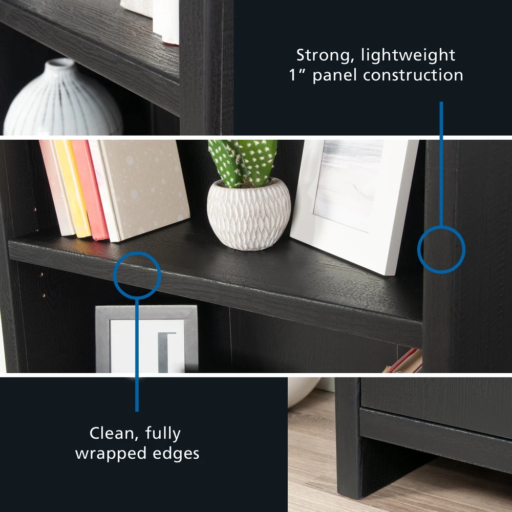 Infuse a touch of elegant style into your home with the 5-shelf bookcase from the Mainstays Westley collection, in a sleek, black wood . This versatile bookcase with doors seamlessly blends functionality with a timeless design, featuring three adjustable shelves that can be customized to accommodate collections of all shapes and sizes. This transitional style bookcase retains its outward appeal while concealing storage space below, with an adjustable shelf for added convenience. This discreet space offers a haven for tucking away clutter or storing seasonal items, maintaining a clean and organized living environment. Whether you're showcasing a children’s library, a collection of cookbooks, or organizing office supplies, this display bookcase caters to a wide variety of needs. With its strong and lightweight 1-inch panel construction, this 5-shelf bookshelf effortlessly combines transitional and neutral style with practicality and charm, seamlessly integrating into any living space. This bookcase with doors will elevate your home decor, making a bold statement that complements and enhances your living space. Assembled Dimensions: 25.83" L X 11.58" W X 72.68" H Strong and lightweight 1” panel construction ensures durability without compromising style Hidden storage behind doors to conceal clutter Three adjustable shelves for flexible storage options Model #: 437256 Box Dimensions: 59.84" L x 15.00" W x 7.60" H