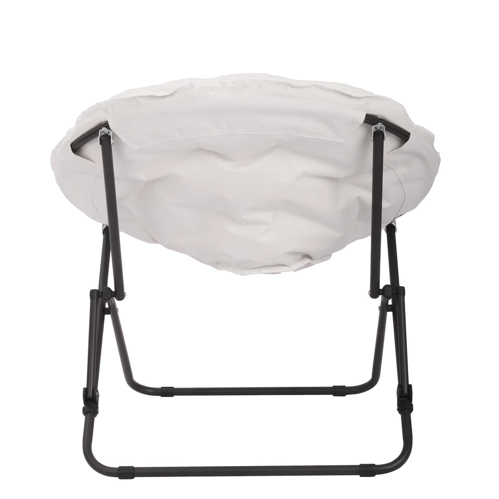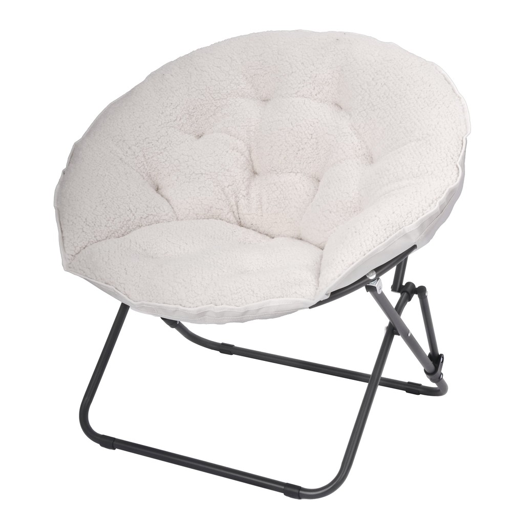 Kick back and relax with the Mainstays Saucer Chair in Sherpa for kids and teens. Decked out in extra soft velvet fabric, this foldable accent chair is the stylish solution for any time, anywhere comfortable seating. This smart folding chair features around, channel-tufted backrest and cushy, wide seat for cocoon-like comfort while sitting. The easy-to-move chair features a simple, foldable design that makes it easy to carry around, perfect for everyday use in small-space dorms or apartment living. Whether you are looking for extra seating in your bedroom, living room, or dining space, this versatile saucer chair will easily become your favorite sitting spot. And when you need extra floor space, this padded folding chair is easy to store. Add convenient comfort and style to any space with the Mainstays Folding Shell pattern Saucer Chair in Teal Velvet. Available in multiple colors: Blush and Teal. Folds for easy storage and transport Portable seat with soft Ivory Sherpa fabric cushion for teens and kids Durable powder-coated steel frame Easy to carry Collapsible for compact storage Chair Care: Spot clean only. Air dry. Do not bleach Overall dimensions: 31in W * 27.95" D * 28.74" H Weight: 11.24 lbs Weight Limit: 225lbs Color: Off-white