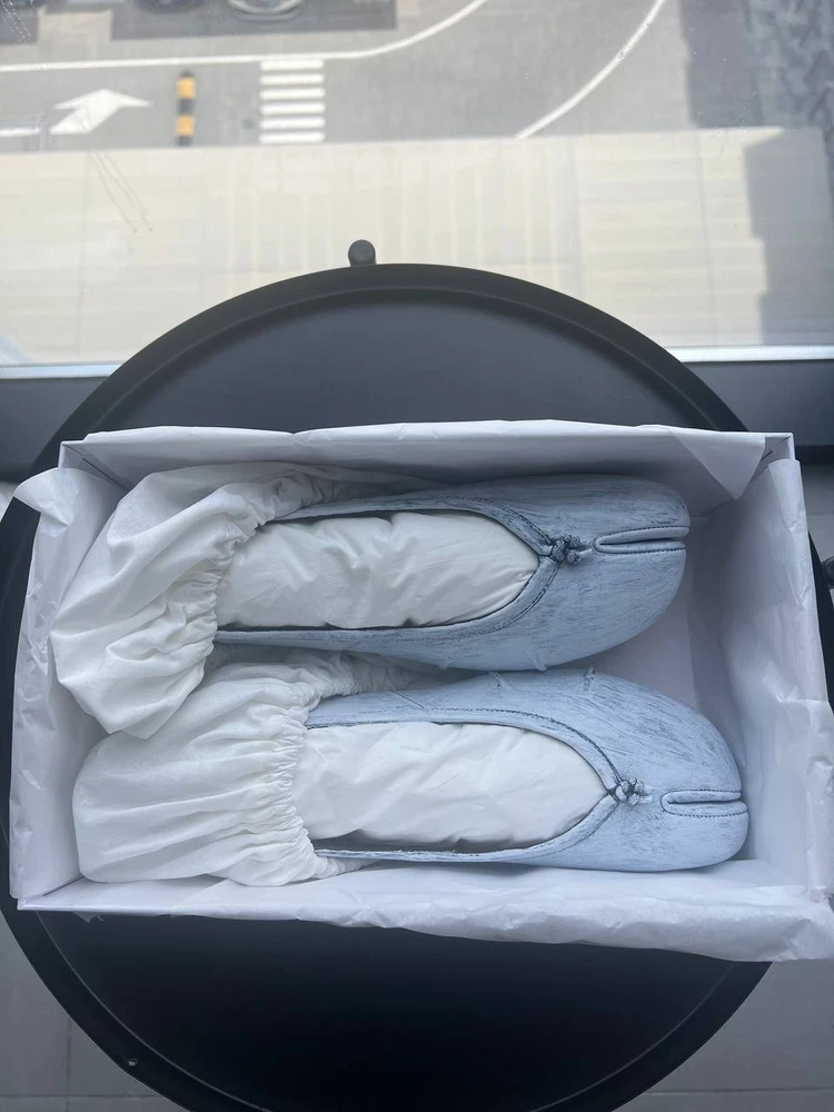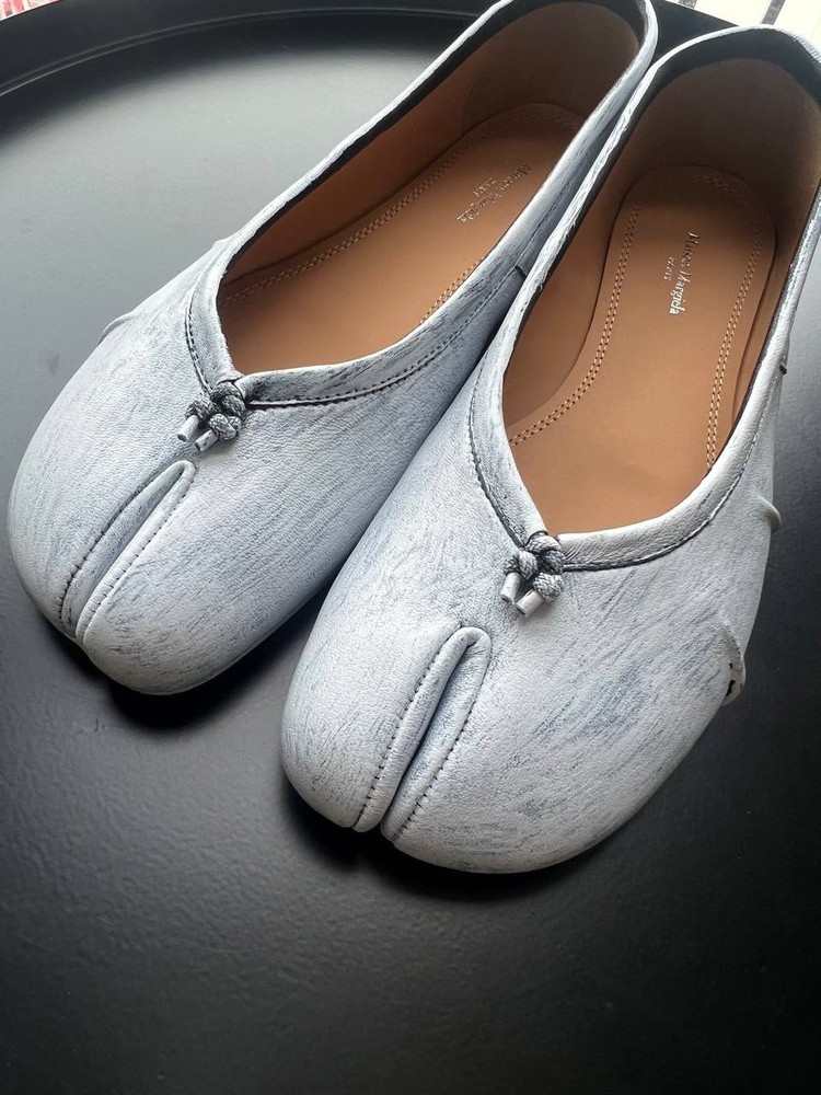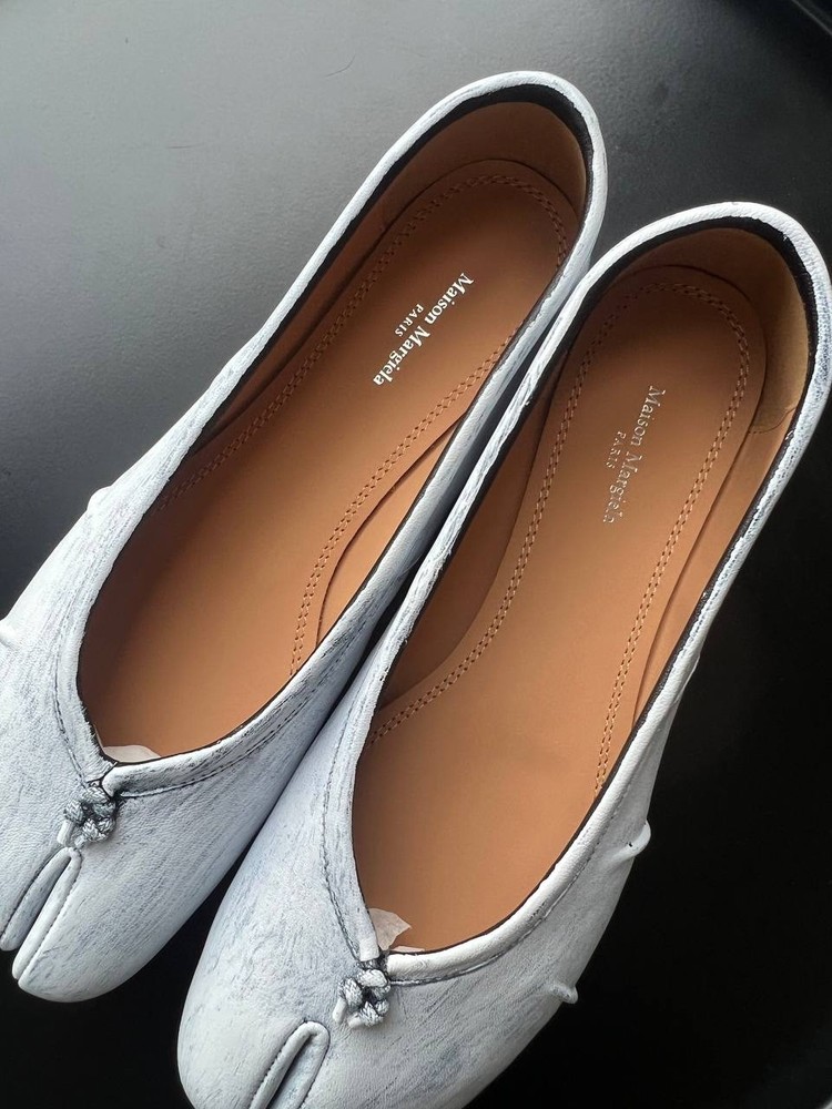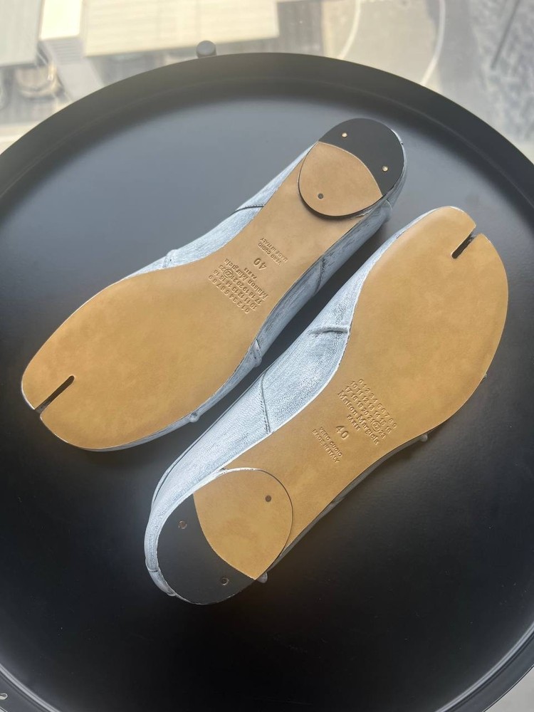Maison Margiela Tabi Flat Ballerinas – Black & White, Size 40 Step out in style with these iconic Maison Margiela Tabi flat ballerinas featuring the signature split-toe “Tabi” design inspired by traditional Japanese footwear. Crafted from premium black calf leather, these flats are elevated with a unique, hand-painted white pattern over the black base. Each pair is individually finished, making every shoe one-of-a-kind and highlighting Maison Margiela’s renowned artisanal craftsmanship. Product Details: Size: EU 40 (approx. 26 cm foot length) Color: Black with hand-painted white pattern Material: Smooth calf leather upper, leather lining and sole Signature split-toe design unique to Maison Margiela Slip-on style with elegant leather bow detail on the front White stitching detail on the back heel as a signature logo replacement Made in Italy Condition: New Shipping: Ships from the UAE. Fast and secure worldwide delivery available. Your order will be carefully packaged and dispatched promptly to ensure it arrives safely and quickly. These Maison Margiela Tabi ballerinas are perfect for fashion enthusiasts who appreciate bold, artistic design and exceptional craftsmanship.