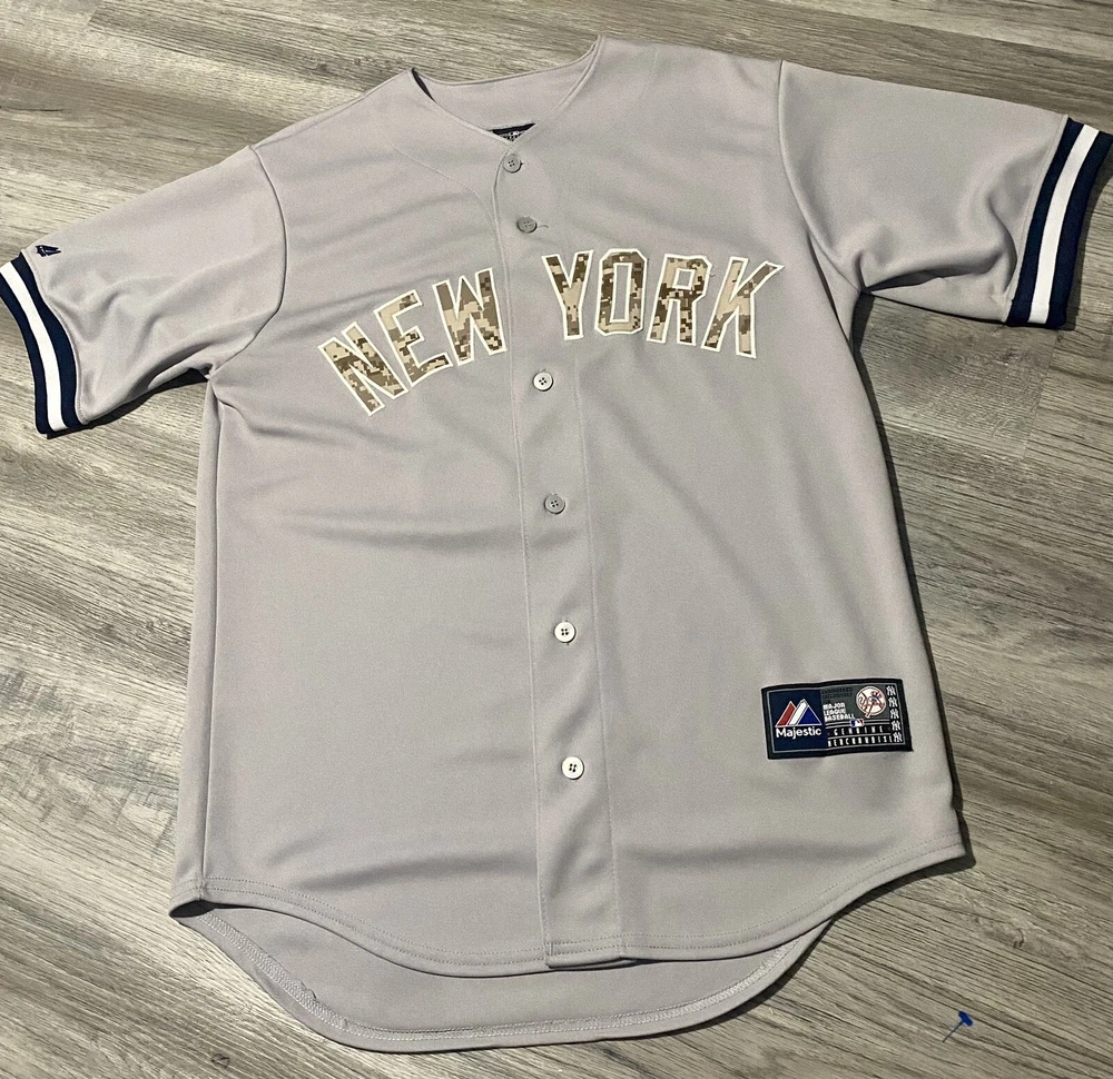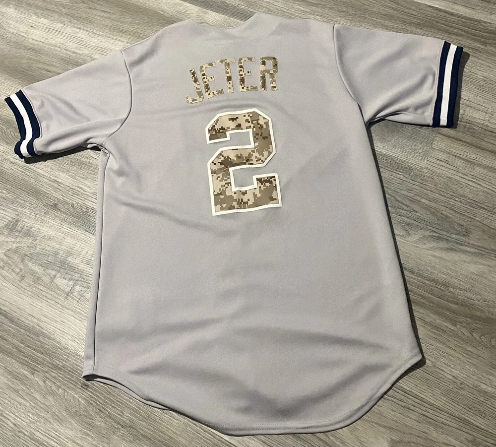 Celebrate one of the greatest Yankees of all time with this official Majestic Derek Jeter New York Yankees jersey. This unique jersey features a digital camouflage pattern , honoring military service members and adding a stylish twist to the classic Yankees design. Player : Derek Jeter (Retired #2) Team : New York Yankees Size : Men's Medium (M) Brand : Majestic (officially licensed MLB merchandise) Design : Digital Camouflage Edition Features : Button-up front, Yankees logo on chest, Jeter's name and number on the back Material : High-quality, breathable fabric for comfort Condition : Used (Thrifted) This jersey is perfect for any Derek Jeter or Yankees fan, whether you're adding to a collection or wearing it on game day. Don’t miss out on this limited edition, stylish tribute to the Captain!