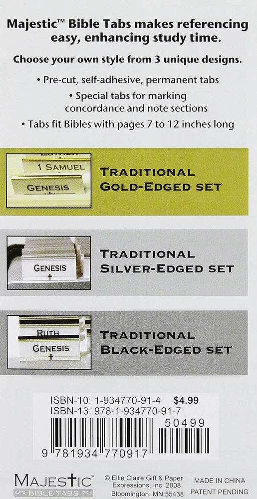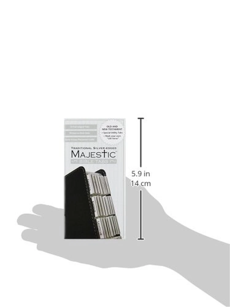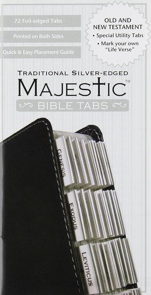 Traditional Silver-Edged Bible Tabs Set Perfect for those who carry their Bible with a sense of style. Silver foil edges are a visually pleasing way to find favorite Scriptures. 72 white foil-edged tabs for Bible from 7 inches up to 12 inches. Set includes: Old and New Testament tabs, special notation tabs and a Life Verse tab. Tabs are printed on both sides, come with a quick & easy placement guide and are placed in a compact 3.25" x 6.25" package that can either hang on a hook or stand on a counter.