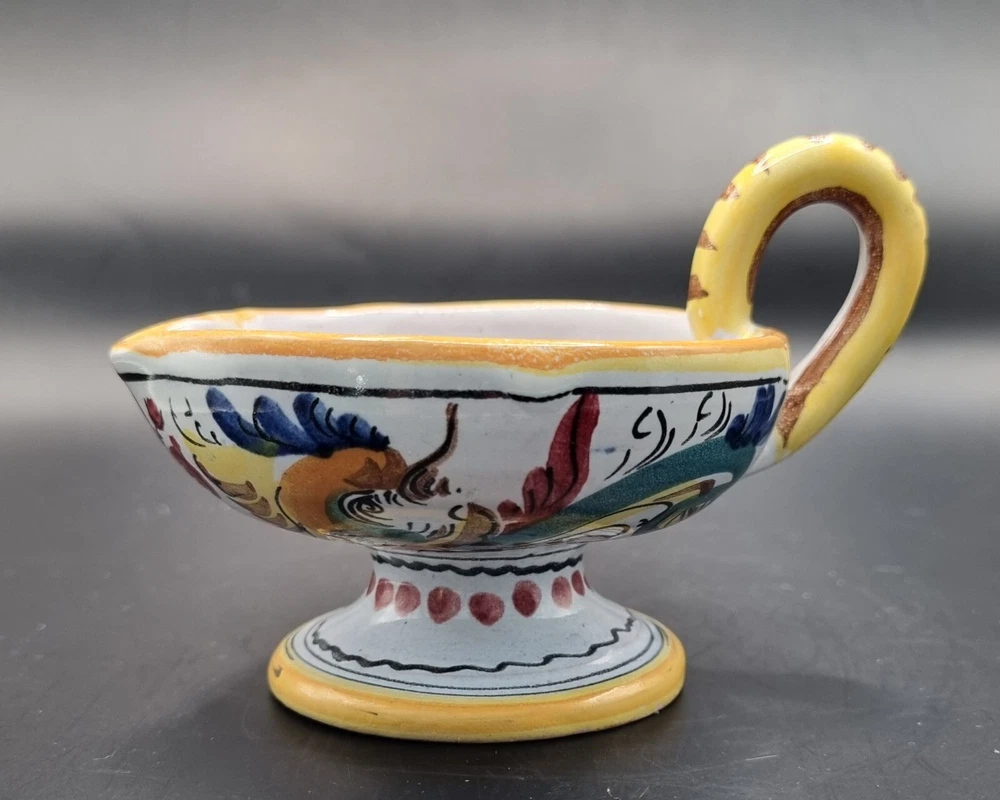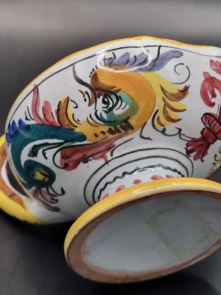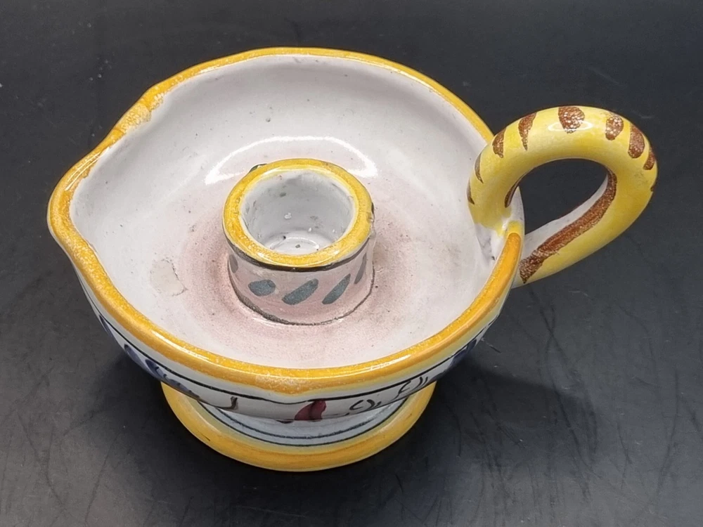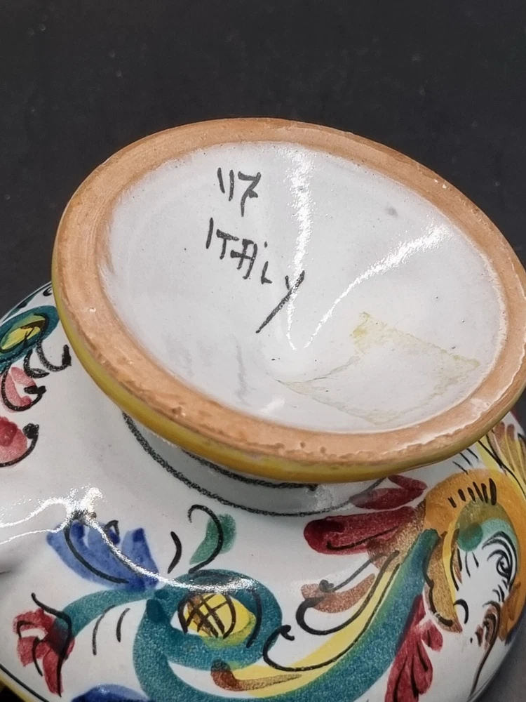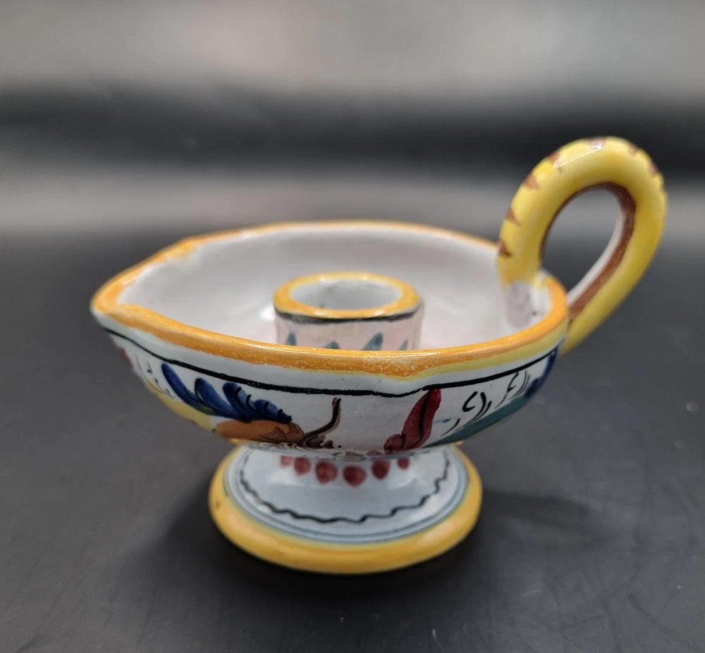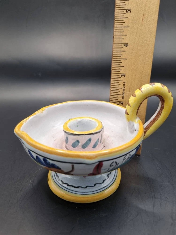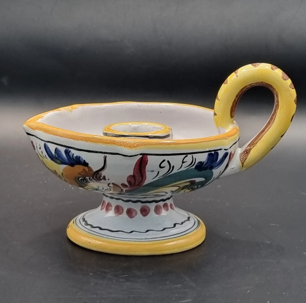 Suitable For: Taper/Dinner Candle, Votive Candle Production Style: Majolica Country/Region of Manufacture: Italy Brand: Majolica Origin: Italian Color: Multicolor Model: Majolica Daruta Vintage: Yes Theme: Italian Production Technique: Pottery Material: Ceramic Subject: Hen & Rooster Type: Candle Holder Finish: Glossy Backstamp: Painted Handmade: Yes