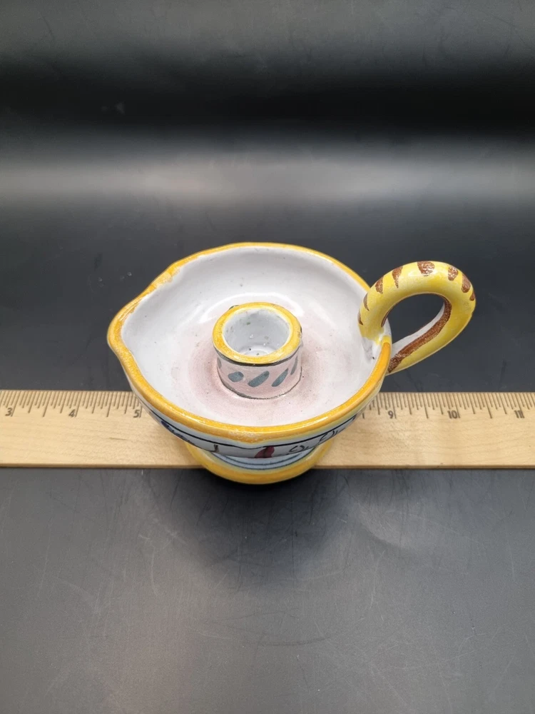 A lovely Majolica candle holder in excellent condition without chips or cracks. Not sure if the design is a rooster or a dragon, but the colors are bright and clear. It is signed just "Italy" but it is very much the style of Deruta pottery. Measurements are in the photos. All measurements are approximate. I do not accept returns, so please message me with questions or for more pictures. Shipping is continental U.S. only. Before leaving negative or neutral feedback, please contact me. I strive to be painfully accurate with my descriptions and photos, and I am happy to answer questions or provide more photos before you purchase something. Thank you for looking ❤️ and be sure to check out my other listings. While I have just started selling on eBay, I have been buying on eBay for years 😊 and am an experienced Etsy seller. My Etsy store (12HoursofDarkness) has 5 stars and over 300 sales.