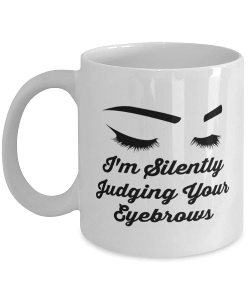 Makeup Artist Funny Coffee Mug I'm Silently Judging Your Eyebrows - White Mug Product Details.. This high quality 11oz. ceramic white mug has a premium hard coat that provides crisp and vibrant color reproduction sure to last for years. Perfect for all hot & cold beverages. The highest quality printing possible is used. It will never fade no matter how many times you wash it. Material: 100% Ceramic. Print both sides. Dishwasher and Microwave Safe. High Gloss + Premium White Finish. Printed in the U.S.A. Personalized & Custom. We support personalized and custom mug to add custom, when placing an order, you can add notes to the "order note" in shipping address section. Also you can contact us directly via message. Shipping Info. Ready to ship in 1 to 2 business days, All products are made-to-order and proudly printed in the United States. Shipped by USPS and DHL, You will receive your order in 5-7 days. Replace & Refund. All products are defective during shipping broken, chipped will be replaced free of charge. You are not satisfied with the product, we will refund 100% money to you. If any other issues arise, please do not hesitate to message, we would be more than happy to assist you.