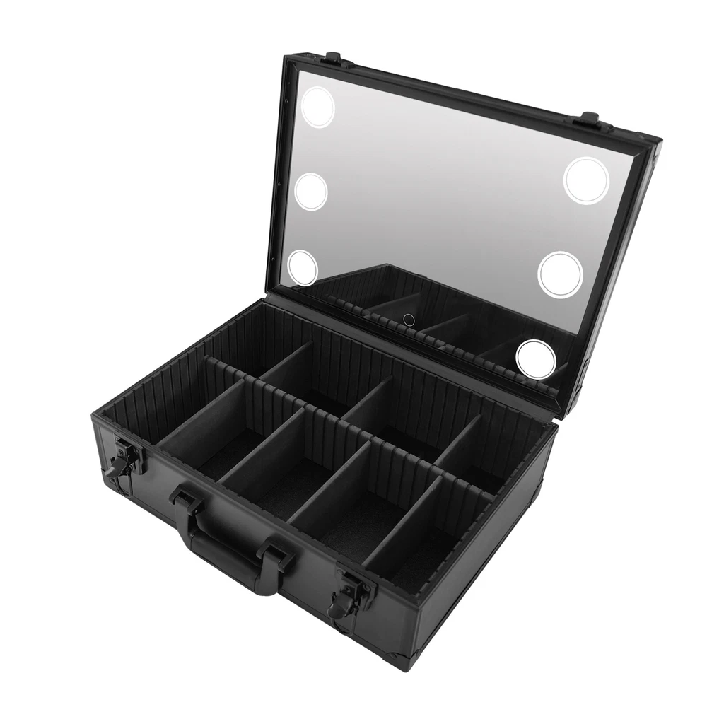 Makeup Bag with Mirror LED Light Travel Makeup Case Cosmetic Box Organizer Black Large Makeup Train Case Jewelry Box Cosmetic Artist Organizer w/ Light & Mirror Description As a qualified professional makeup case maker, we not only consider its beauty but also a lot of details for consumers. We go out to do makeup without a mirror and the cosmetics are not convenient to carry, so we designed a product that integrates makeup storage and an intelligent makeup mirror. Come check our products out! Key Features High-quality Materials: This product is made of high-quality PVC and aluminum alloy, which is strong, durable, and not easy to deform. The PVC material is fireproof . Beautiful Appearance: The black color, as well as the classic design, makes it look beautiful. Adjustable Color and Brightness: You can adjust the cold light, warm light, and natural light as well as the infinite brightness through the touch screen switch on the mirror to meet your preferences and needs. Large Storage Space: The size of this product is 16.5*11.8*5.9inch and it comes with adjustable dividers, allowing you to customize the layout to place your makeup essentials. Meanwhile, the compartment bag can hold a lot of cosmetic brushes, eyeliners, eyebrow pencils, etc. High Safety: The built-in charge protection system automatically limits current when fully charged, so you don't have to worry about overcharging. You can also use the light while charging it. Long Endurance: The battery has a capacity of 2000mAh and can last for 3-5 hours on a full charge, making this product suitable for outdoor use without frequent charging. Strong Load-bearing Capacity: The thickened materials and rectangular structure make it have a strong load-bearing capacity of 7kg/15lbs, so you can feel free to put most of your cosmetics on your business trip or travel. Convenient to Carry: The size of this product is 16.5*11.8*5.9inch and it only weighs 3kg/6.6lbs, so it's lightweight and compact. Meanwhile, the top handle makes it easy for you to carry. A Good Gift: The beautiful appearance and good practicality make it a good gift for professional makeup artists, beauty masters, and traveler lovers. Easy to Clean: The surface of this product is smooth and flat, which is easy to clean. You just need to wipe it with a wet rag. Guaranteed Customer Service: We aim to provide quality products and services. If you have problems, please feel free to contact us. We will reply and solve the problem for you as soon as possible. Details USB Slot: It comes with a USB slot, so you can charge it using a charger and mobile power supply. It's perfect for makeup artists to use outdoors. LED Light: The 6 LED lights on the mirror can enhance the view and make your makeup clearer. Meanwhile, LED light can save you a lot of electricity. The soft light transition technique makes the lighting very uniform. Indicator Light: The indicator light turns red when the product is charging and turns green when being fully charged, allowing you to better observe the condition of the product. Detachable Partition: You can adjust the position of the partition according to the volume and shape of the cosmetics, keeping the cosmetics in order at all times. Application It is suitable for storing cosmetics, jewelry, electronic accessories, essential oil, toiletries, shaving kit, and valuable objects in homes, hotels, beauty salons, etc. The Led lights can be applied in low-light environments. Specification Color: Black Material: PVC, Aluminum Alloy Shape: Rectangular Style: Modern Numbers of Compartments: 9 Load-bearing Capacity: 7kg/15lbs Type: Portable Light Source: LED Light Number of LED Lights: 6 Fully Charged Time: 3-5h Light Colors: Cold Light, Warm Light, Natural Light Power Type: Plug-in, Built-in Lithium Battery, Mobile Power Supply Battery Capacity: 2000mAh Color Temperature: 3500K. 4600K, 6500K Brightness: Infinitely Adjustable Operate Mode: Touchscreen Net Weight: 3kg/6.6lbs Gross Weight: 3.2kg/7.05lbs Package Size: 40.6*31.8*20cm/15.9*12.5*7.8inch Product Size: 42*30*15cm/16.5*11.8*5.9inch Mirror Size: 39*27cm/15.4*10.6inch Package Included 1* Makeup Case 1* Compartment Bag 1* Power Cord Notes Please allow the slight color difference caused by the shooting light and 1-3cm error due to manual measurement, and make sure you do not mind before ordering. Payment Delivery details Terms of sales About us Contact us Payment We accept ebay payment 。 Fees such as import duties, taxes are not included in the item price or shipping costs. These charges are the buyer's responsibility. Delivery details Shipping: 2-9 working days to: USA Terms of sales We maintain high standards of excellence and strive for hundred percent customer satisfaction. Feedback is very important to us. We hope that you contact us immediately before you give neutral or negative feedback, so that we can address your concerns. It is impossible to address issues if we do not know about them! About us Your satis faction is our ultimate goal. We work hard to earn your trust and future business. Our certified technicians have tested each item before shipping. The unit comes with 1 year limited warranty on all manufacturing defects. a) If you receive a defective item, you may return it or ask for a discount. Please contact us within 14 days after you receive the package. b) What you returned must be intact and in its original packaging as re? u. Customer is responsible for shipping costs of the returned item. c) We will cover the cost of shipping back t with the shipping rate indicated in the registration page. We will send you a new unit or refund the full payment you paid. Thank you. Contact us Business Hour Business Hour: Monday To Friday: 8:30 AM to 5:00 PM (Beijing China time) Due to time zones, our reply to your questions may not be immediately. But within above working time, we will reply your email within 24 hours. If it's non-workdays, please kindly be patient and wait till Monday. Please contact u