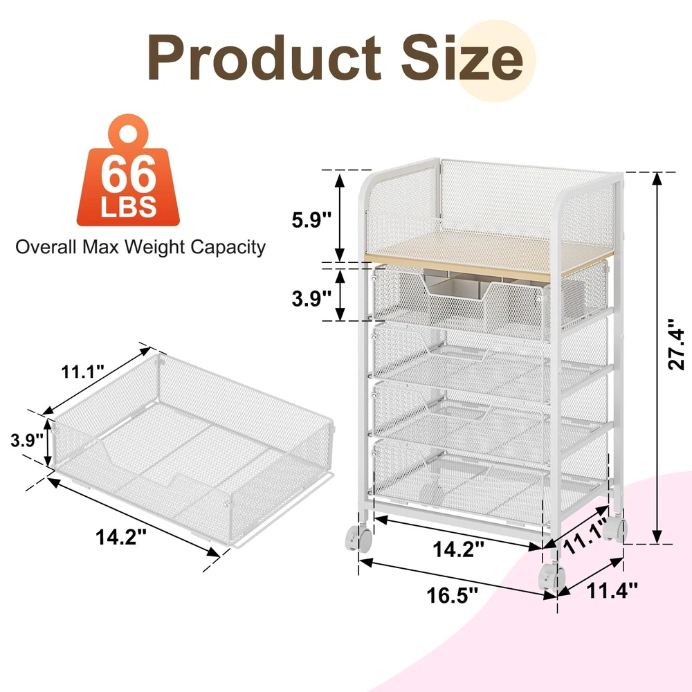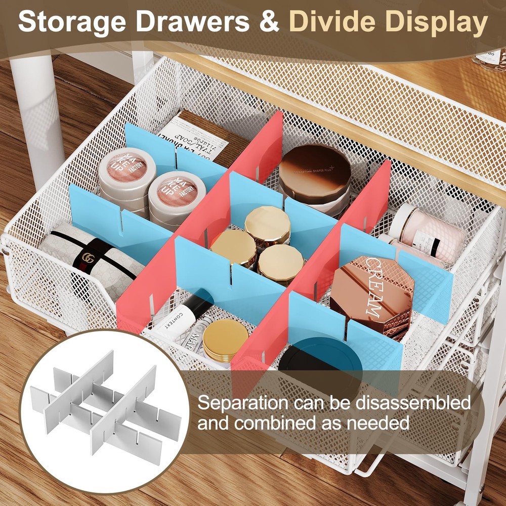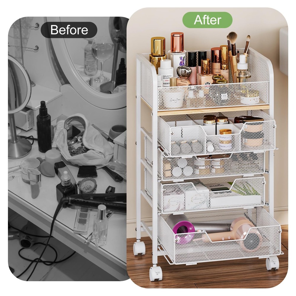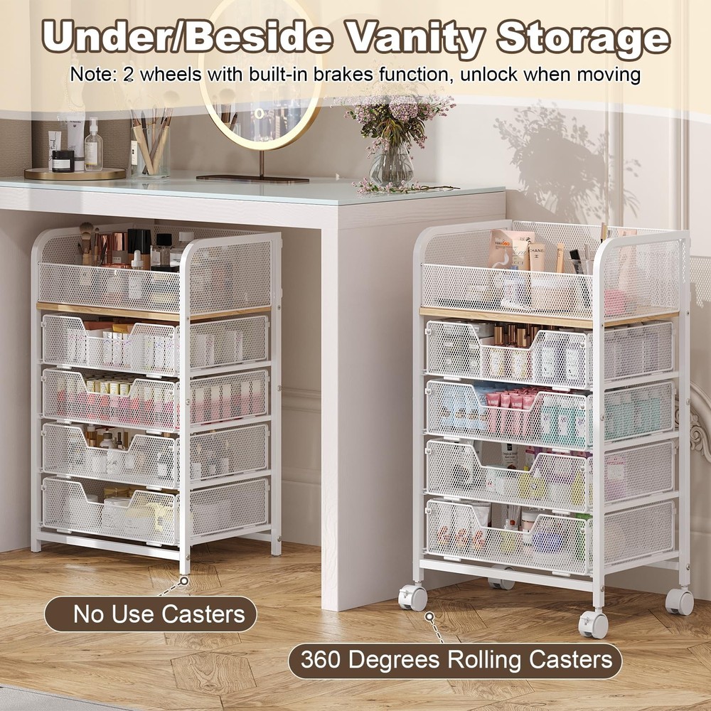 Makeup Cart Organizer with 4 Drawers, Large Floor Skincare Organizers, Vanity Storage Organizer Cosmetics Display Cases for Skin Care Perfume Nail Polish, White (Patent Pending) Large Capacity: This makeup cart with wheels is designed as open space and four storage drawers. The top display table for holding makeup brushes, cleansers, lotion; four big drawers can store combs, straightener, facial mask, and more Classified Storage: The rolling makeup cart has two drawers with dividers can be categorized to store lipsticks, perfumes, and nail polishes. Depending on the size of the items, the dividers can also be freely combined and separated into different space areas Mobile & Fixed Use: Rolling on four 360° swivel casters, this skin care organizer can be moved freely. Built-in brakes on front two casters help to keep it in place. Makeup brush organizer can also be placed underneath dressers with the wheels removed Multifunctional Storage Cart: This makeup cart with drawers can be used in a variety of scenarios. You can place it in the bathroom or next to the vanity to keep skincare, cosmetics, hair tools and more organized. You can also place it in the living room, den, etc Quality Materials & Easy to Assemble: Made of enhanced durable MDF and thickened steel, the hair tool storage can hold up to 66 lbs, each drawer can hold up to 11 pounds. Package includes illustrated instruction and parts have been labeled. You can be easily set this skincare organizers up in half an hour Perfect Customer Service: The Cosmetics Display Cases overall size: 16.5''L x 11.4''W x 27.4''H. If you have any concerns about this makeup storage cart with drawers, please don't hesitate to contact us, we will give you a solution within 24 hours