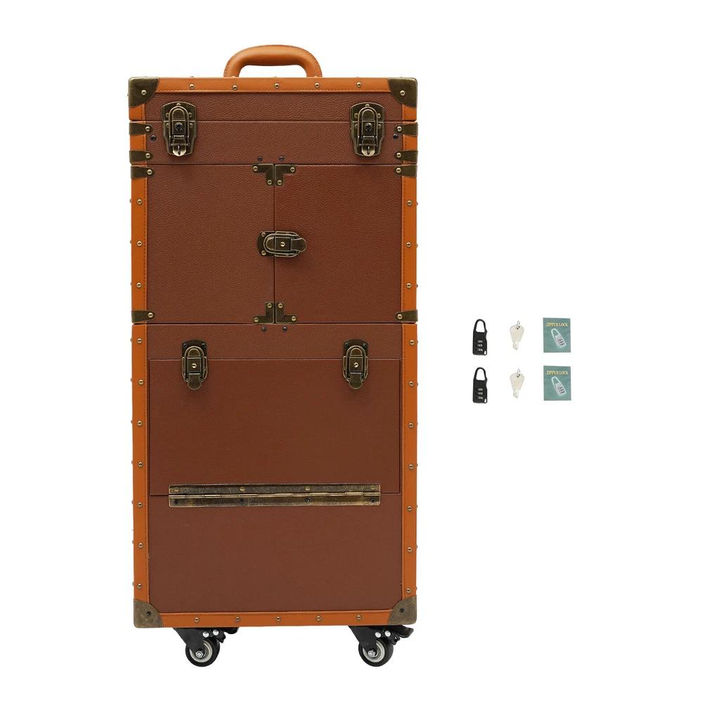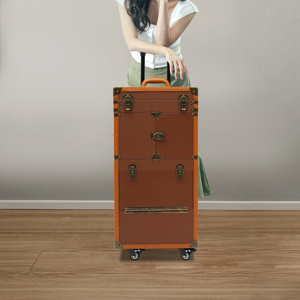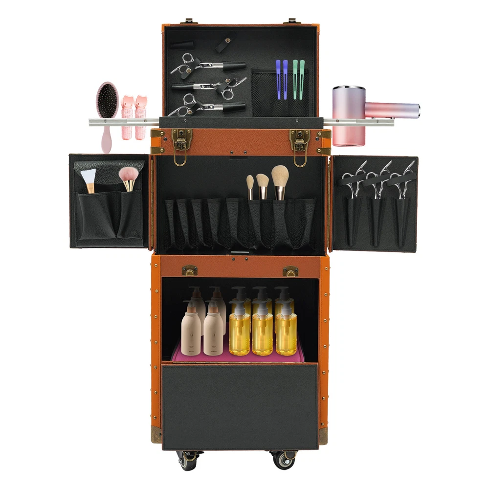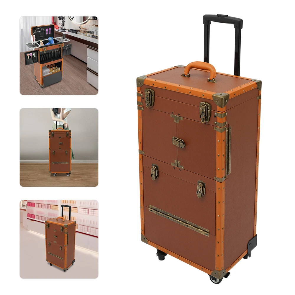 Make-up Case Hairdressing Case Cosmetics Organiser Trolley Case Makeup Box Description Are you still worried about the clutter of hair-styling tools scattered everywhere? Our hairdressing case can solve your troubles. High-quality materials make it sturdy and durable. The top scissor clip and mesh bag, the middle movable partition, the mesh bags on the side door, the layer board, and the bottom drawer allow you to classify and place your hair styling tools. The strong load-bearing capacity can meet your storage needs. In short, it is the ideal assistant for storing various hair or makeup tools! Key Features Premium Materials: This product is made of high-quality PVC , wooden boards, and hardware, which is corrosion-resistant , wear-resistant , and durable, ensuring your long-term use. Classified Storage: The top scissor clip and mesh bag can store scissors and combs(not included). The movable partition in the middle can be used to store hair dryers or curlers(not included). The mesh bags on the side door can be used to store clips and scissors(not included). The layer board can be used to place makeup bottles(not included). The bottom drawer can be used to store large volume makeup or hair styling tools(not included), keeping your items sorted and organized. Strong Load-bearing Capacity: High-quality materials enable this product to support a weight of about 33.07-44.09 lbs , allowing you to use it with confidence. Protect Your Privacy: Equipped with 2 mobile password locks and 2 keys, it can protect valuable items inside your box and maximize your privacy. Generous Appearance: The coffee color tone, rectangular shape, and smooth lines give this product a generous appearance, which is a great decoration for your hair salon. Easy to Use: The retractable rod length allows you to freely adjust the length of the rod, making it convenient for your use. Excellent Gift: Its exquisite design and large capacity make this product a great gift to your mother, girlfriend, sisters, wife, and loved ones so that they can enjoy more convenient makeup time. Simple Cleaning: The simple structure and smooth surface allow you to clean this product with a towel, which is simple. Details Durable Handle: The ergonomically designed handle can relieve finger pressure and provide you with a comfortable user experience. Buckle Design: It makes the door panel more sturdy and flexible. Universal Wheels: The bottom universal wheels with fixed device allow you to easily move and fix this product. Application It is suitable for manicurists, hairstylists, beauticians, makeup artists, and hair salons to store various tools. Specification Color: Coffee Color Shape: Rectangular Style: Modern Material: PVC, Wooden Boards, Hardware Assembly Required: No Product Size: 38*25*82cm/14.96*9.84*32.28in Load-bearing Capacity: About 15-20kg/33.07-44.09lbs Gross Weight: 11kg/24.25lbs Net Weight: 10kg/22.05lbs Package Size: 90*45*33cm/35.43*17.72*13in Package Included 1* Hairdressing Case 2* Mobile Password Locks 2* English Manuals 2* Keys Notes Please note that items other than this product are not included. The service wear of the case is a normal phenomenon. In the process of daily use, please try to avoid excessive impact and drop to extend the lifespan of the product. Please use soft tools and water to clean. Please keep away from corrosive liquids. Please avoid long-term exposure to the sun. Please check the size carefully before ordering. Please read the English manual carefully before use. Please use this product within its carrying capacity. Please allow the slight color difference caused by the shooting light and the 1-3 cm error due to manual measurement, and make sure you do not mind before ordering. Payment Delivery details Terms of sales About us Contact us Payment We accept ebay payment 。 Fees such as import duties, taxes are not included in the item price or shipping costs. These charges are the buyer's responsibility. Delivery details Shipping: 2-9 working days to: USA Terms of sales We maintain high standards of excellence and strive for hundred percent customer satisfaction. Feedback is very important to us. We hope that you contact us immediately before you give neutral or negative feedback, so that we can address your concerns. It is impossible to address issues if we do not know about them! About us Your satis faction is our ultimate goal. We work hard to earn your trust and future business. Our certified technicians have tested each item before shipping. The unit comes with 1 year limited warranty on all manufacturing defects. a) If you receive a defective item, you may return it or ask for a discount. Please contact us within 14 days after you receive the package. b) What you returned must be intact and in its original packaging as re? u. Customer is responsible for shipping costs of the returned item. c) We will cover the cost of shipping back t with the shipping rate indicated in the registration page. We will send you a new unit or refund the full payment you paid. Thank you. Contact us Business Hour Business Hour: Monday To Friday: 8:30 AM to 5:00 PM (Beijing China time) Due to time zones, our reply to your questions may not be immediately. But within above working time, we will reply your email within 24 hours. If it's non-workdays, please kindly be patient and wait till Monday. Please contact us with ebay message. Please feel free to contact us if you have any questions. Monday To Friday: 8:30 AM to 5:00 PM (Beijing China time) Due to time zones, our reply to your questions may not be immediately. But within above working time, we will reply your email within 24 hours. If it's non-workdays, please kindly be patient and wait till Monday. Please contact us with ebay message. Please feel free to contact us if you have any questions.