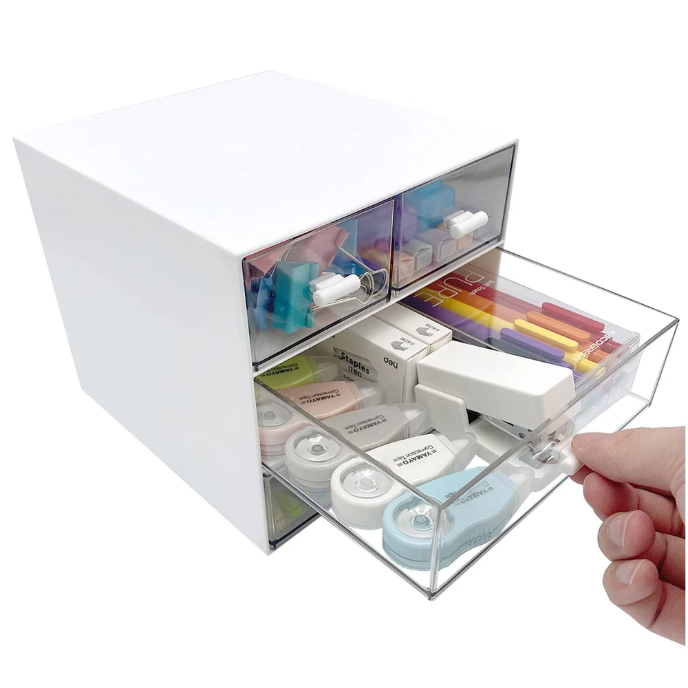 Material: Makeup organizer is made of ABS plastic. Easily Find What You Need: Makeup Organizer with 4 Transparent Drawers. Size: 6*6.6*5.7 inches. Versatile Design: This Desktop storage is not only perfect for storing your makeup brushes, nail polishes, Liquid Foundation, lipsticks and other small personal items but also great for storing your desktop stationery such as paper clips, pencil, scissors, binder clips and many other office supplies; you can put any other daily necessities on the Desktop storage. Widely Used: Fits Bedroom Countertop Bathroom and office, especially the makeup table.