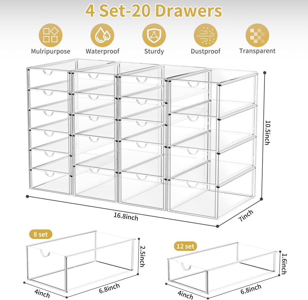 20 Drawers in 4 Sets : Each set includes 5 drawers, allowing you to organize a variety of items such as makeup, jewelry, art supplies, and office accessories. Clear Acrylic Design : The transparent material makes it easy to see the contents of each drawer, adding convenience and a modern aesthetic to your space. Stackable Design : The organizers are stackable, allowing you to create a vertical storage system that saves counter and drawer space. Multi-Purpose Organization : These organizers are designed to help you organize your vanity, countertop, craft supplies, jewelry, and more, making them a versatile addition to any room. Durable and Easy to Clean : Made from high-quality acrylic, these organizers are built to last and can be easily cleaned with a damp cloth. On Feb 5, 2025 at 18:27:35 PST, seller added the following information:
