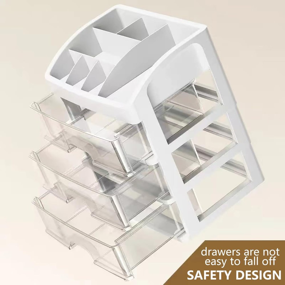 Perfect Design - There are 3 drawers and top multifunction partition. Large capacity to keep all your makeup, cosmetics, jewelry and accessories, organized and easy to find. Multi-Function - Multi-Function makeup organizer for vanity, table, countertop and desk. Works well in bathroom, bedroom, kitchen and dressing room. Display and Organize - Keep your makeup and accessories all in place, perfectly organized, and easily accessible. Reduce clutter, save time getting ready, and gain space. Sturdy and Easy Clean - Made of quality PP plastic, lightweight but sturdy. Easy to clean, wipe with warm water. 100% Satisfaction - The best service for you. Customer satisfaction is our top priority. Your purchase is fully protected when you ordered.