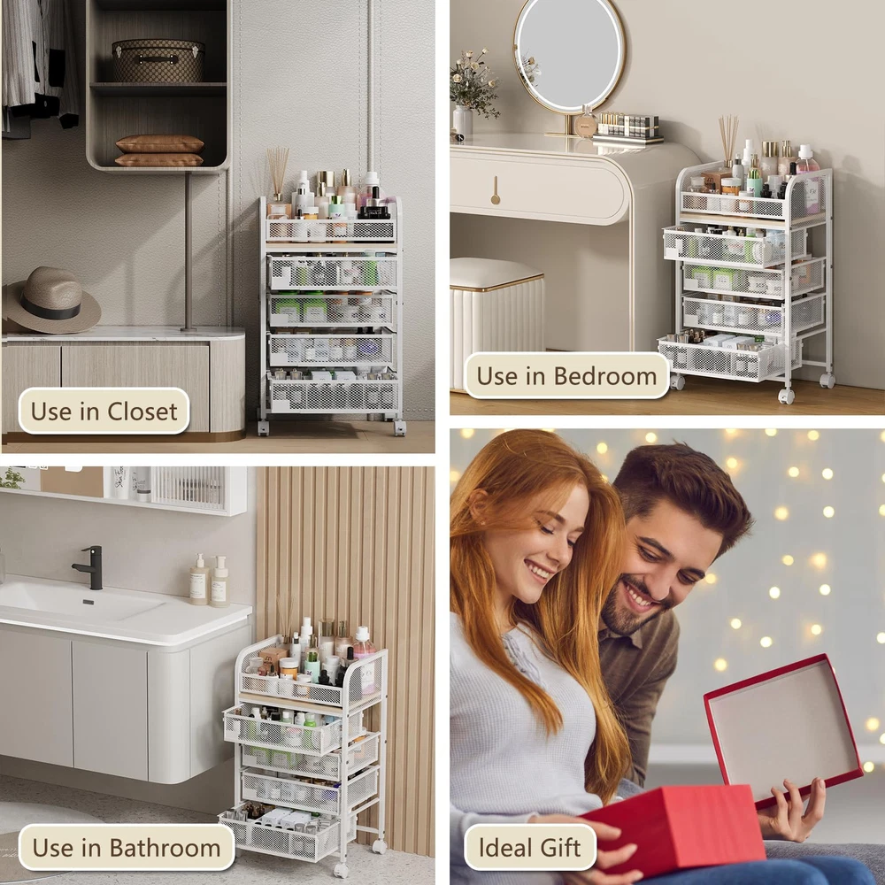 Features 5 drawers and an open top,perfect for brushes,lotions,etc.Dividers in drawers help organize lipsticks,perfumes,and nail polish.Adjust and combine spaces as needed to keep everything neatly arranged. Spacious & Customizable Storage - Features 5 drawers and an open top,perfect for brushes,lotions,etc.Dividers in drawers help organize lipsticks,perfumes,and nail polish.Adjust and combine spaces as needed to keep everything neatly arranged. 360° Swivel Casters with Brakes - Easily move this makeup cart around with four smooth-rolling casters.front wheels have brakes,allowing you to lock it securely by your vanity or sink,ensuring stability when in use. Versatile & Elegant Design - Ideal for cosmetics,skincare,and hair tools,this organizer also fits kitchens,living rooms,or laundry rooms.Its sleek, modern look enhances any space,keeping your home tidy and stylishly organized. Durable Materials & Easy Assembly - Built from strong MDF and reinforced steel,this cart holds up to 70 lbs.Each drawer supports 13 lbs.Includes clear instructions,and assembly is straightforward, taking only about 30 minutes to set up. Reliable Customer Support - Compact yet spacious at 16.3"L x 11.4"W x 35.9"H, this cart is backed by excellent service. If you need assistance, reach out anytime, and we'll respond with a solution within 24 hours,ensuring your satisfaction.