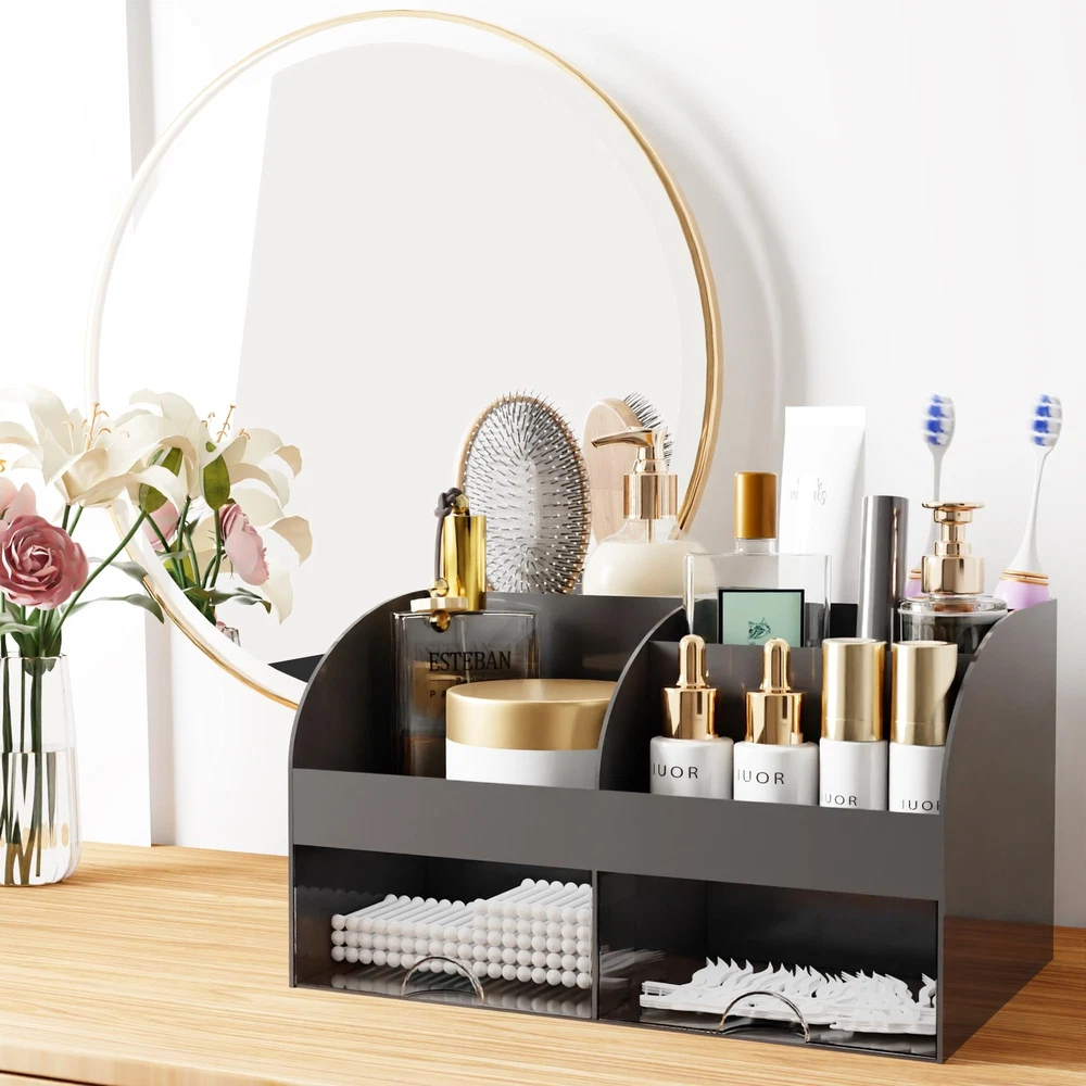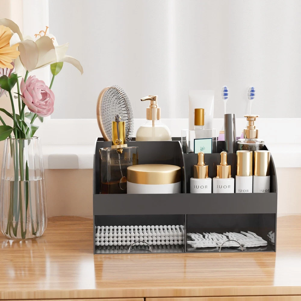 Makeup Organizer with Drawers, Cosmetic Storage for Dresser Vanity and Bathroom Countertop, Beauty Holder for Lipstick Brush, Skincare Organizer for Vanity, Cosmetic Display Case (Black) Multiple Storage Spaces: Small body with large capacity, great cosmetic storage countertop assistant contains 6 Sections and 2 drawers, different compartments allow you to place items according to your needs, transparent drawers allow you to quickly find what you need, easy to place and take, the perfect match can let you all the makeup accessories are neatly stored Premium Material: This plastic makeup organizer is made of high quality environmentally friendly ABS material, non-toxic and tasteless, the material is tough and especially durable, smooth edges, safe to use for long term Applicable Occasions: It can organize your dresser lotion, makeup brushes, lipstick, nail polish, mascara, eyeliners, small perfumes. Also great for organizing your bathroom supplies, such as toothbrushes, toothpaste, mouthwash, cotton swabs. also suitable for storing office stationery, such as calculators, notebooks, paper clips, pencils, scissors, etc Perfect Size for Desk: Perfectly sized, it serves as a bathroom or bedroom desktop organization for daily items, placing it doesn't take up much of the desktop surface, this organizer provides enough space to store your items for easy use and can keep your desk or dresser clean and organized Assured Shopping Experience: This desktop decorations organiser makes your office/ home/ school/ college dormitory desktop look more classy, it's the best choice for your own use or gift. If you have any questions, please contact us, we will be happy to serve you Shipping We offer FREE shipping on all orders! We ship within Three business days of payment, usually sooner. We use a selection of shipping services such as UPS, FedEx, USPS etc. We only ship to the lower 48 states, no APO/FPO addresses or PO Boxes allowed. Local pickups and combined shipping options are not provided at this time. Return You can return a product for up to 30 days from the date you purchased it. Any product you return must be in the same condition you received it and in the original packaging. Please keep the receipt. Feedback Customer satisfaction is very important to us. If you have any problem with your order, please contact us and we will do our best to make you satisfied. Contact Us If you have any queries, please contact us via ebay. We usually respond within 24 hours on weekdays. Please visit our eBay store to check out other items for sale! Thank you for shopping at our store.