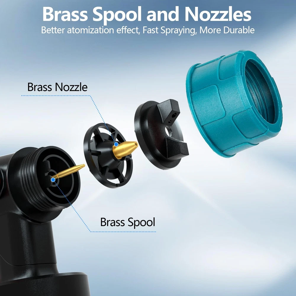 Product Features: Power: 200W Rated Voltage: 20V(Max) Motor Rated Speed: 42000rpm/min Spray Patterns: horizontal, vertical, orbicular Paint Tank Capacity: 1000 ml Applications: Suitable for wall painting, fence painting, door painting, window painting, metal painting, ceiling painting, car repairing, high-altitude operations, plant watering,etc. Care Instruction: Do not place the spray gun with the nozzle pointing upwards when it is out of use, or work upwards without releasing the switch to prevent the motor from being damaged by the backflow of paint. The spray gun should be cleaned in time after use to prevent the paint from solidifying and clogging the spray holes. Battery operated paint sprayer compatible with Makita 18v Batteries. Transform your spraying projects with ease and convenience with our wireless paint spray gun, no more worrying about cables not reaching your working area, enjoy a seamless painting experience. - Paint sprayer cordless for house painting comes with 4 copper nozzles to meet different needs, suit for painting tasks like cabinets, doors, furniture, fence, walls and other DIY projects. The copper nozzles outperform plastic in durability, clogging resistance and ease of cleaning. Nozzle sizes: 1.0mm, 1.8mm, 2.5mm(pre-installed), 3.0mm. - The paint sprayer gun equipped with 42000rpm brushless motor provides highly Efficient painting performance, faster and more convenient than brushes and rollers. - This paint sprayer gun features adjustable spray modes, horizontal,vertical and toggle the knob to adjust spray pattern from elliptic to round shape. Its adjustable flow control conveniently suit your needs. - This beginner friendly cordless paint sprayer is easy to assemble and clean, simple to operate. The suction tube can be switched for upward and downward operation. - This battery powered paint sprayer compatible with Makita 18V lithium ion batteries.(Battery Not Included). The HVLP paint sprayer built-in low voltage protection to protect your Makita battery.